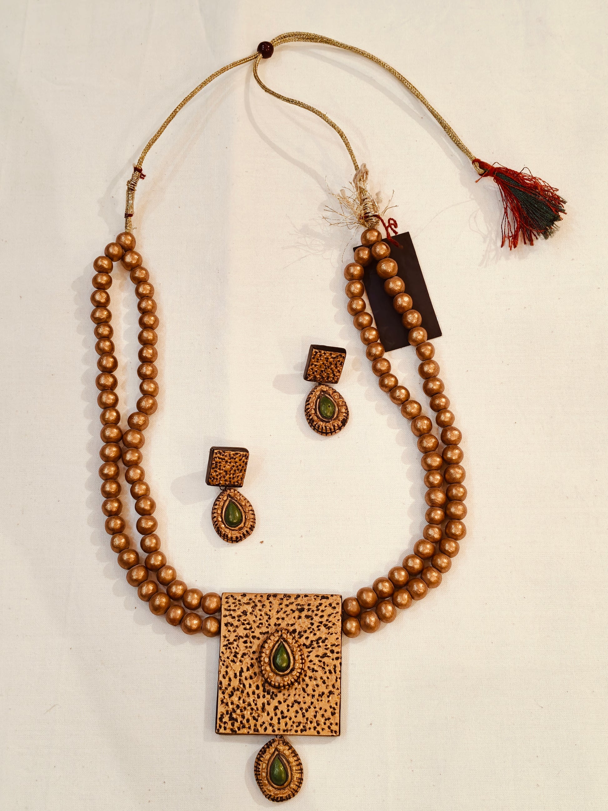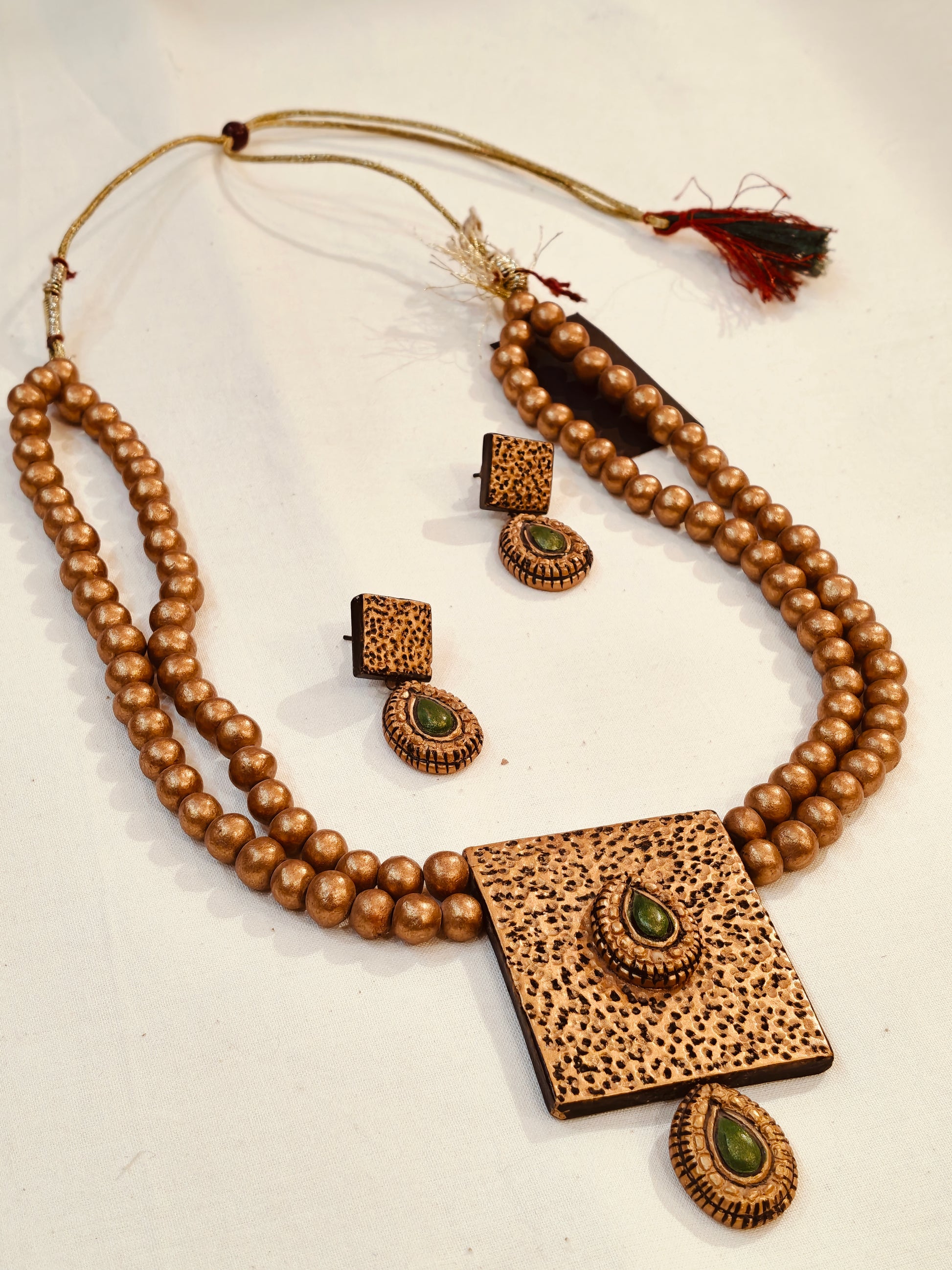 2 layered golden terracotta beads with green accents neckpiece, earrings set