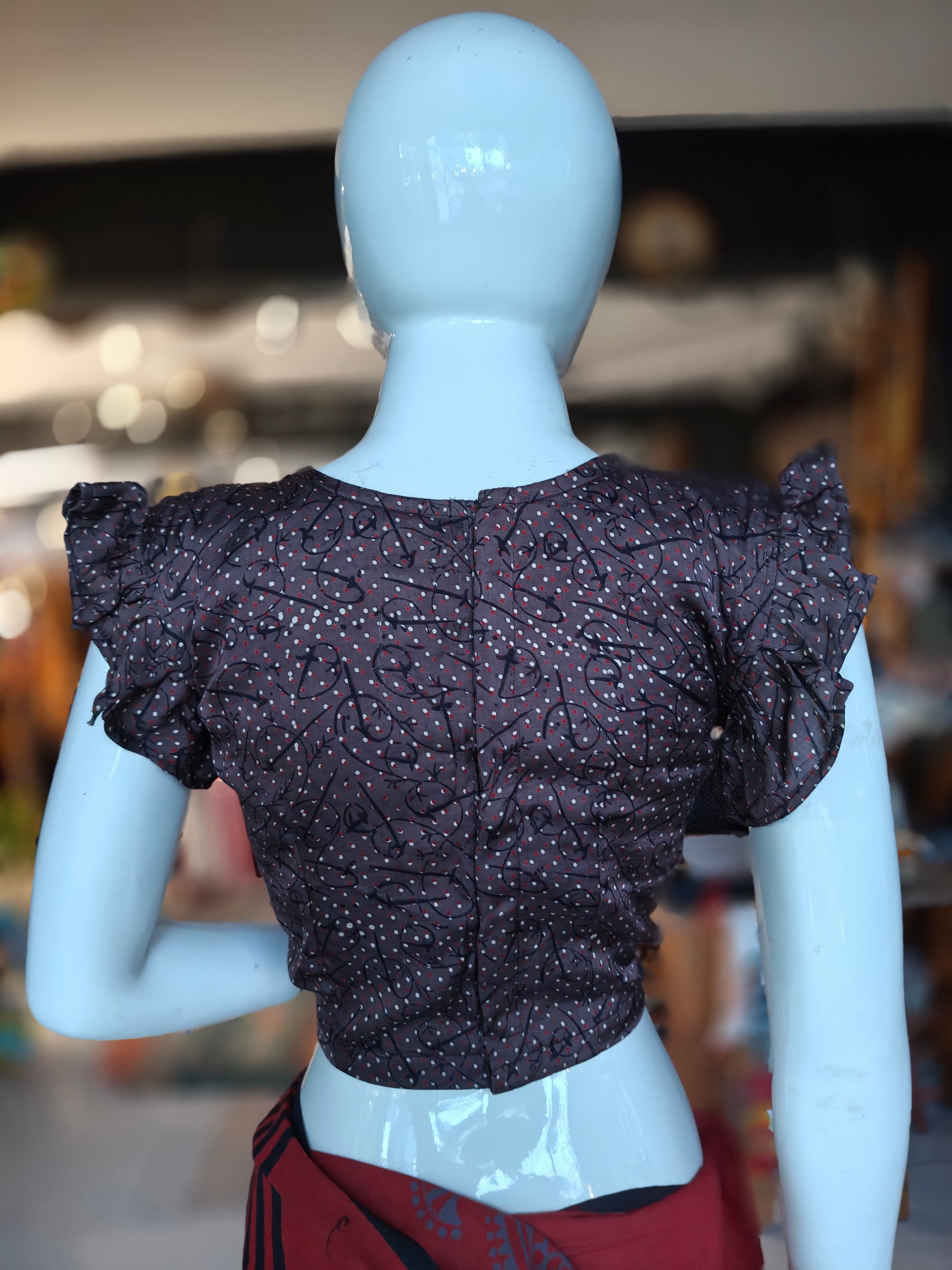 Aubergine shade hand block printed modal frilled sleeves blouse