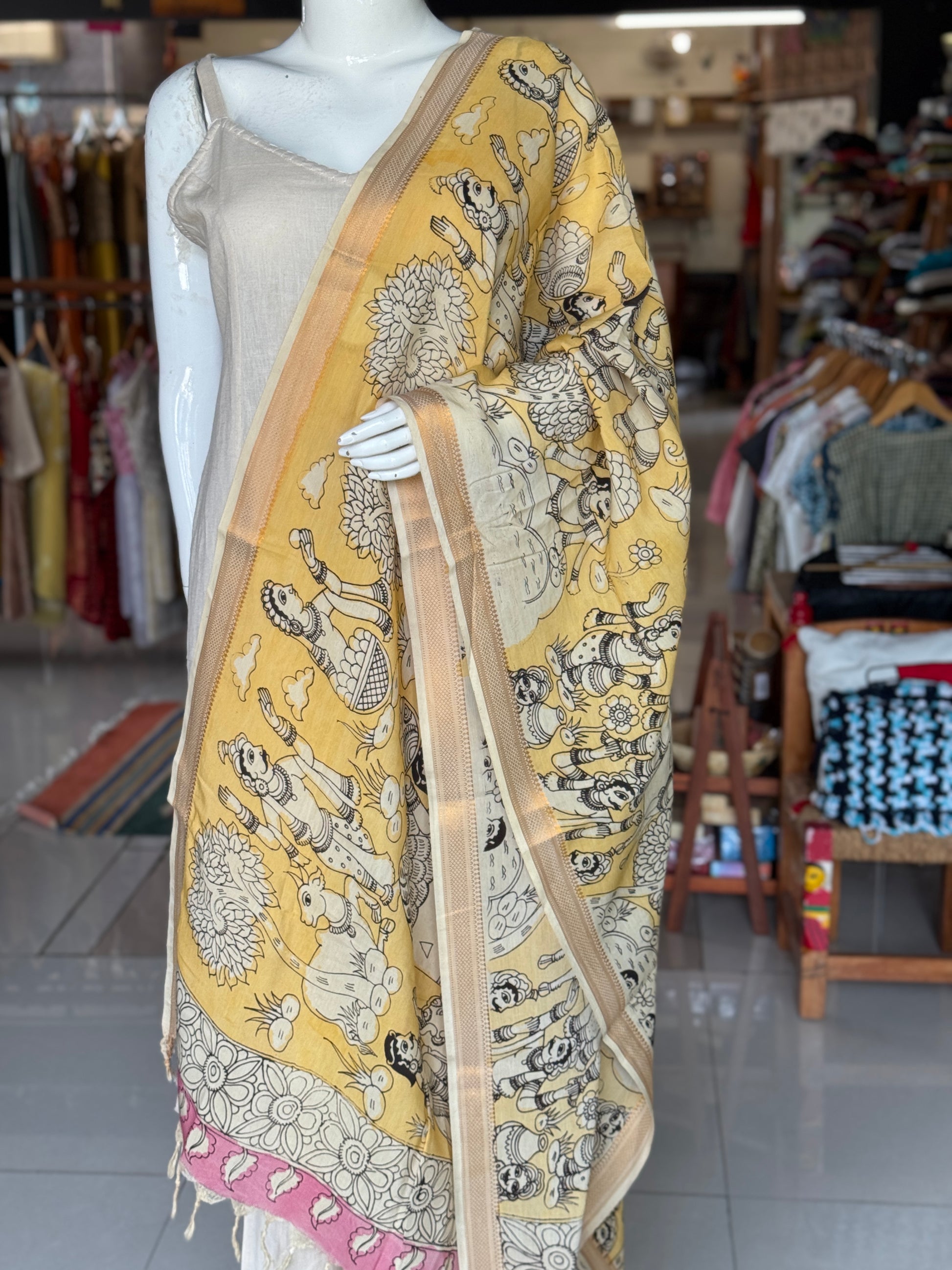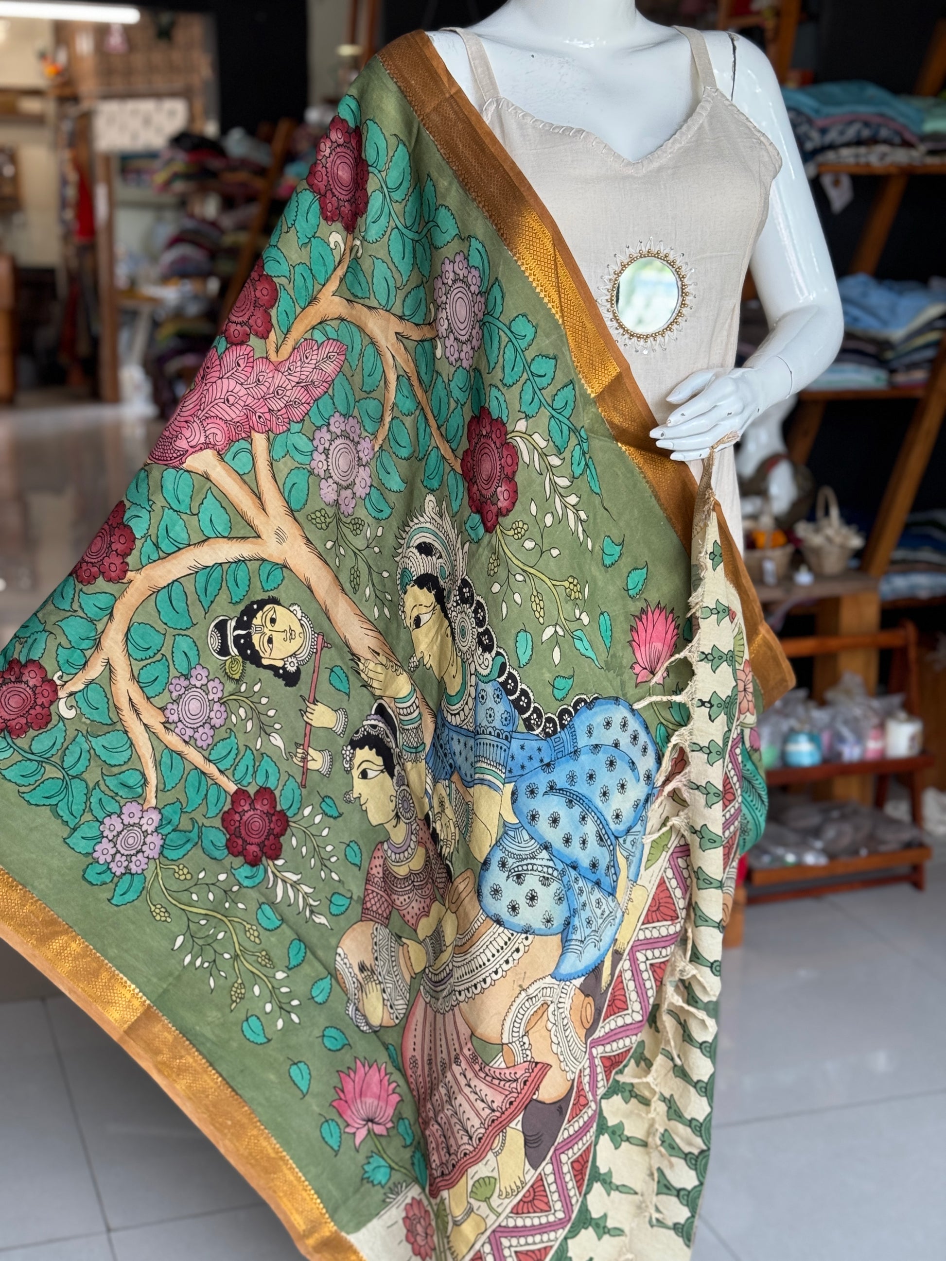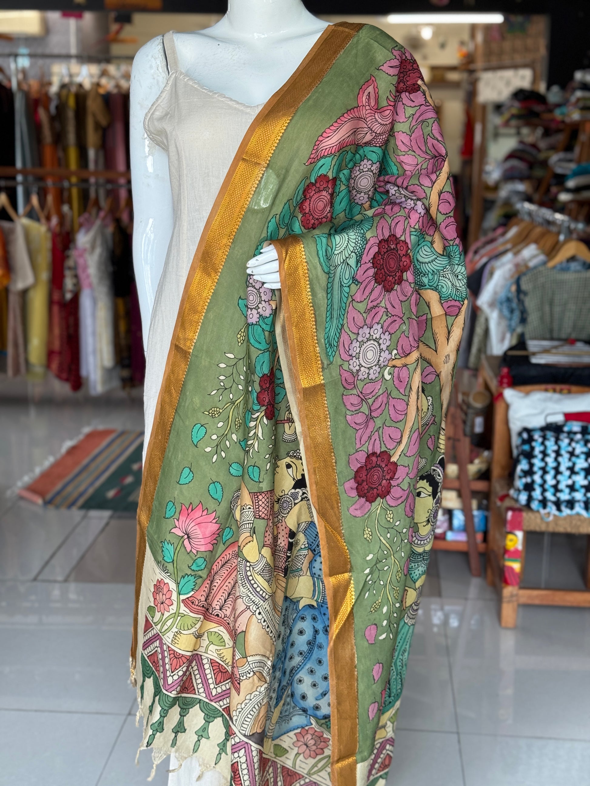 Bangalore Silk hand painted floral pen Kalamkari dupatta
