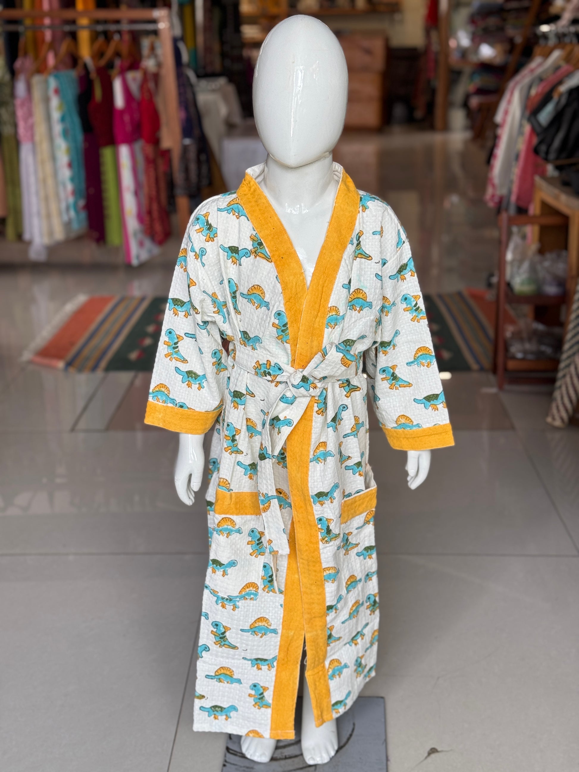 Make bath time fun time for your little one with these lovely hand printed cotton bath robes.