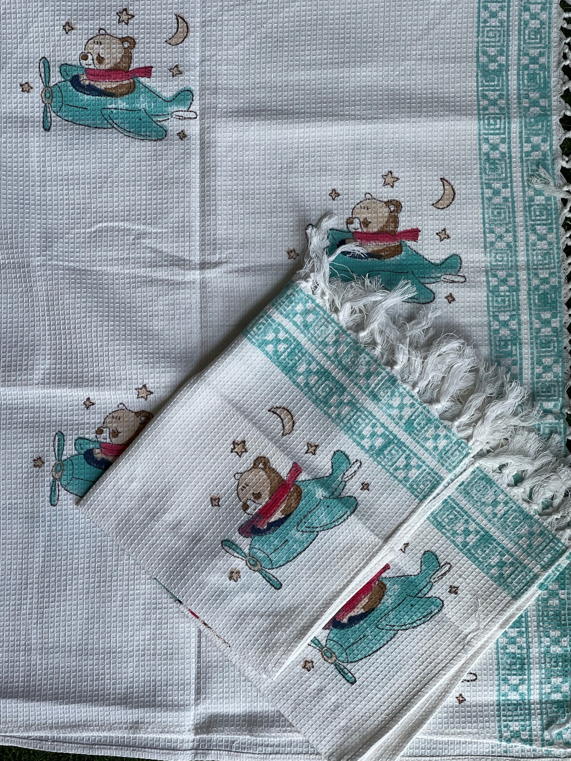 Bear on a plane hand block printed cotton bath towel and 2 hand towels set