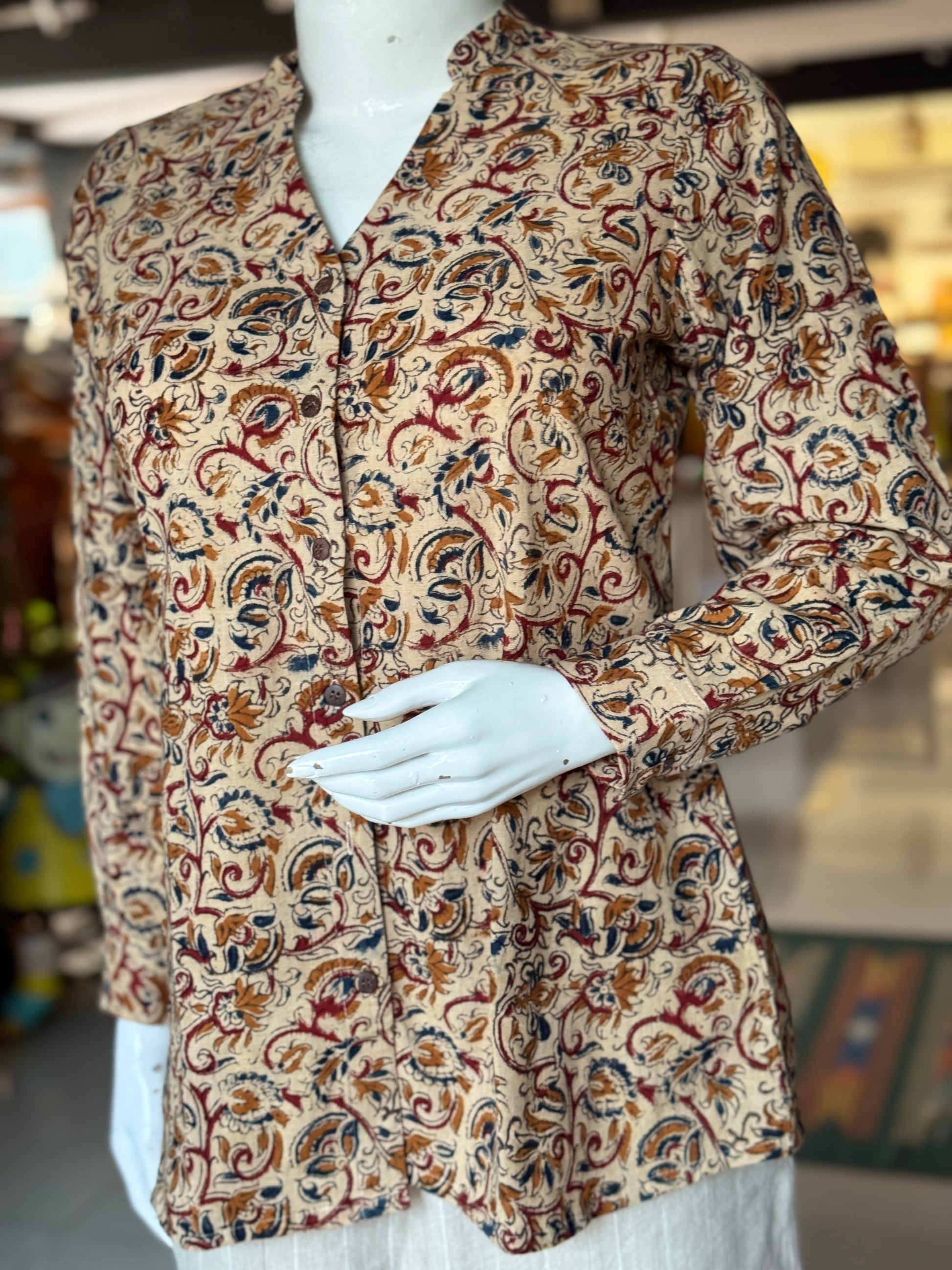Beige Kalamkari Chinese collared top with V-neckline - hand block printed, Hand spun, hand woven cotton