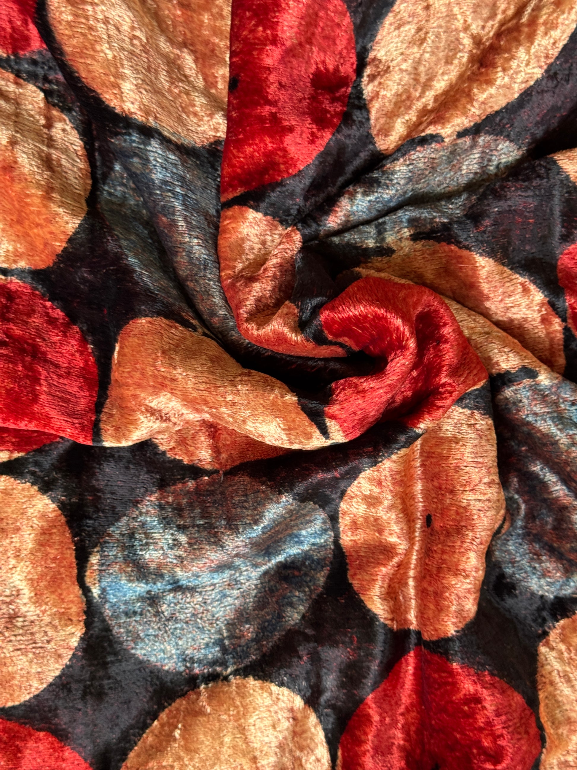 Big maroon and beige circles on black velvet base - Ajrakh hand block printed fabric