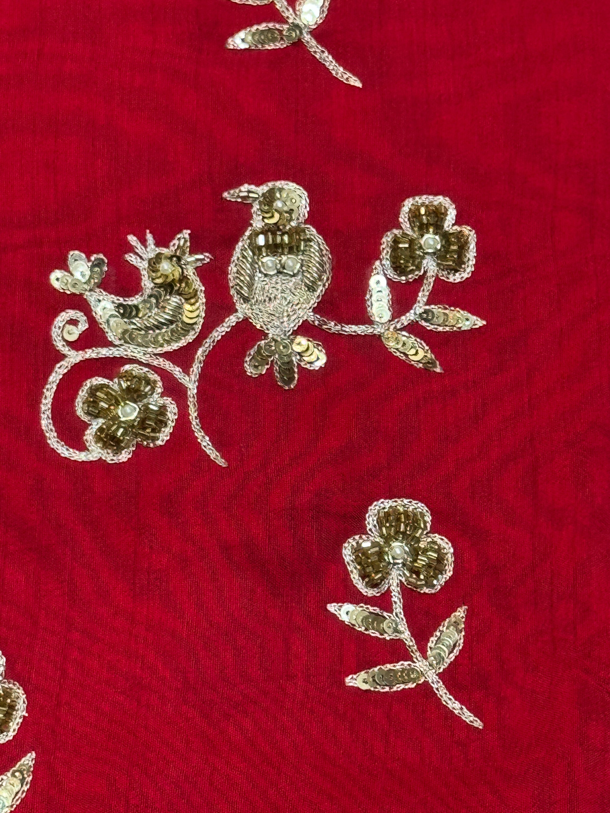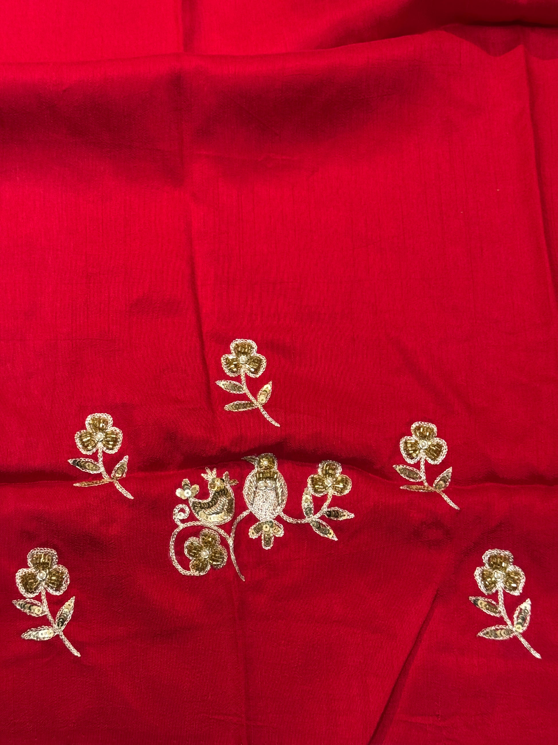 Birds and flowers - hand embroidered red silk unstitched blouse piece