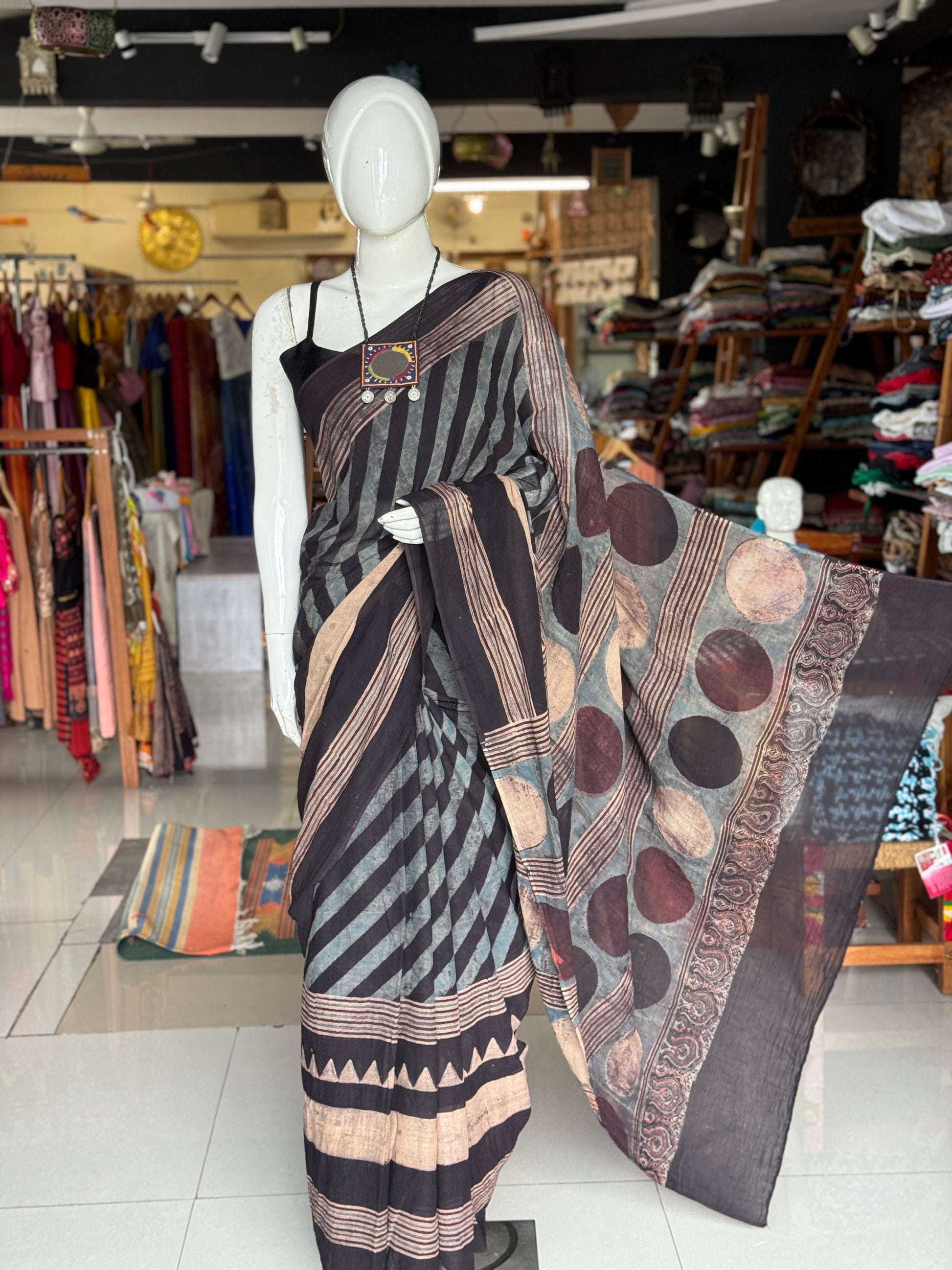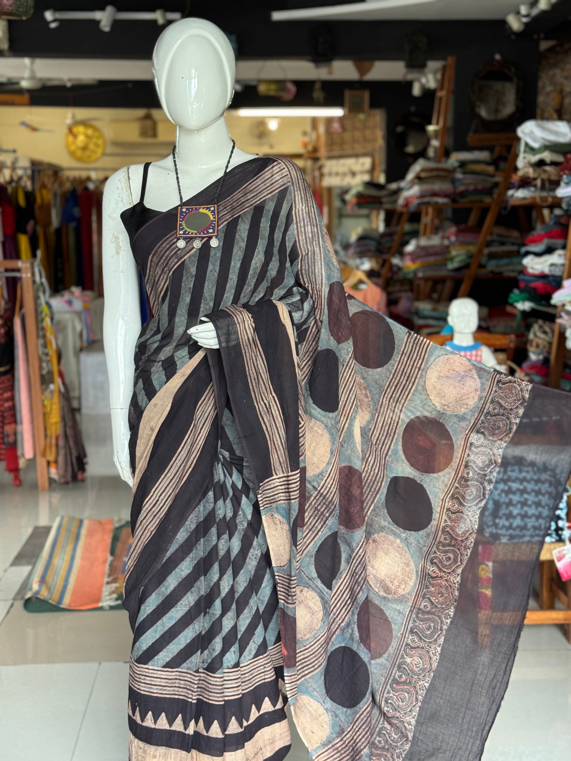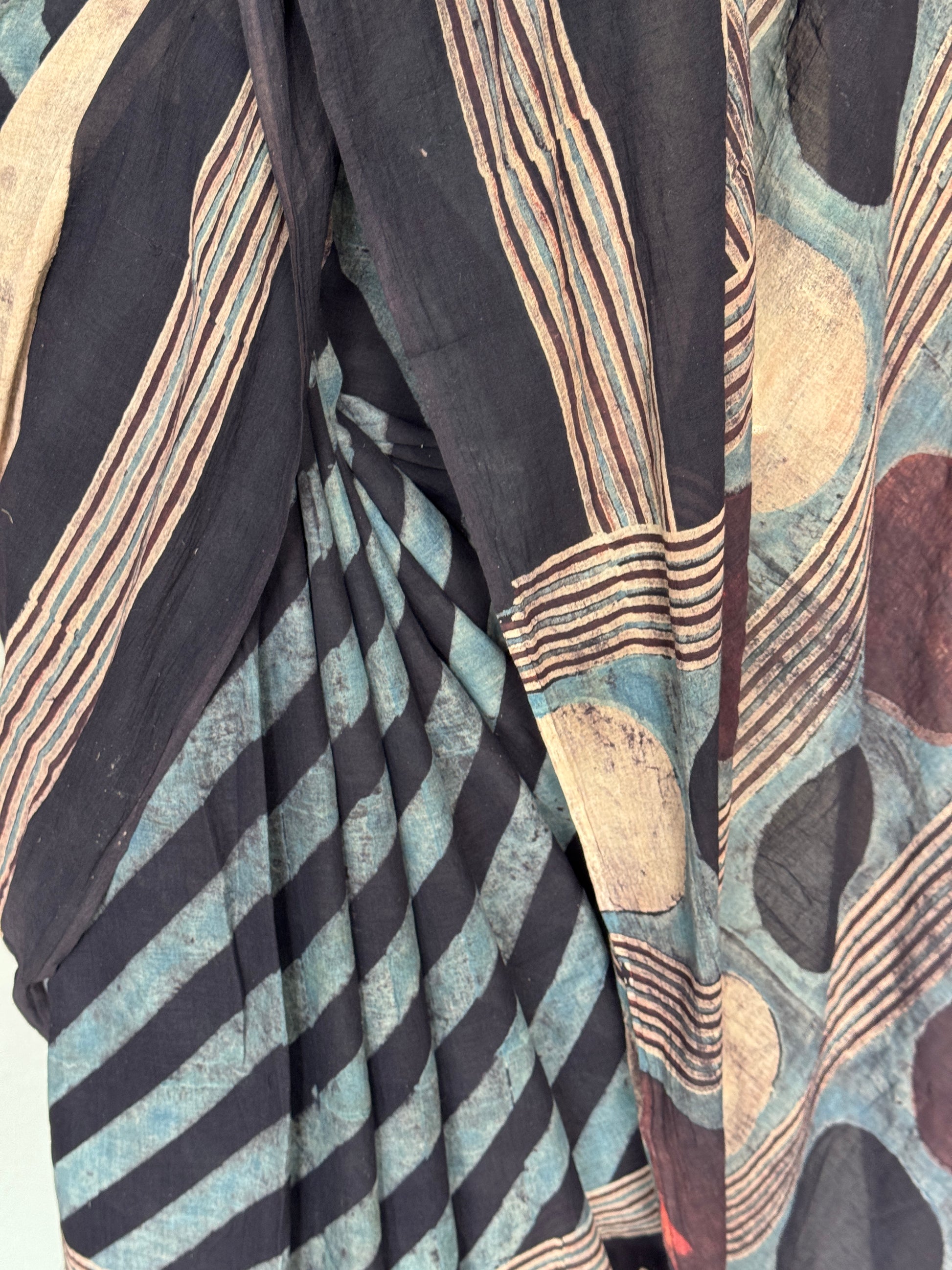 Black and Indigo stripes and circles design Ajrakh hand block printed soft mul cotton saree