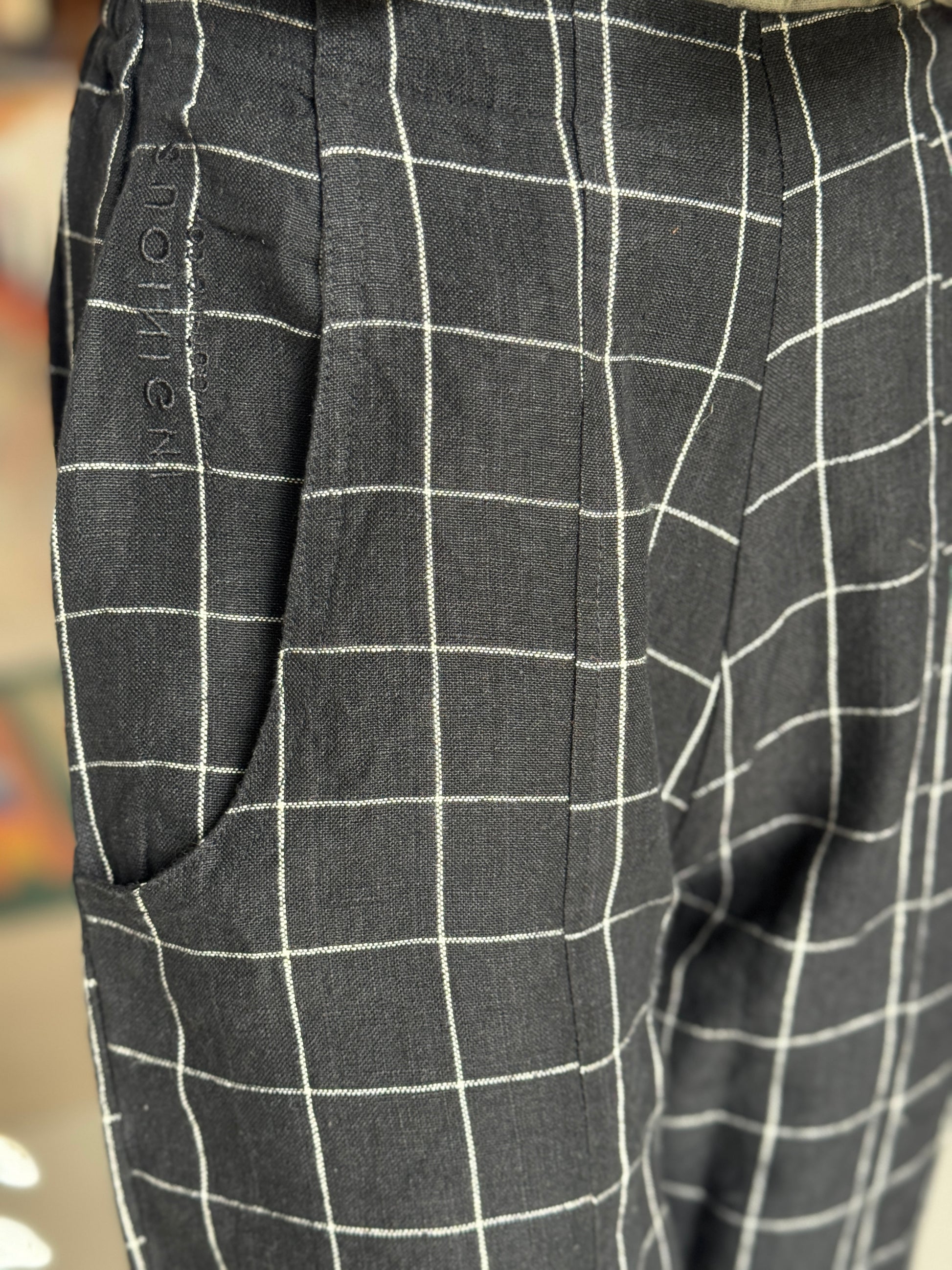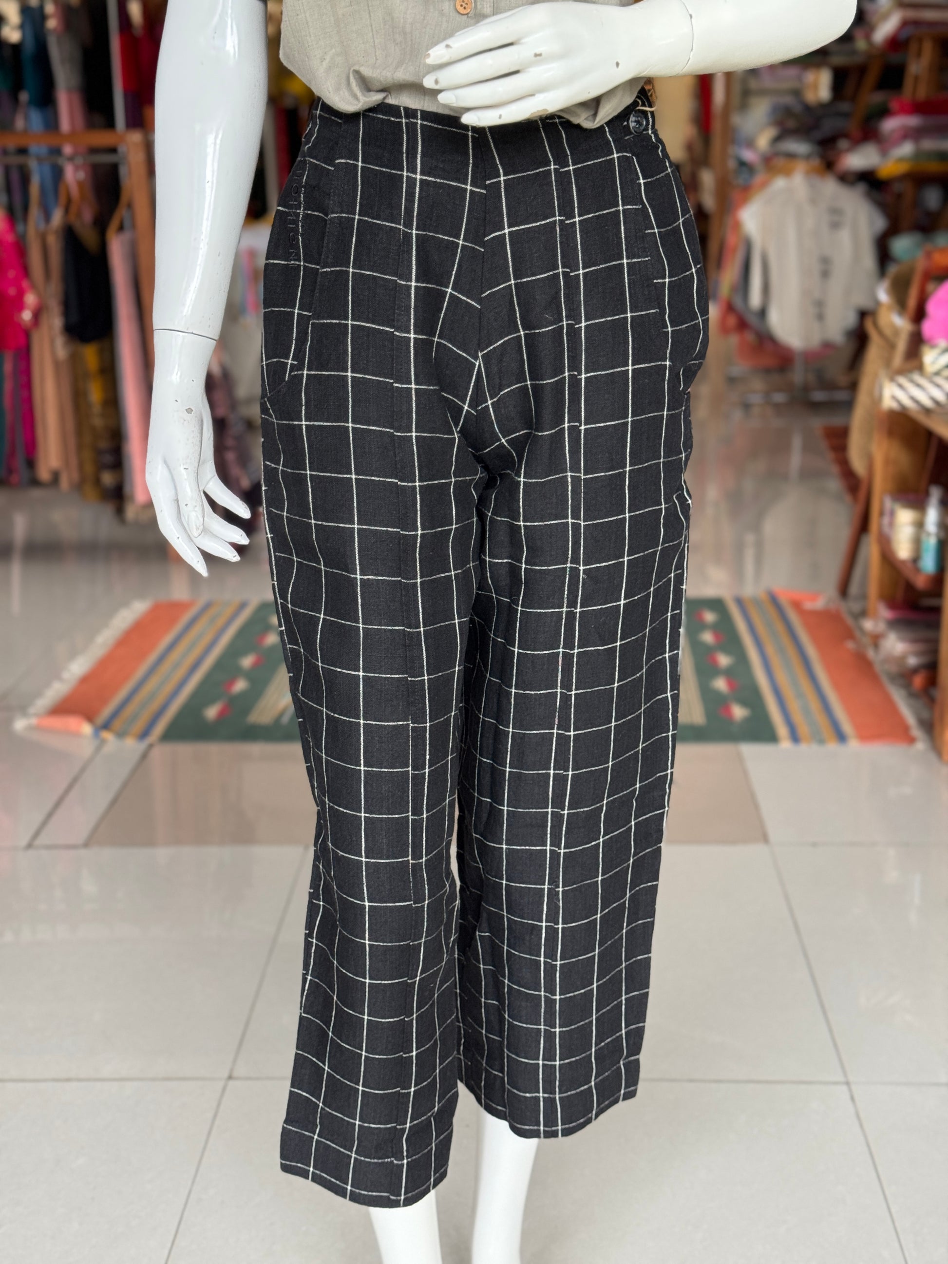 Black checks handwoven linen trousers for women
