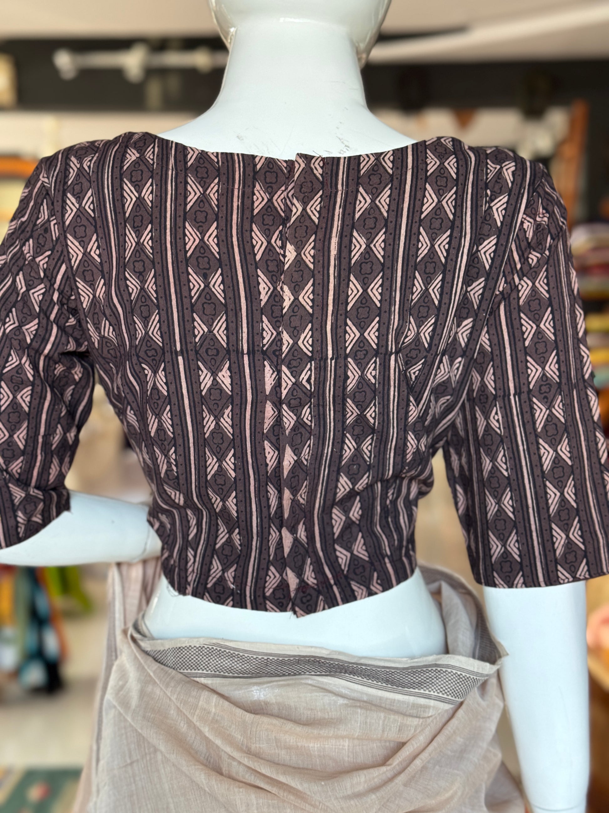 Black n brown geometric design Ajrakh handblock printed, natural dyed cotton back open blouse