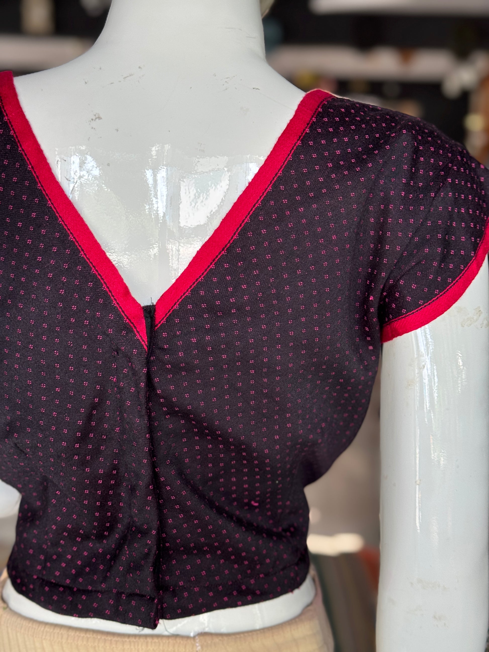 Black with pink dots handwoven Mashru blouse with short sleeves