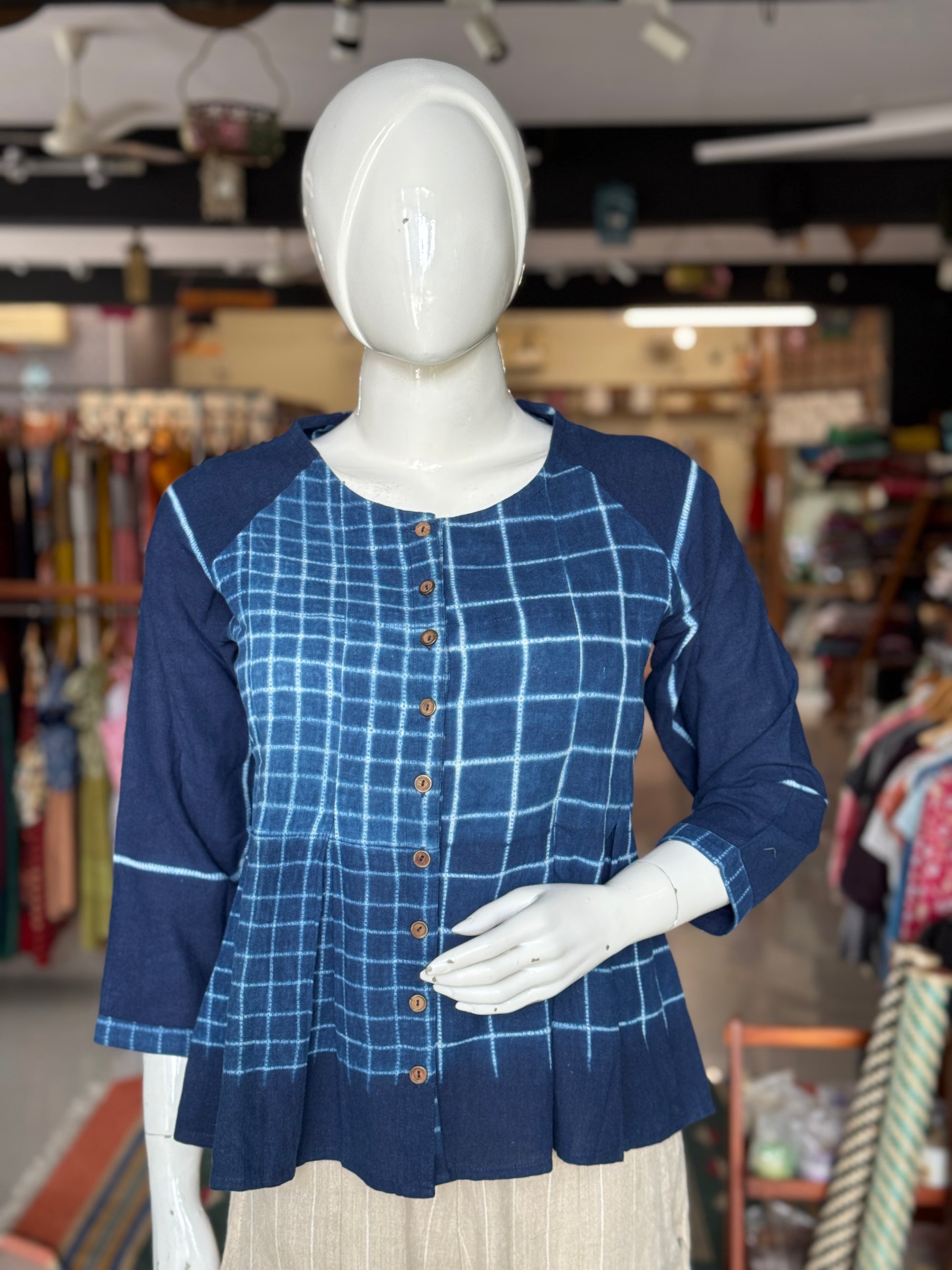 Blue and white different sized checks needle Shibori tie n dye cotton top