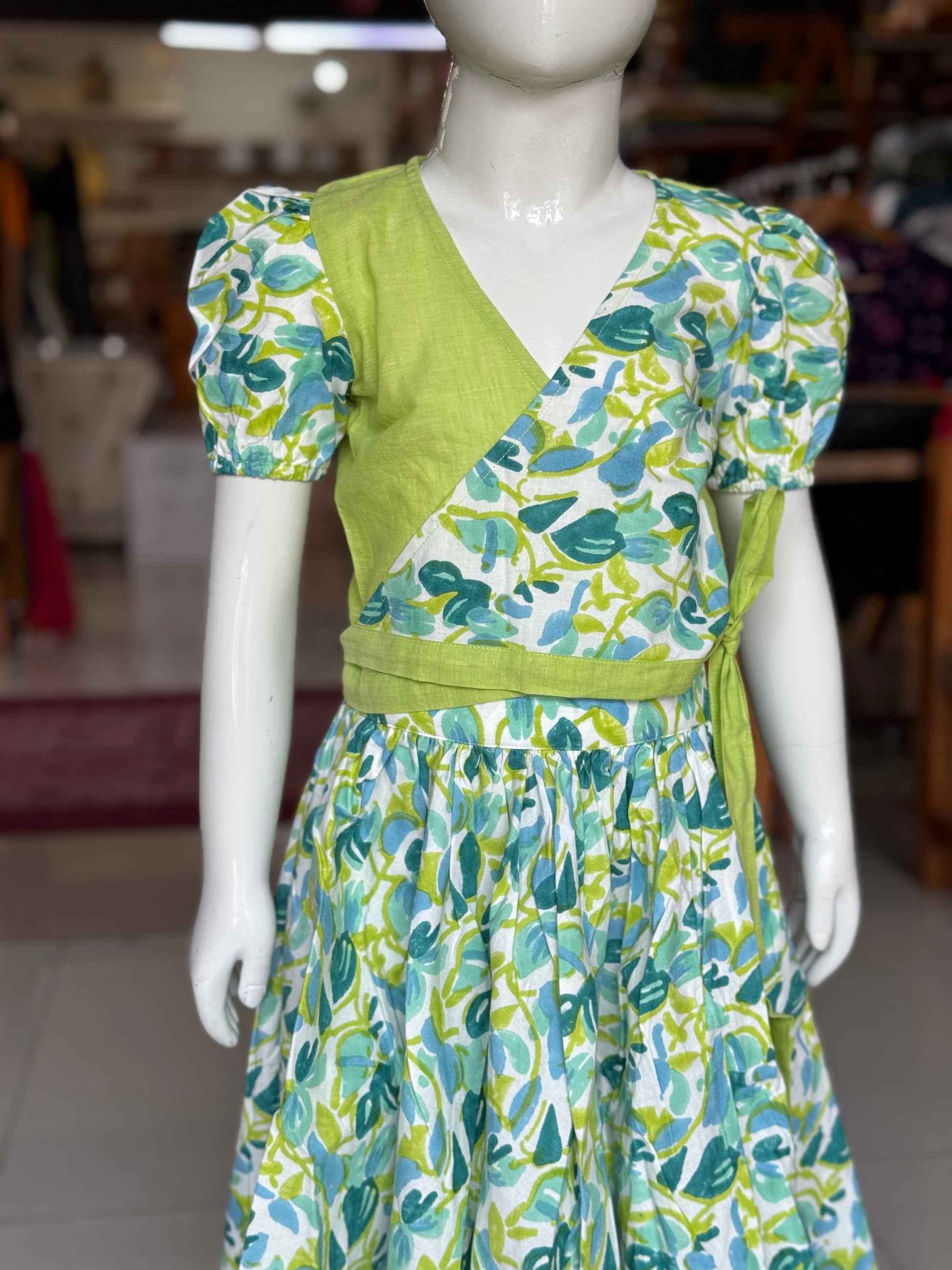 Blue green hand block printed cotton lehenga skirt and wrap top - 2 piece set for girls