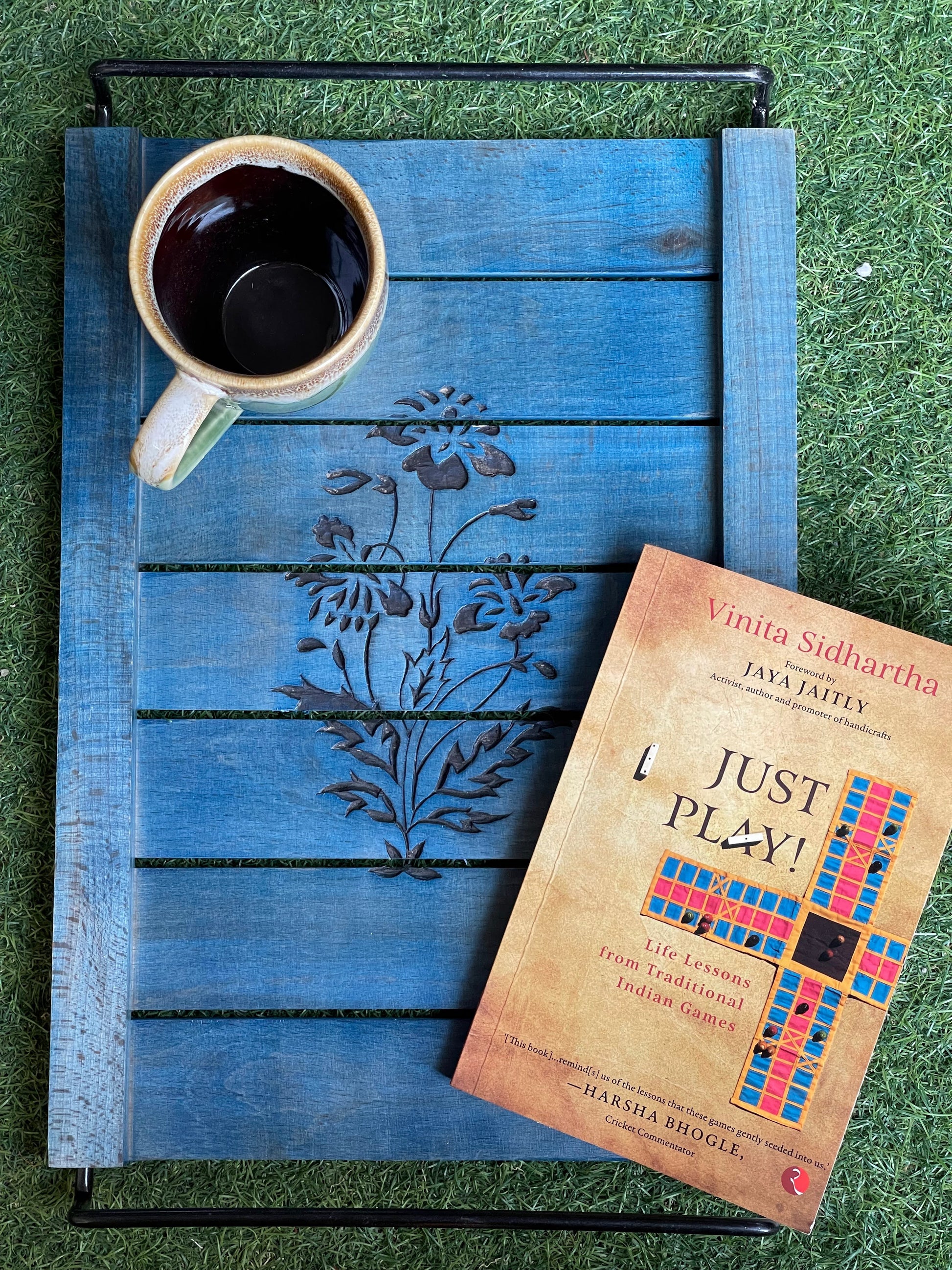 Blue hand made rectangular (14 x 10 inches) cut work serving tray with iron handles - flowers design