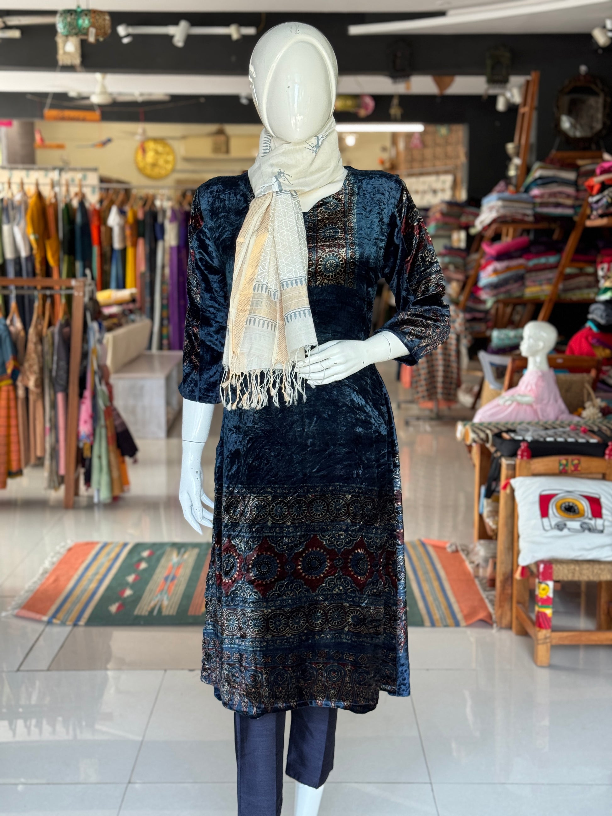 Blue velvet straight kurti with Ajrakh hand block prints - neck and hem detailing