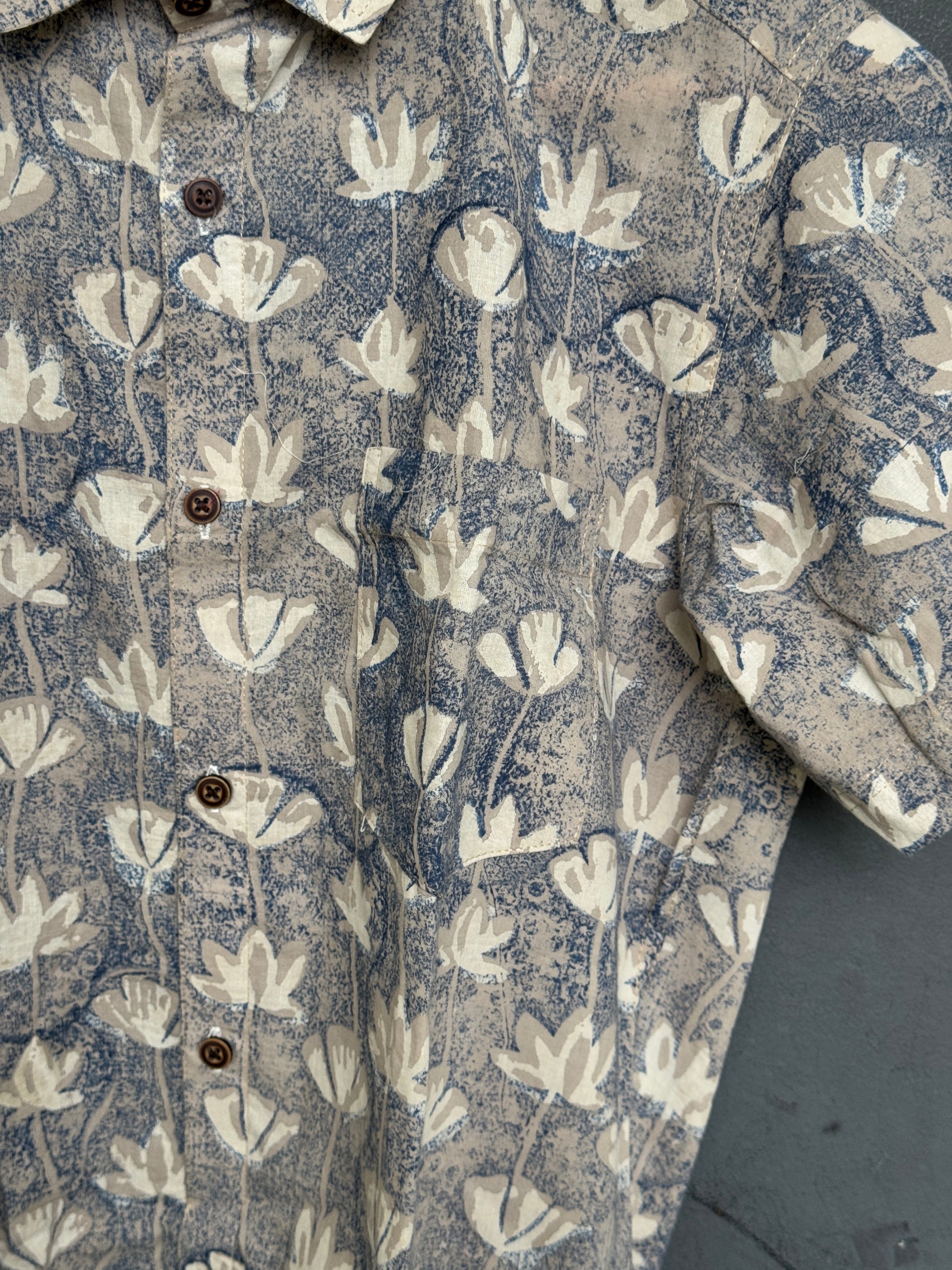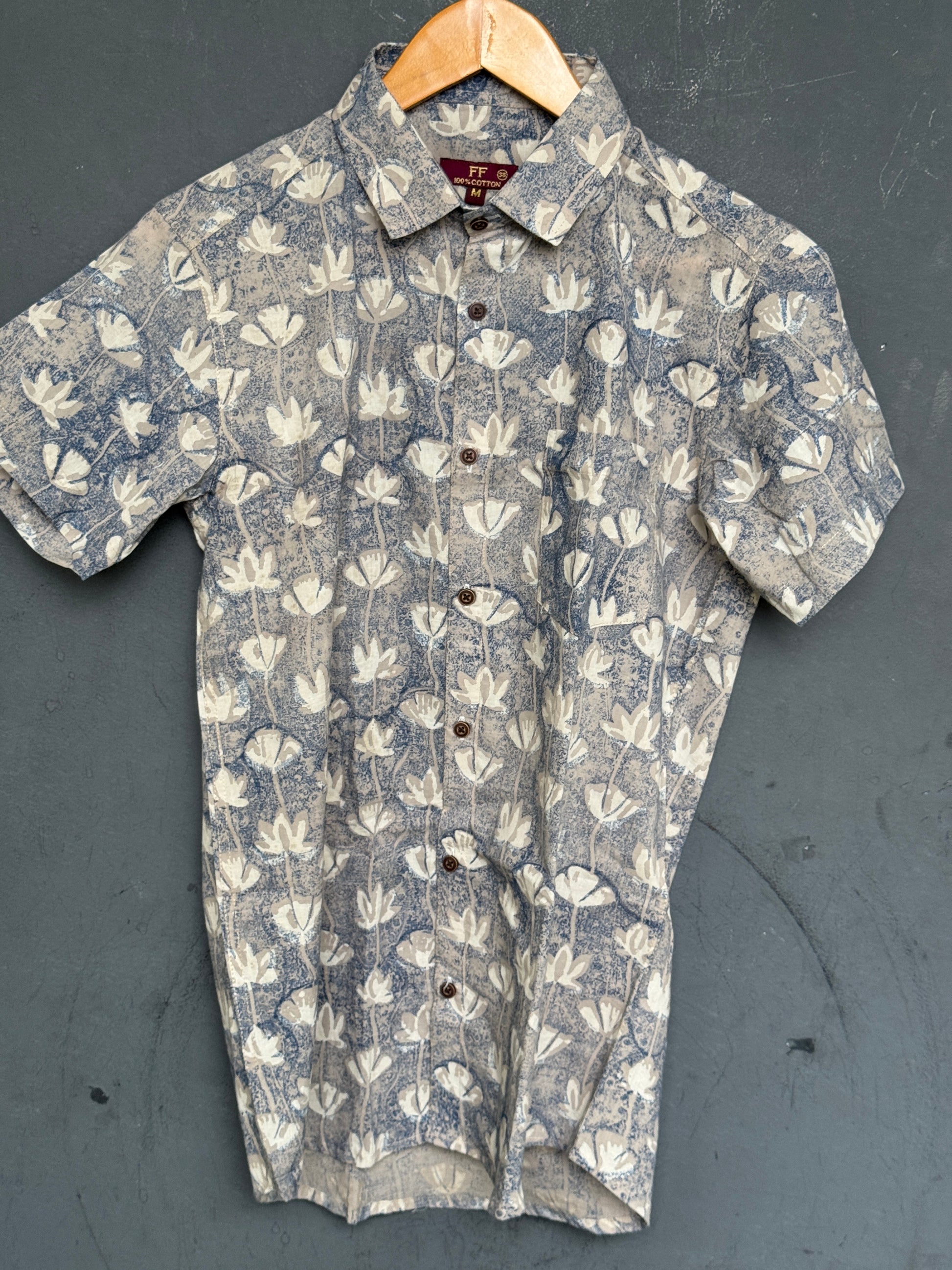 Bluish grey flowers print half sleeves mens hand block printed cotton shirt