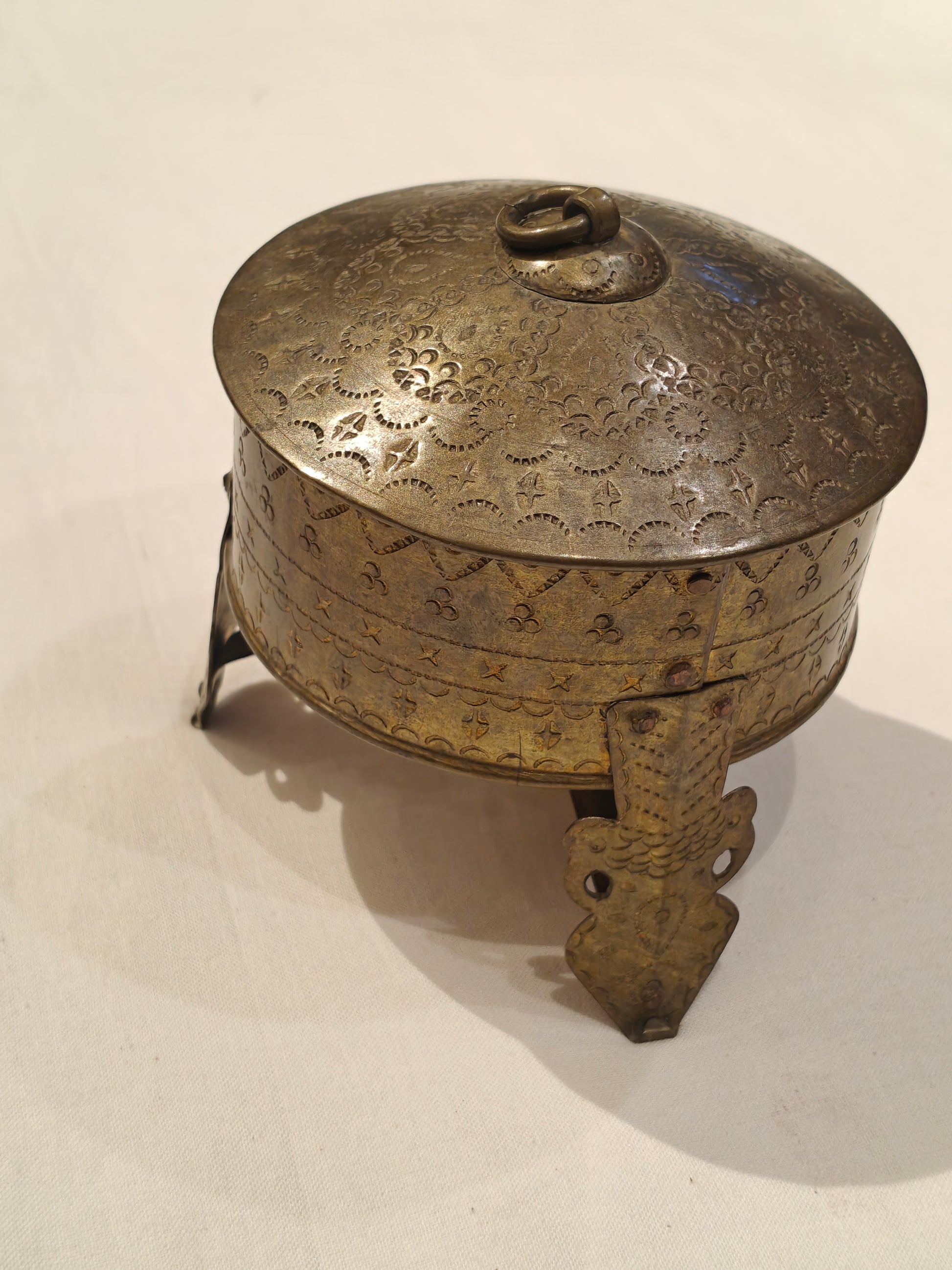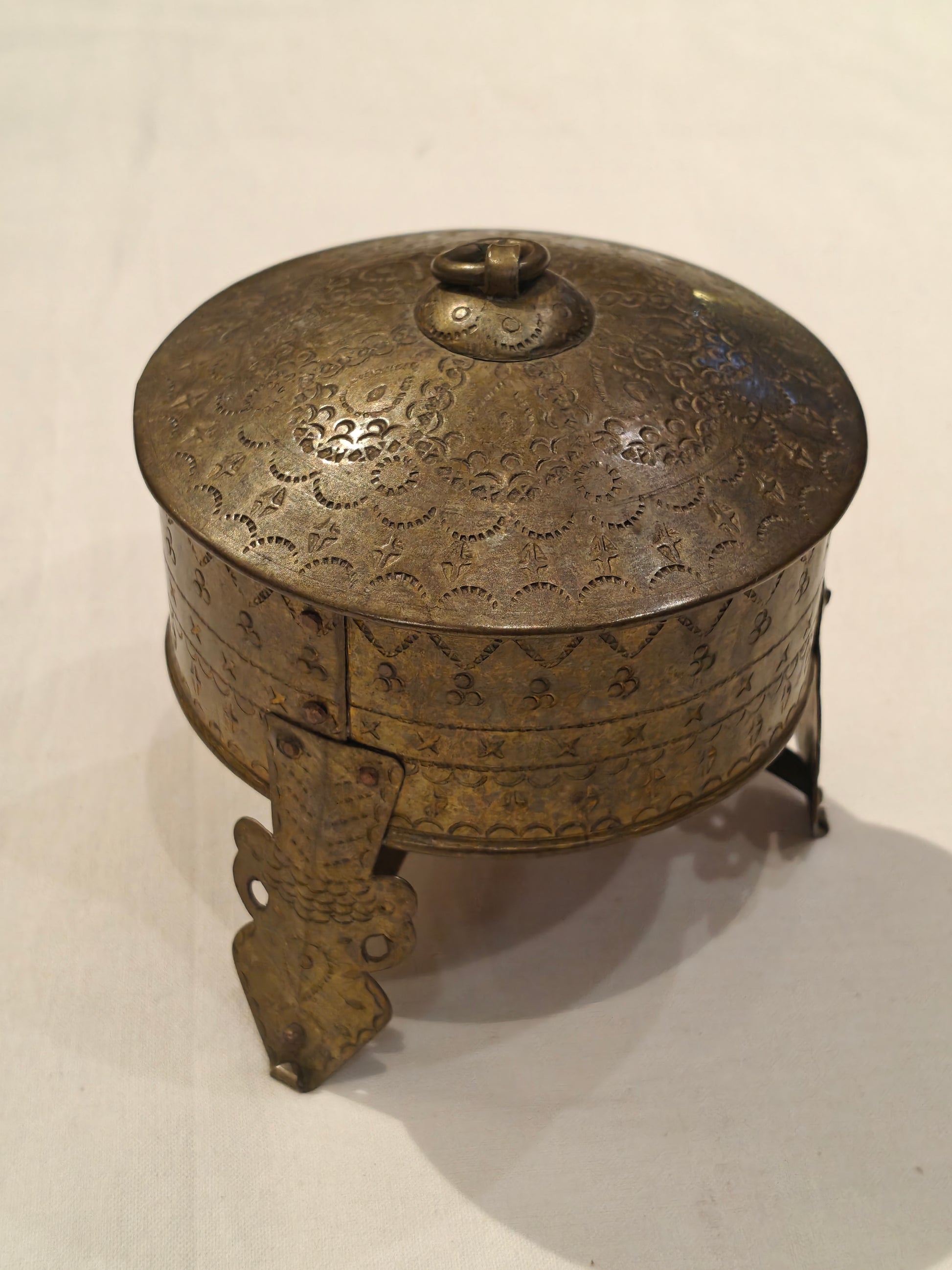 Brass container box with a lid and 3 legs - hand hammered, handcrafted product