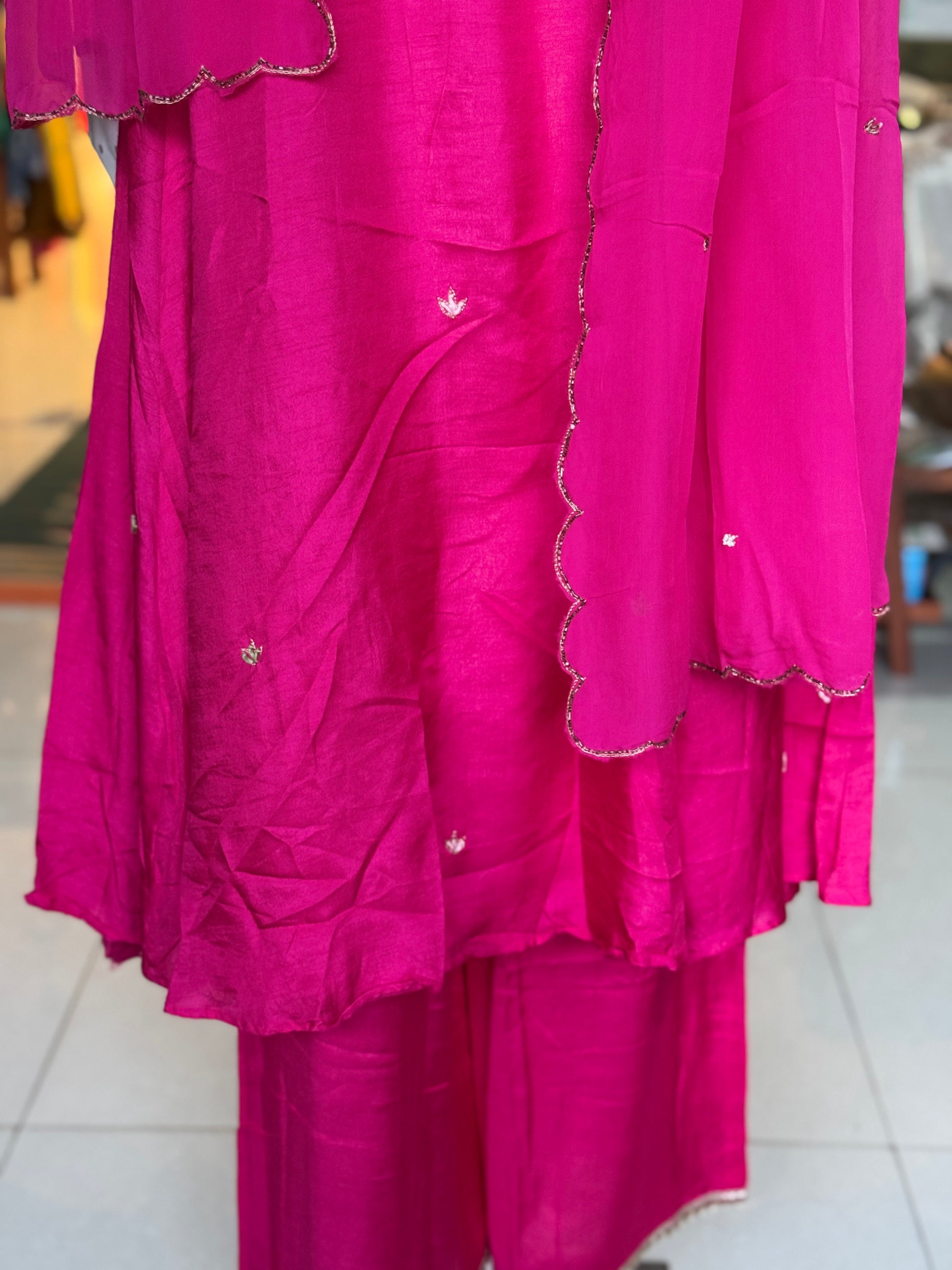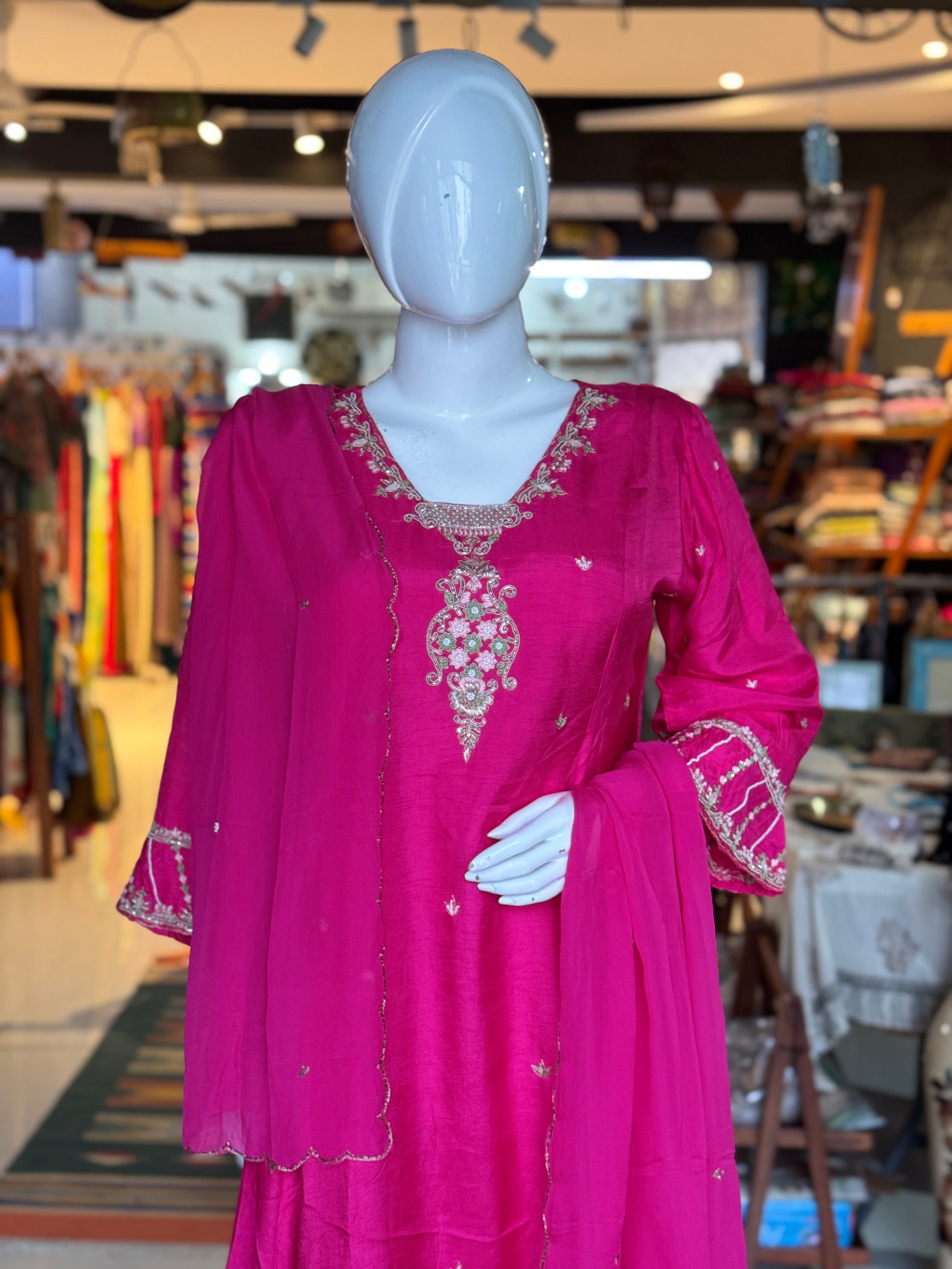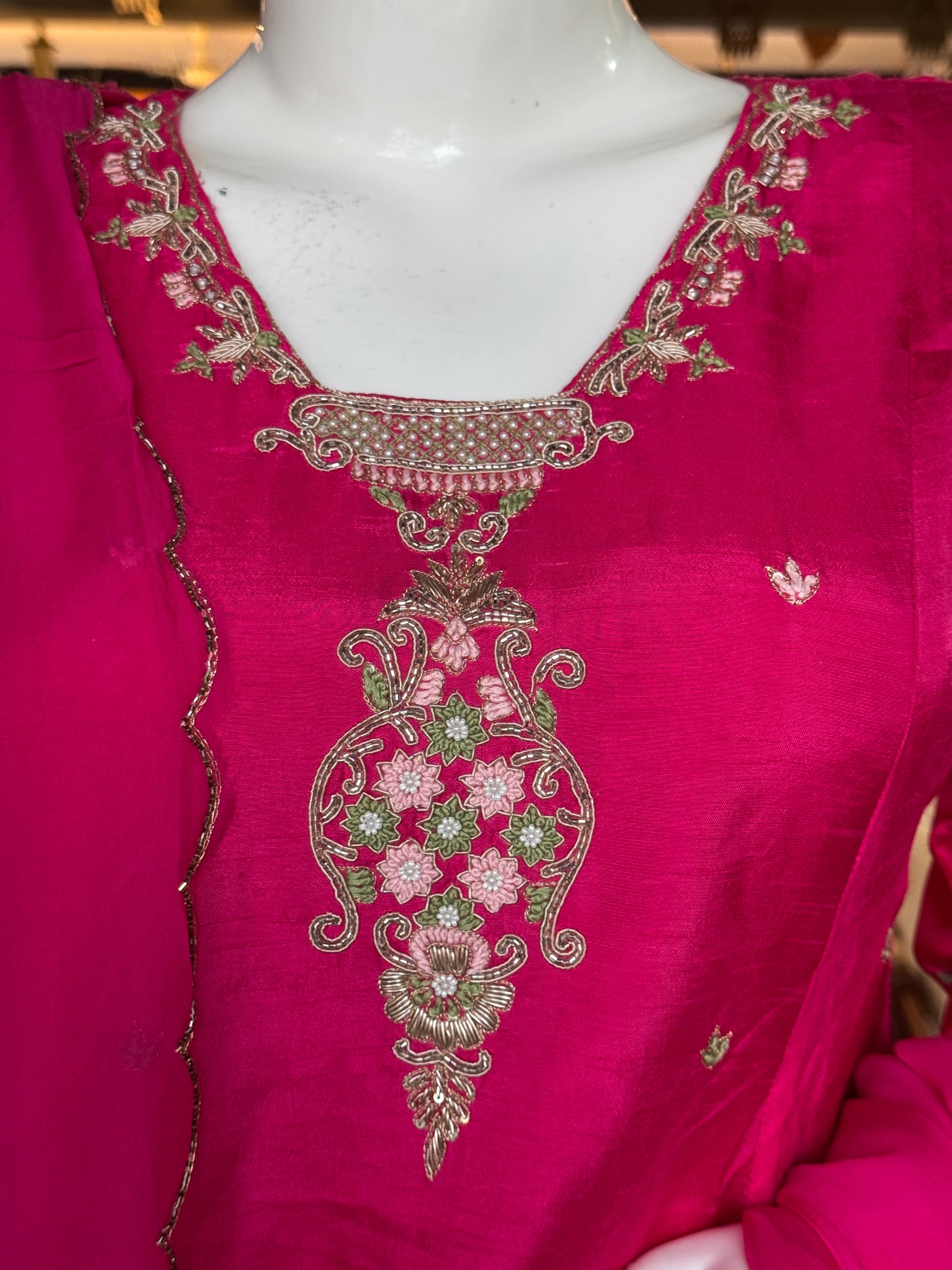 Bright pink dola silk hand embroidered 3 piece suit set with organza dupatta - festive wear set