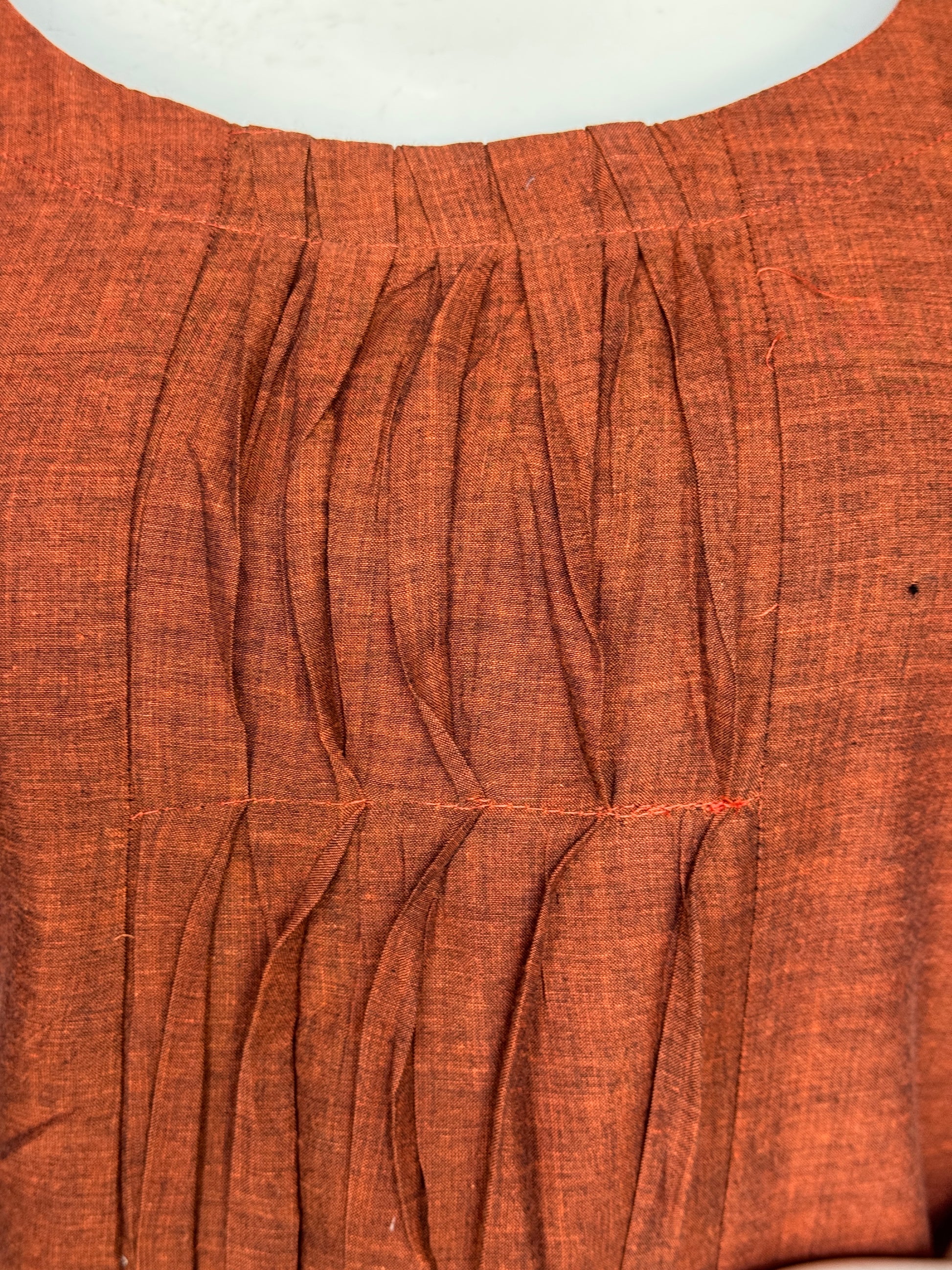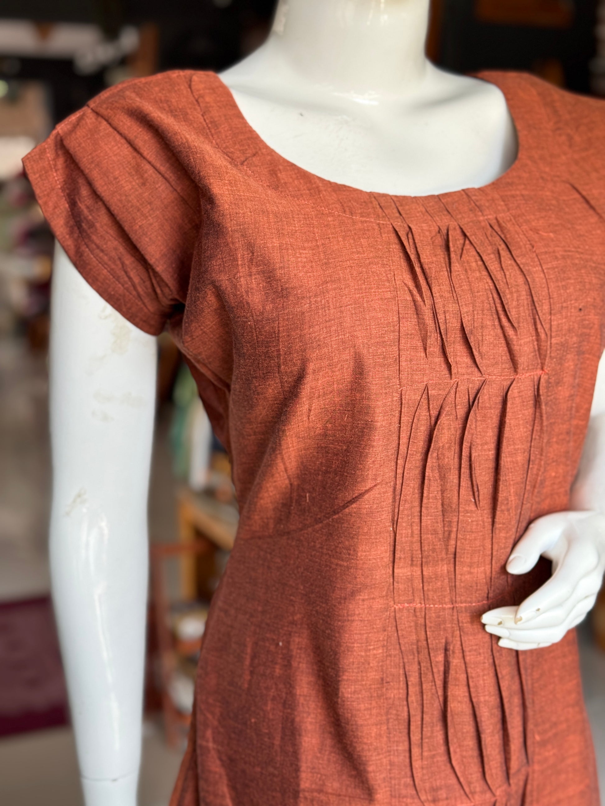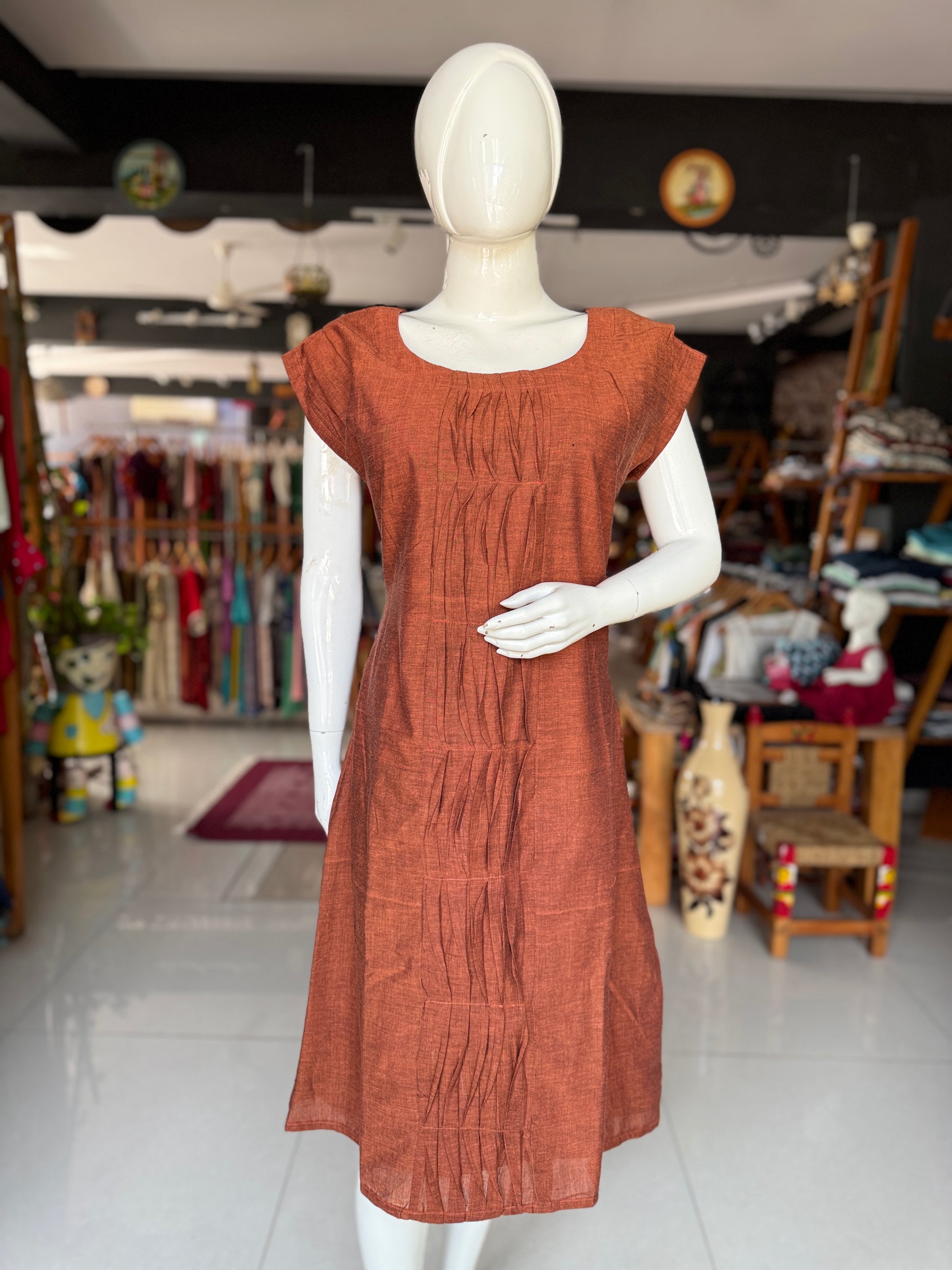 Brown handwoven soft mul cotton dress with twisted pintucks center panel and pleated shoulder sleeves