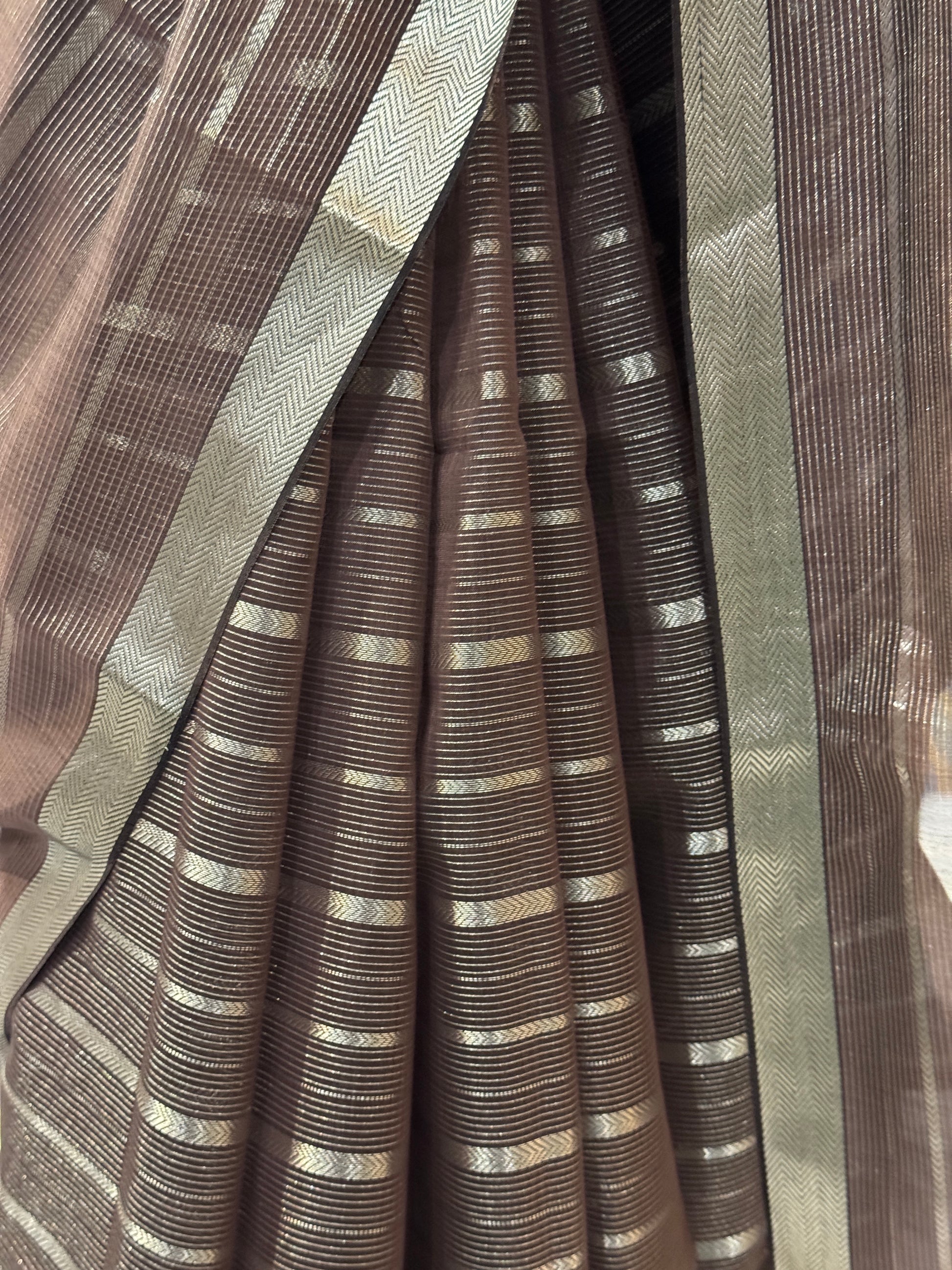 Brown silk cotton Maheshwari handloom saree with thin n thick silver zari stripes all over