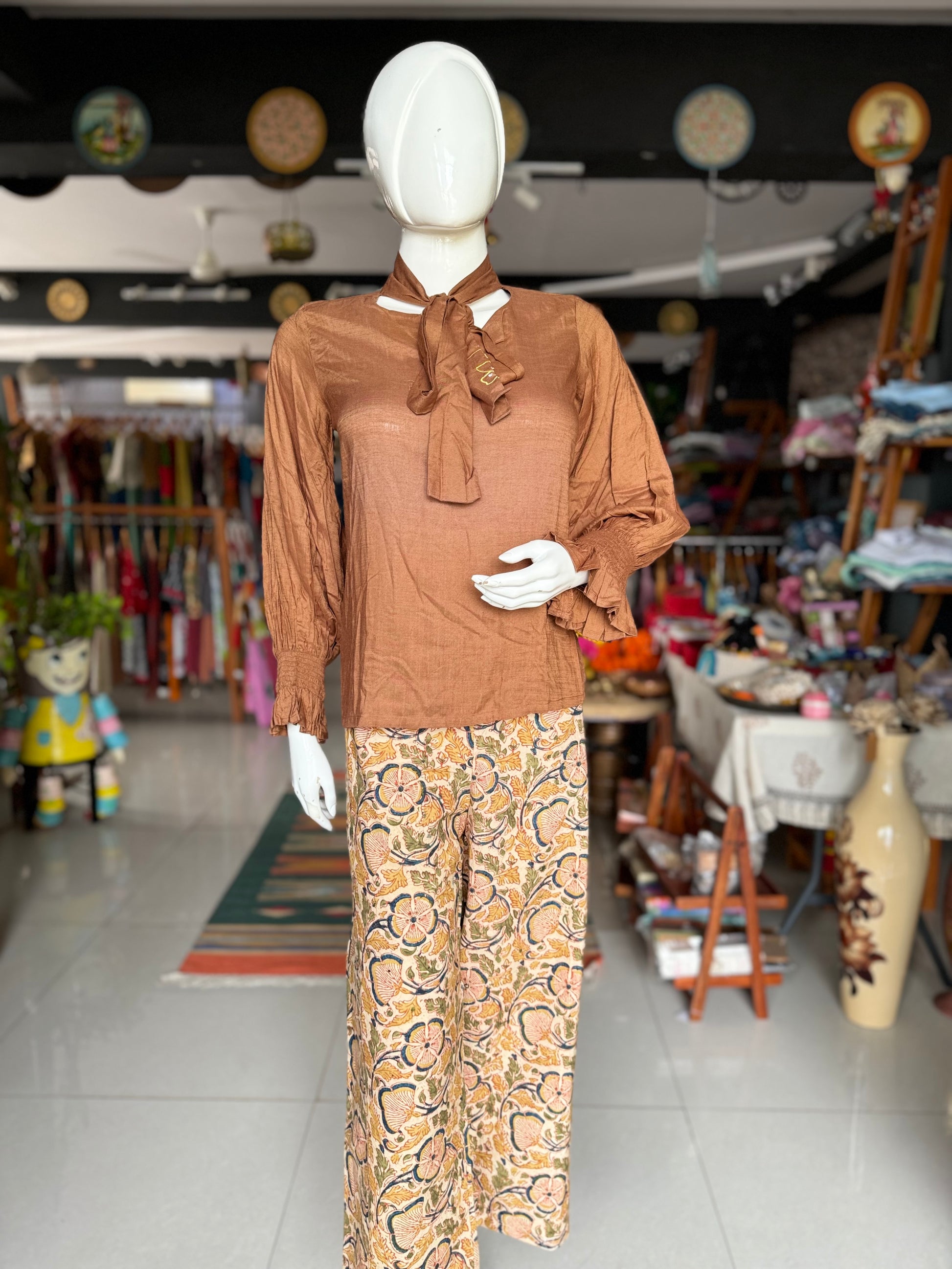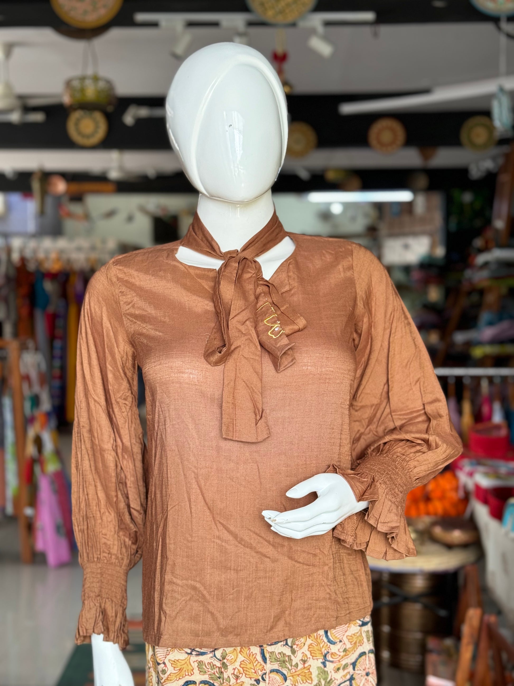 Brown soft rayon top with long sleeves and neck tie