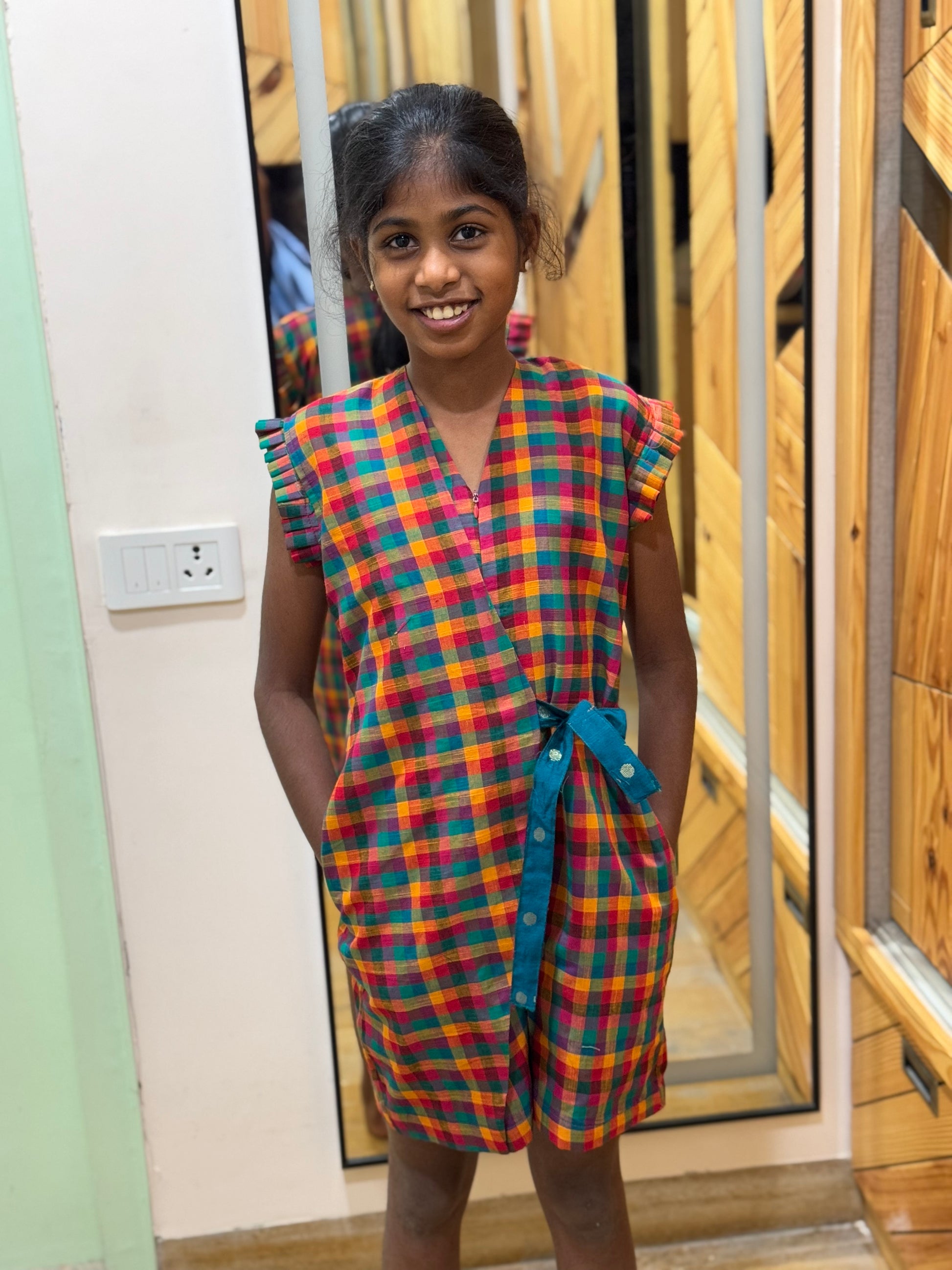 Colorful checks cotton designer romper outfit for girls with zipper and flap cover with belt