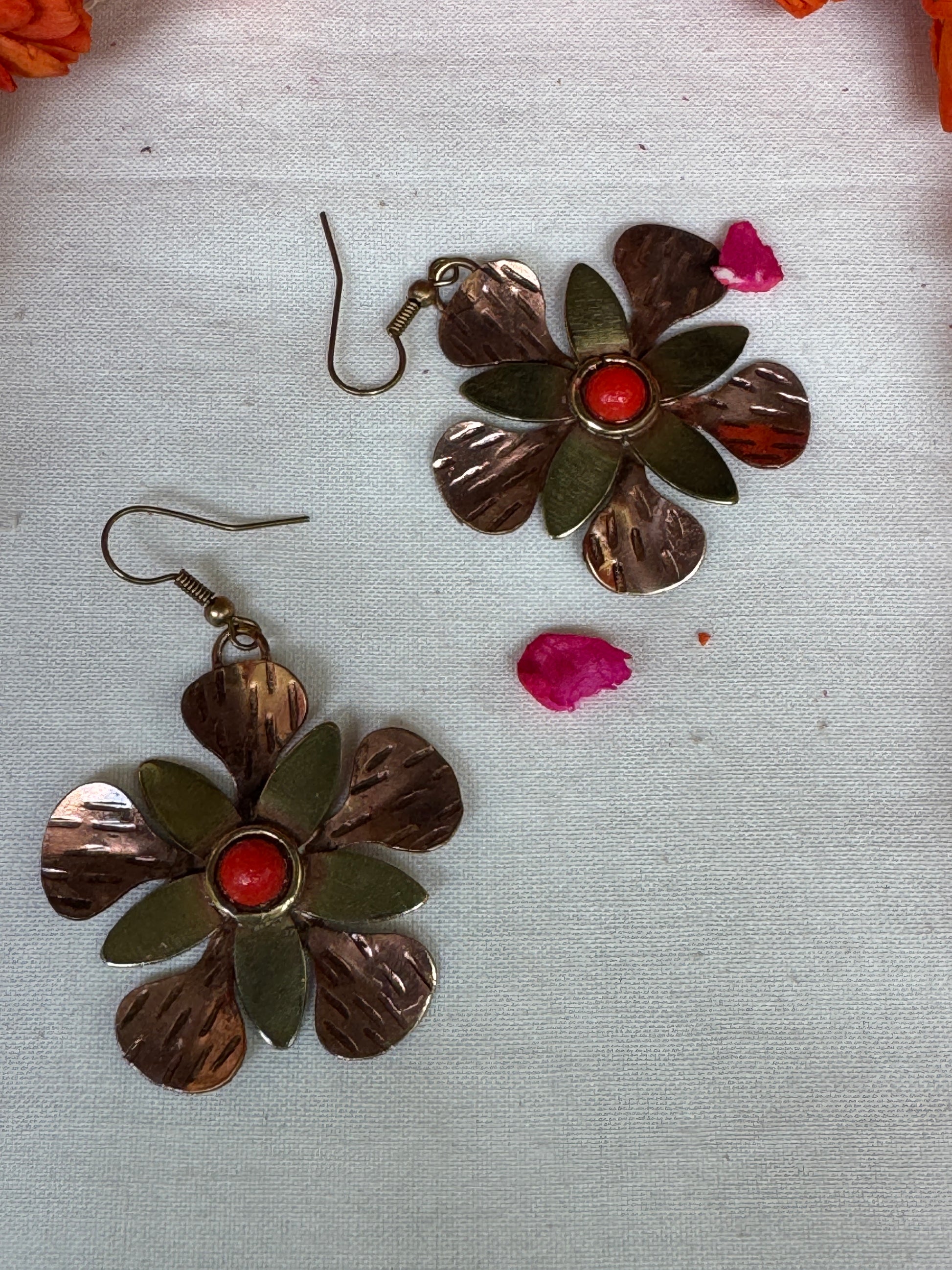 Copper brass flower hooks with coral center - earrings made of copper and brass