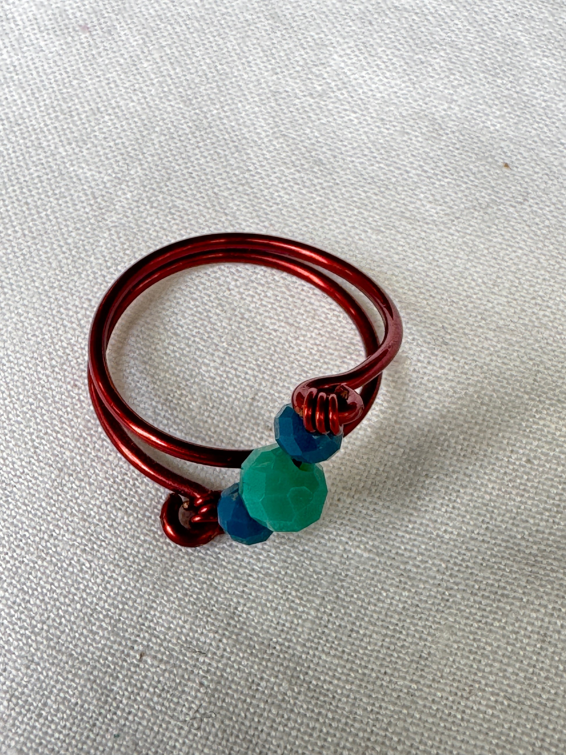Copper twisted wire finger ring with blue green beads
