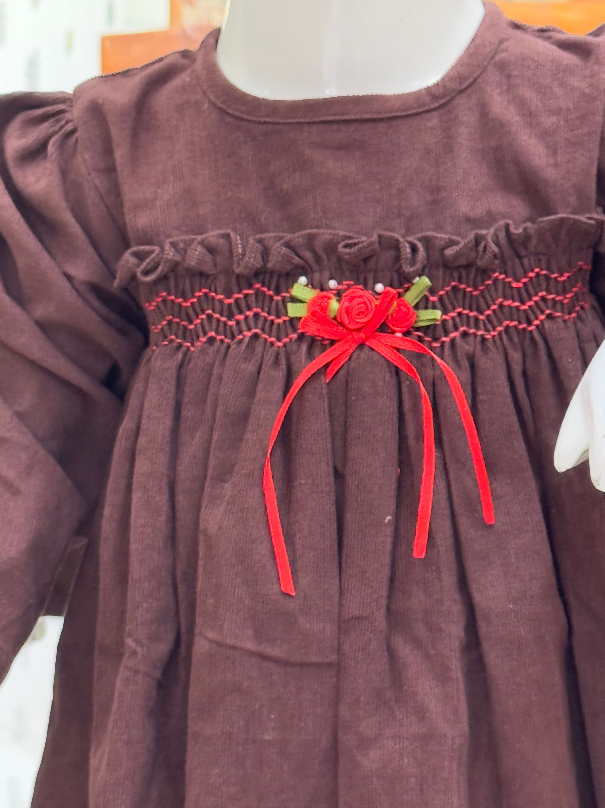 Corduroy soft frock with smocking embroidery