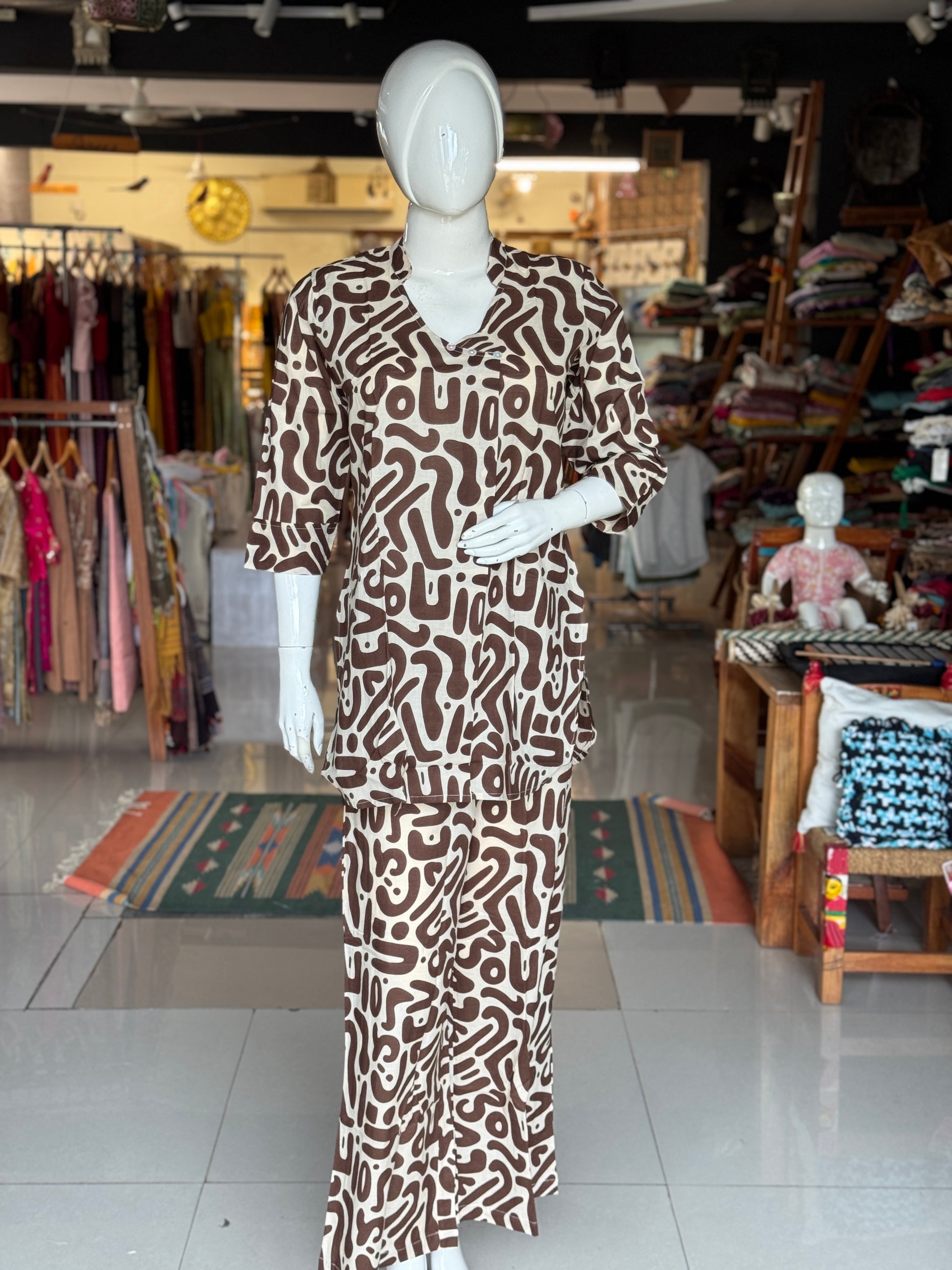 Cream and brown printed cotton 2 piece lounge wear / coord set