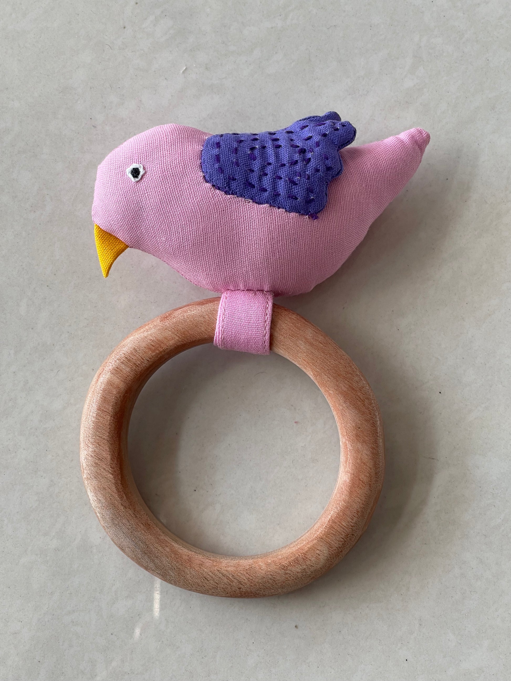 Cute cotton fabric kapok filled bird rattle with wooden ring