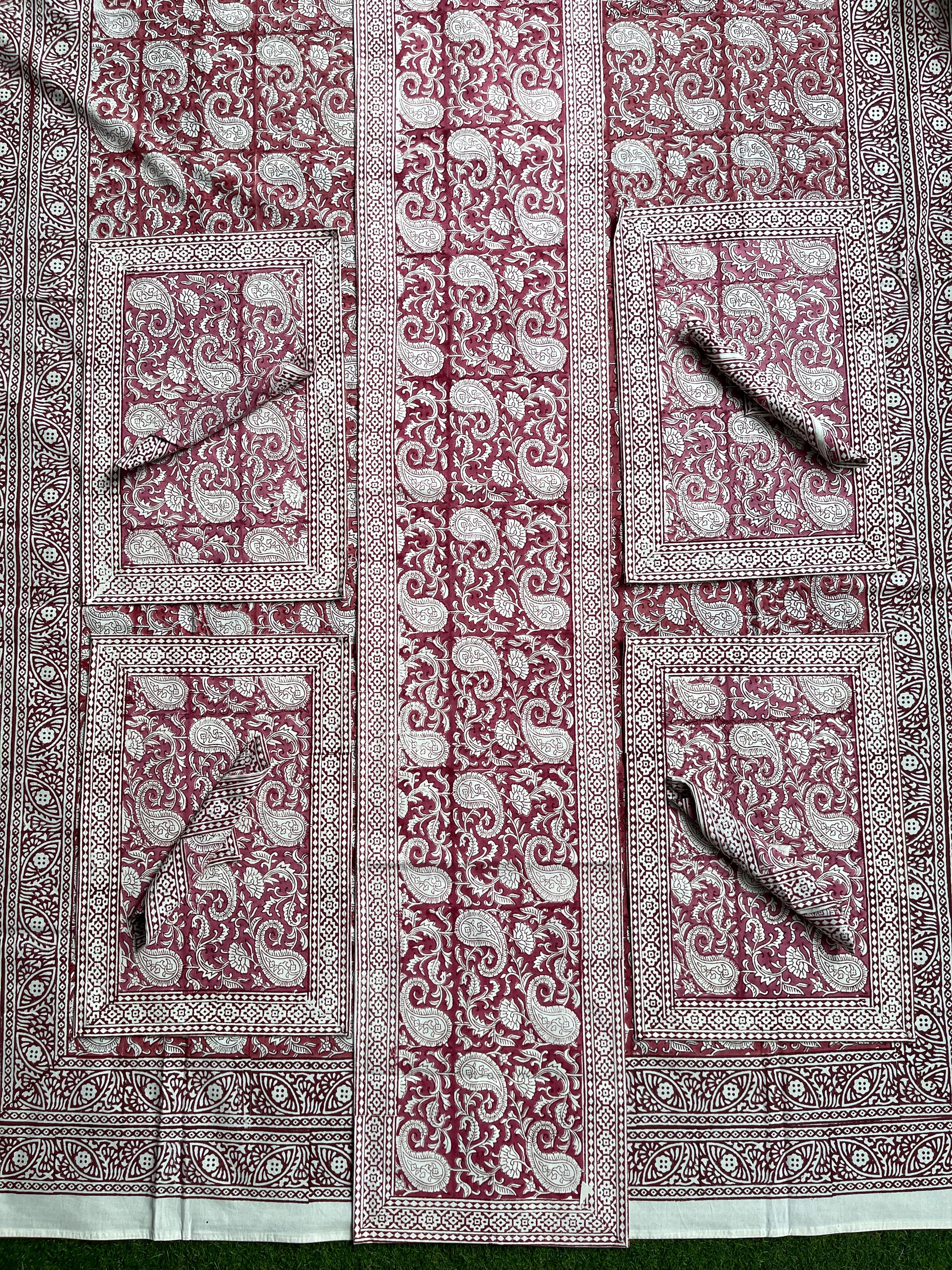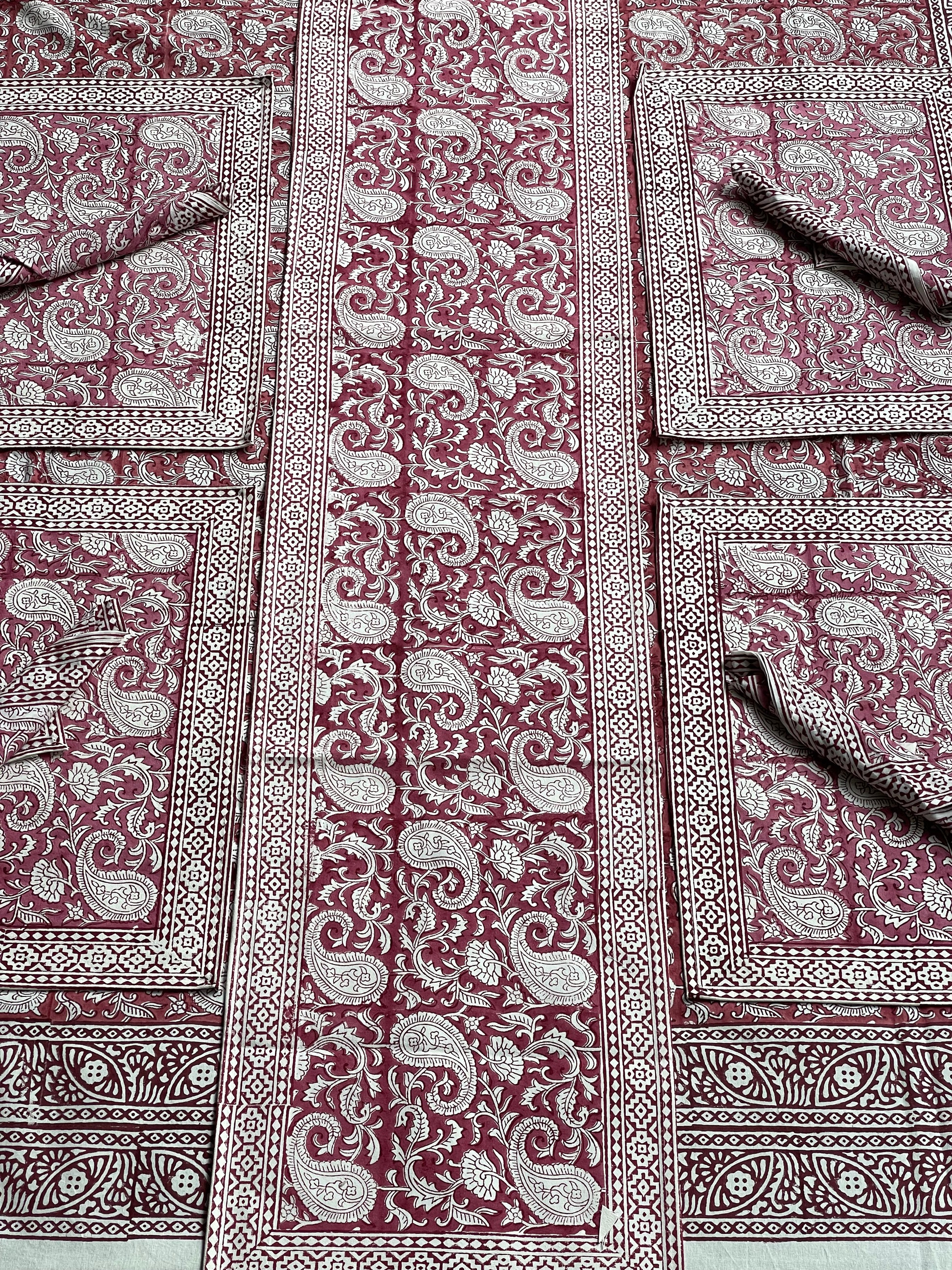 Dark pink floral hand block printed table cover, runner, 6 place mats and napkins set