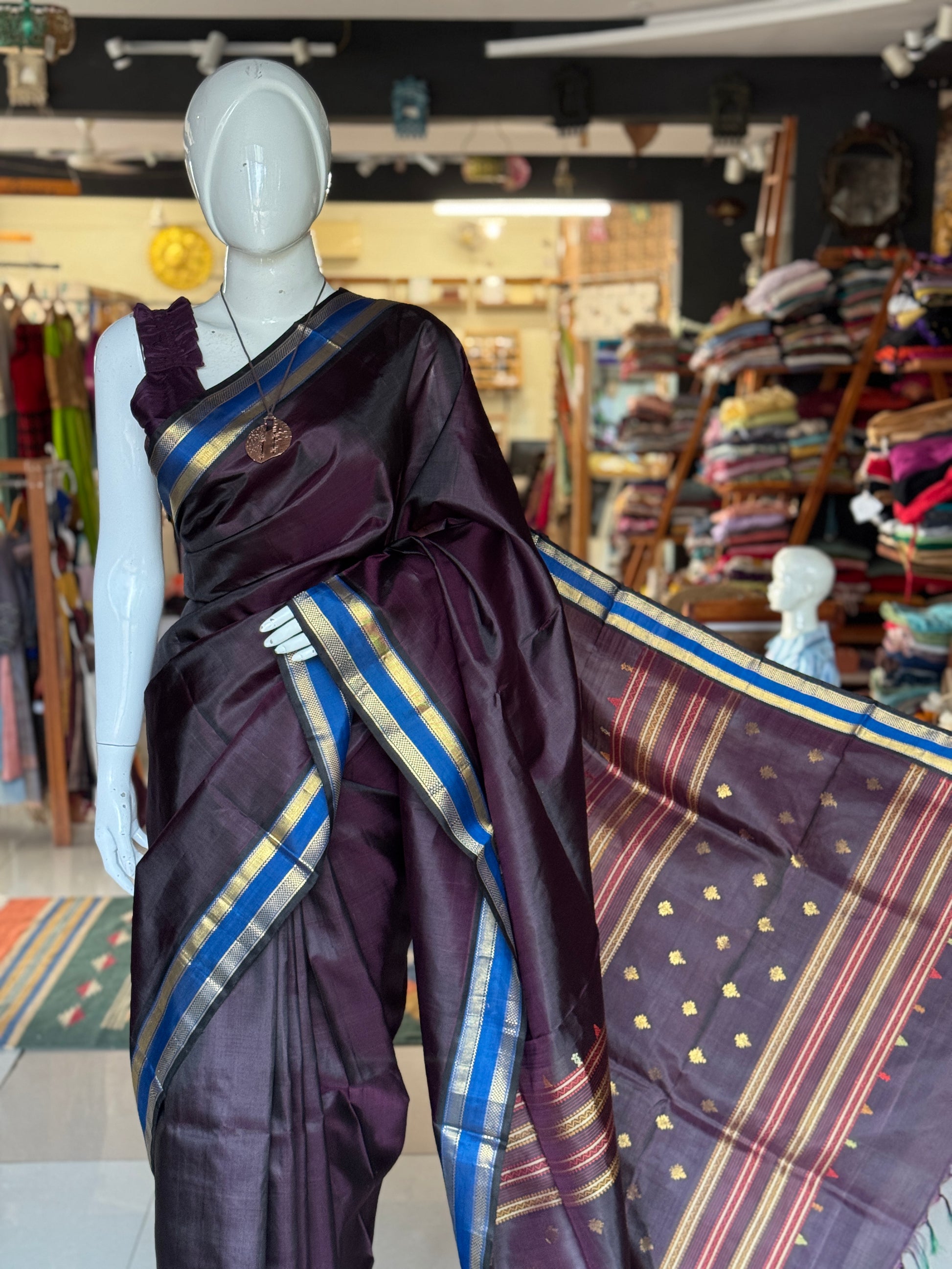 Deep burgundy shade pure silk handloom Kumbakonam pattu saree with blue border and a beautiful palla