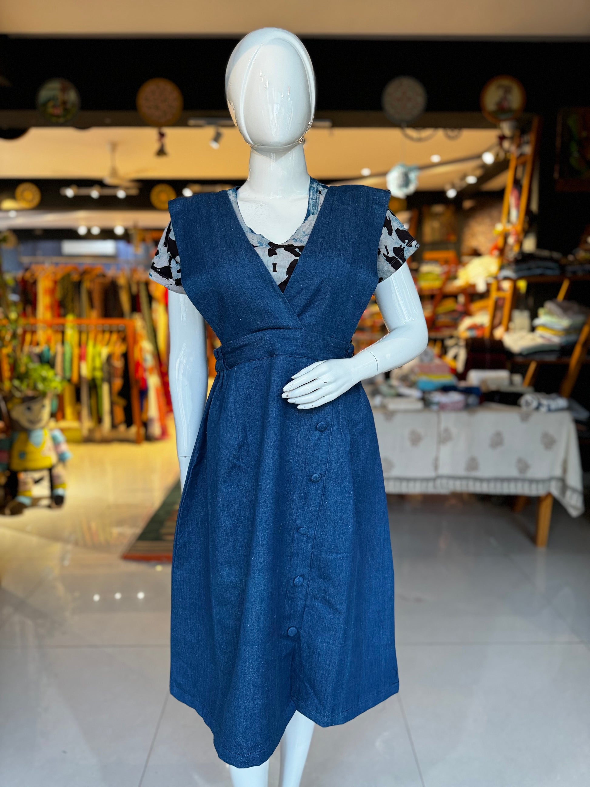 Denim pinafore dress in handloom natural dyed cotton