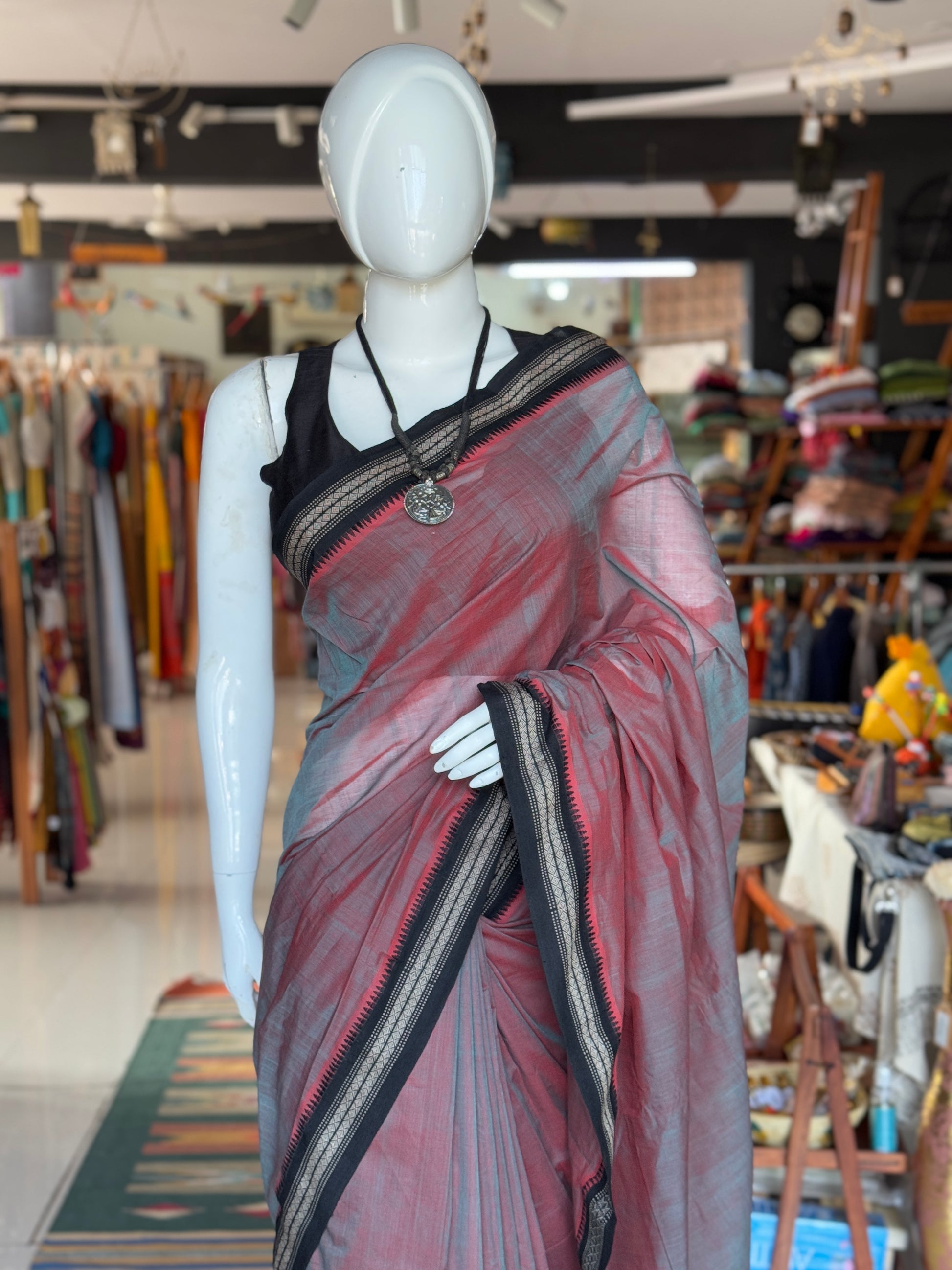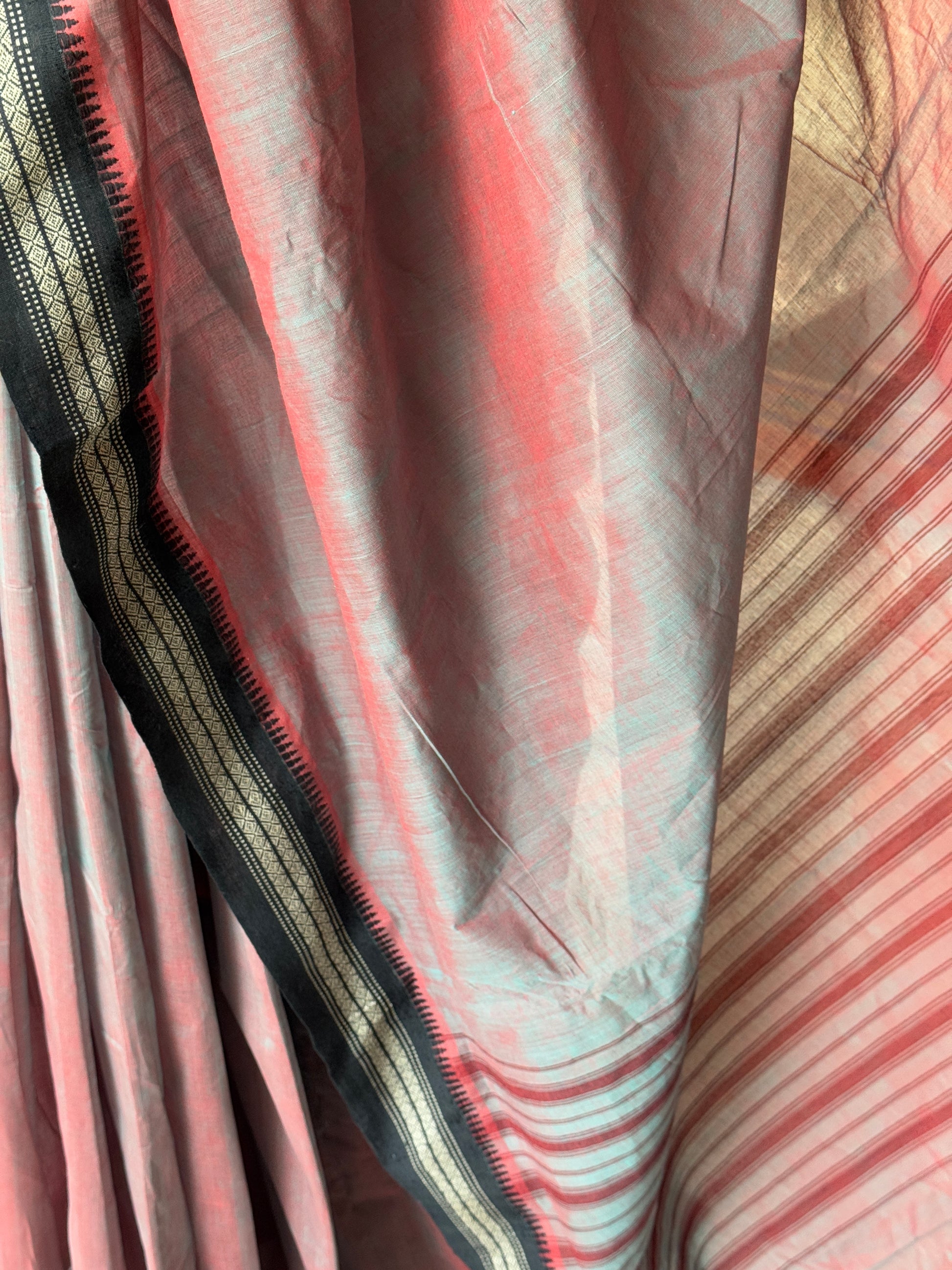 Dual tone pink and green handloom cotton saree with black Kuppadam thread border