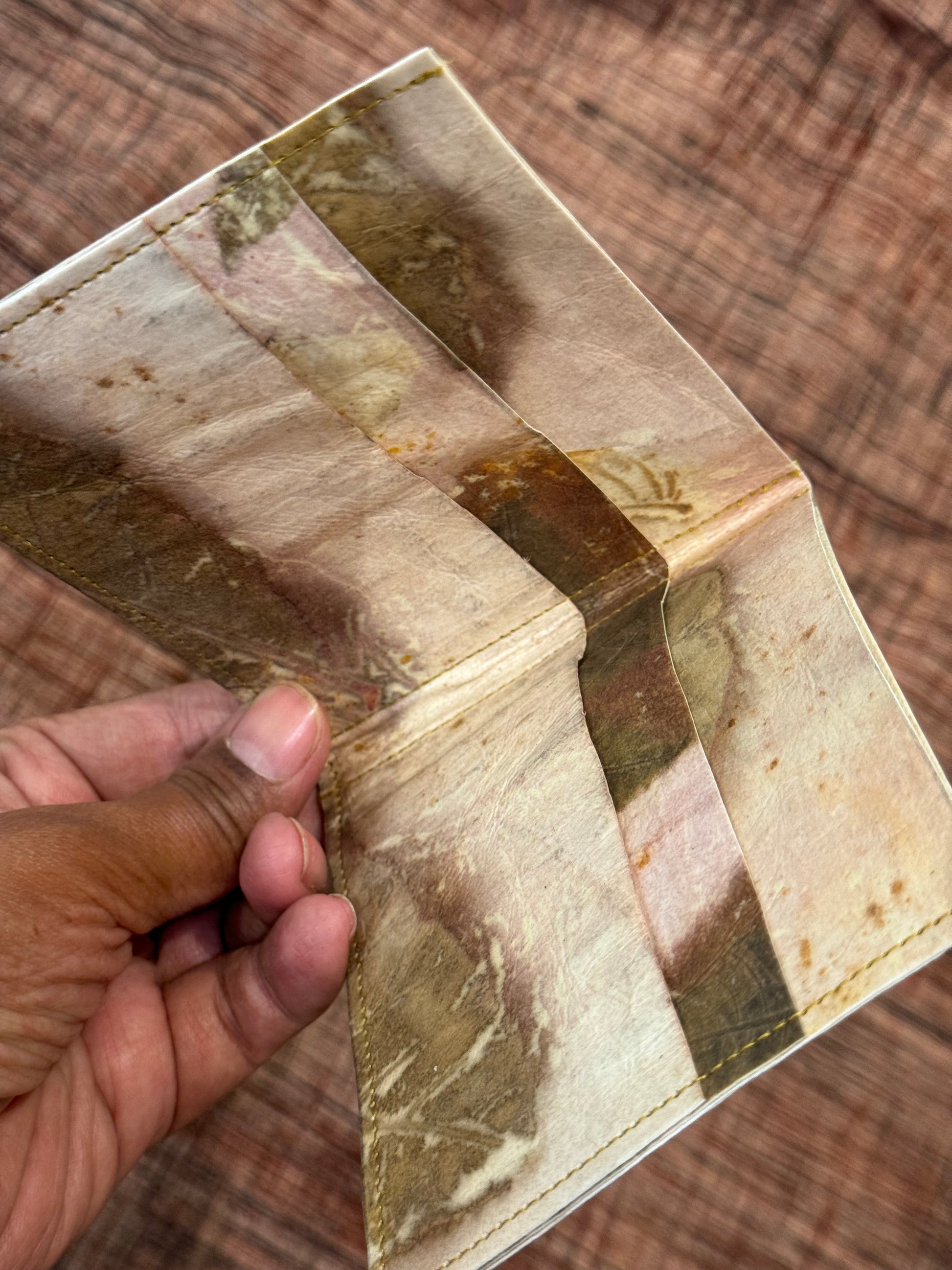 Handcrafted with wood pulp made paper fabric that gives it a feel of leather. Every piece will be different because of the nature of printing. Please WhatsApp us to see the current available prints.