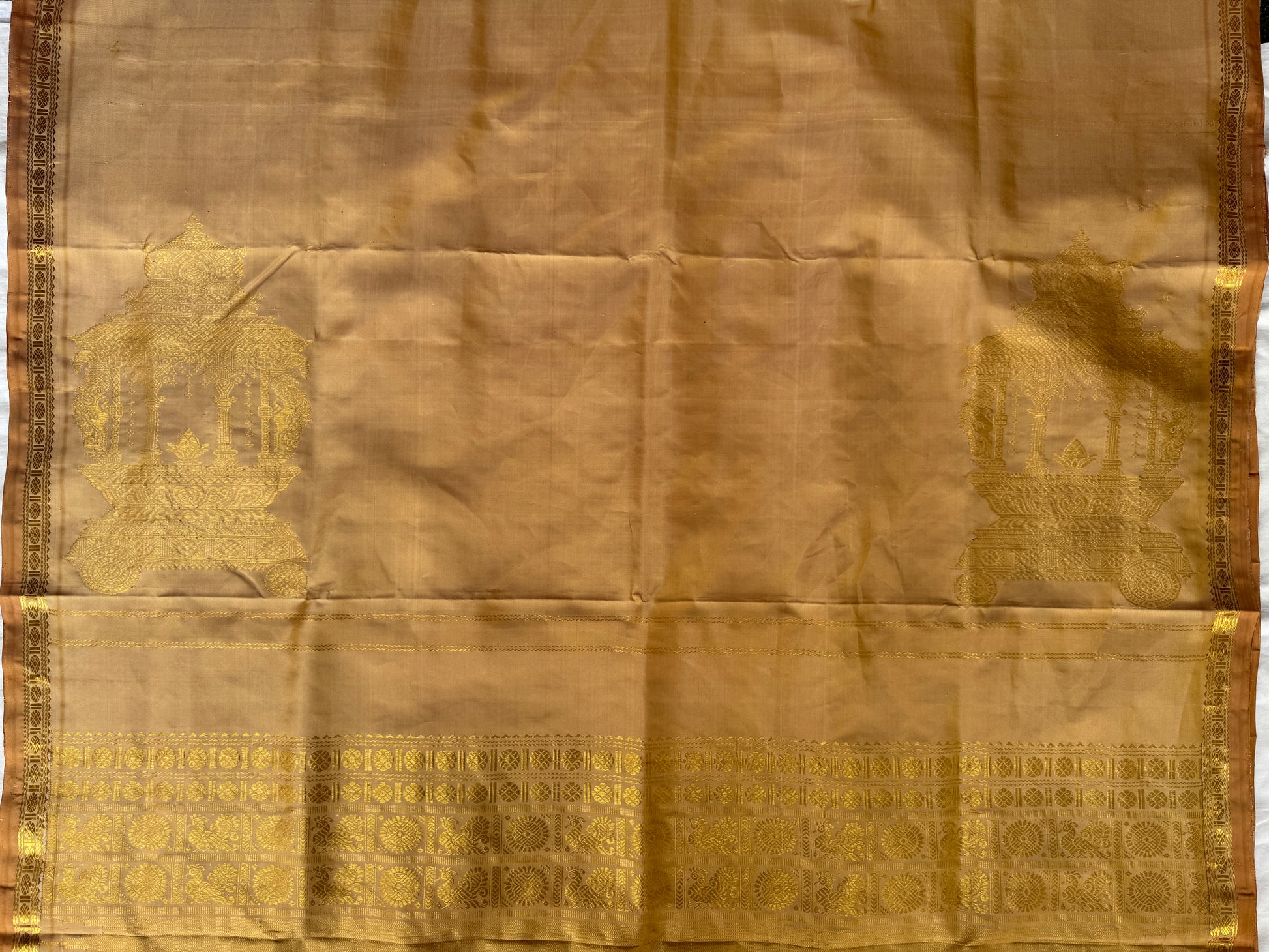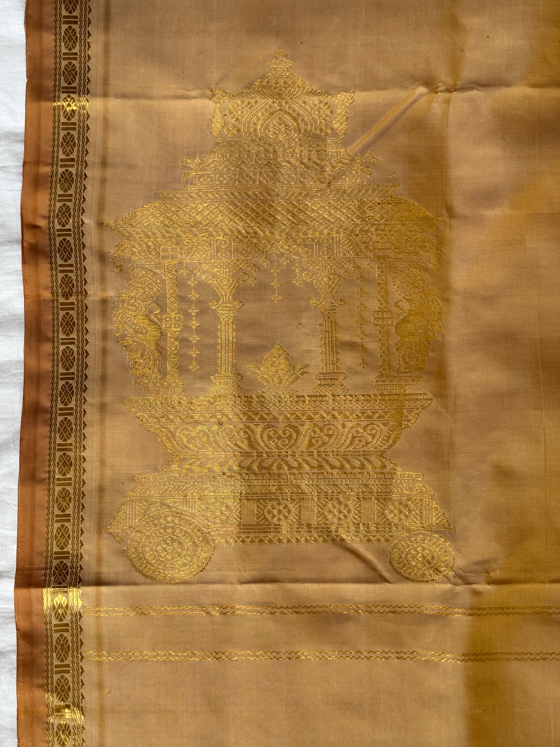 Elegant beige pure silk handloom Kumbakonam pattu saree with rath chariot palla