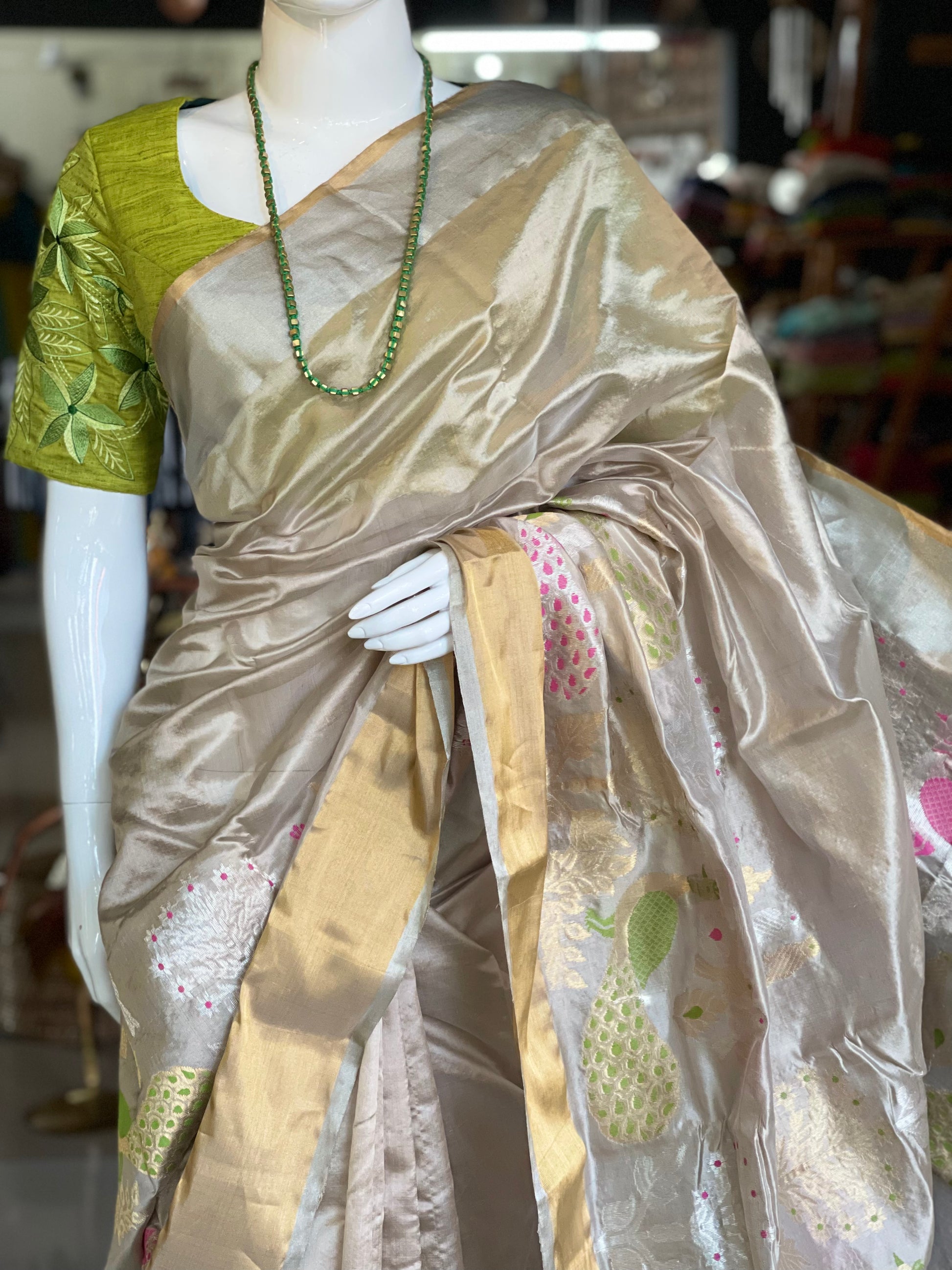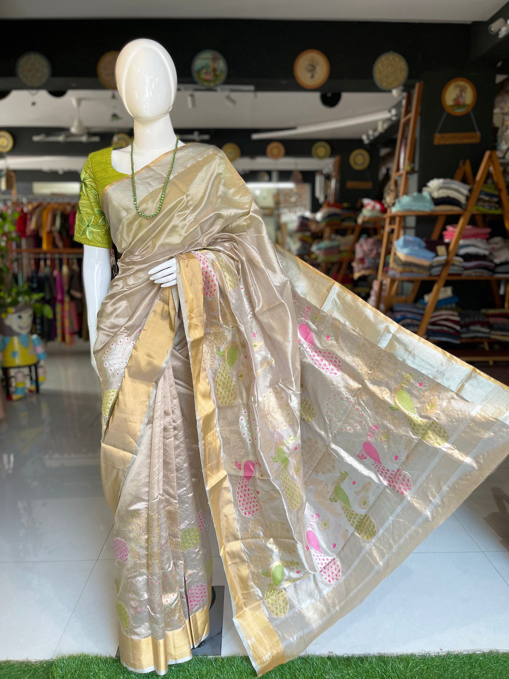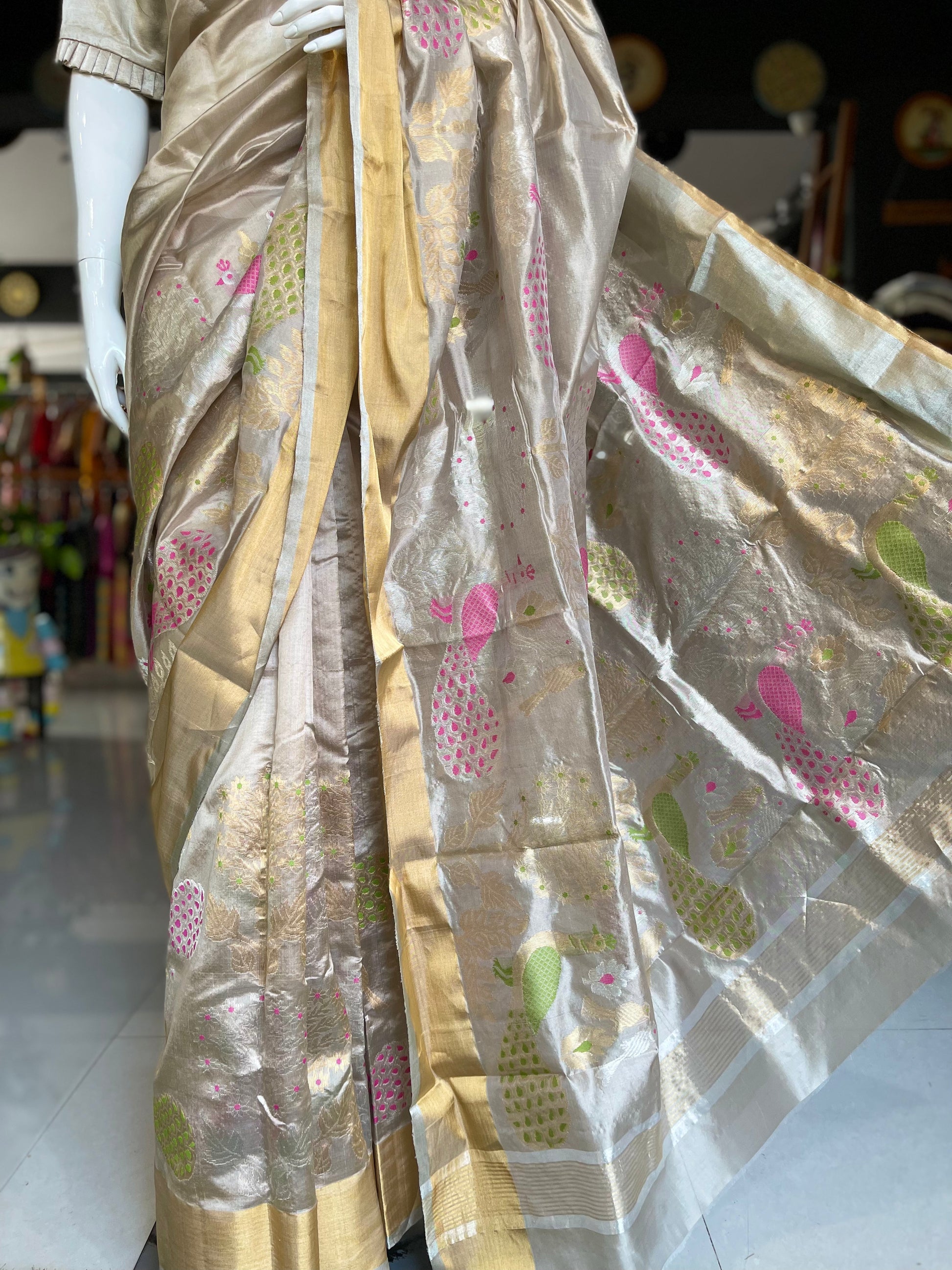 Elegant gold Chanderi pure silk handwoven peacock motif skirt border grand saree