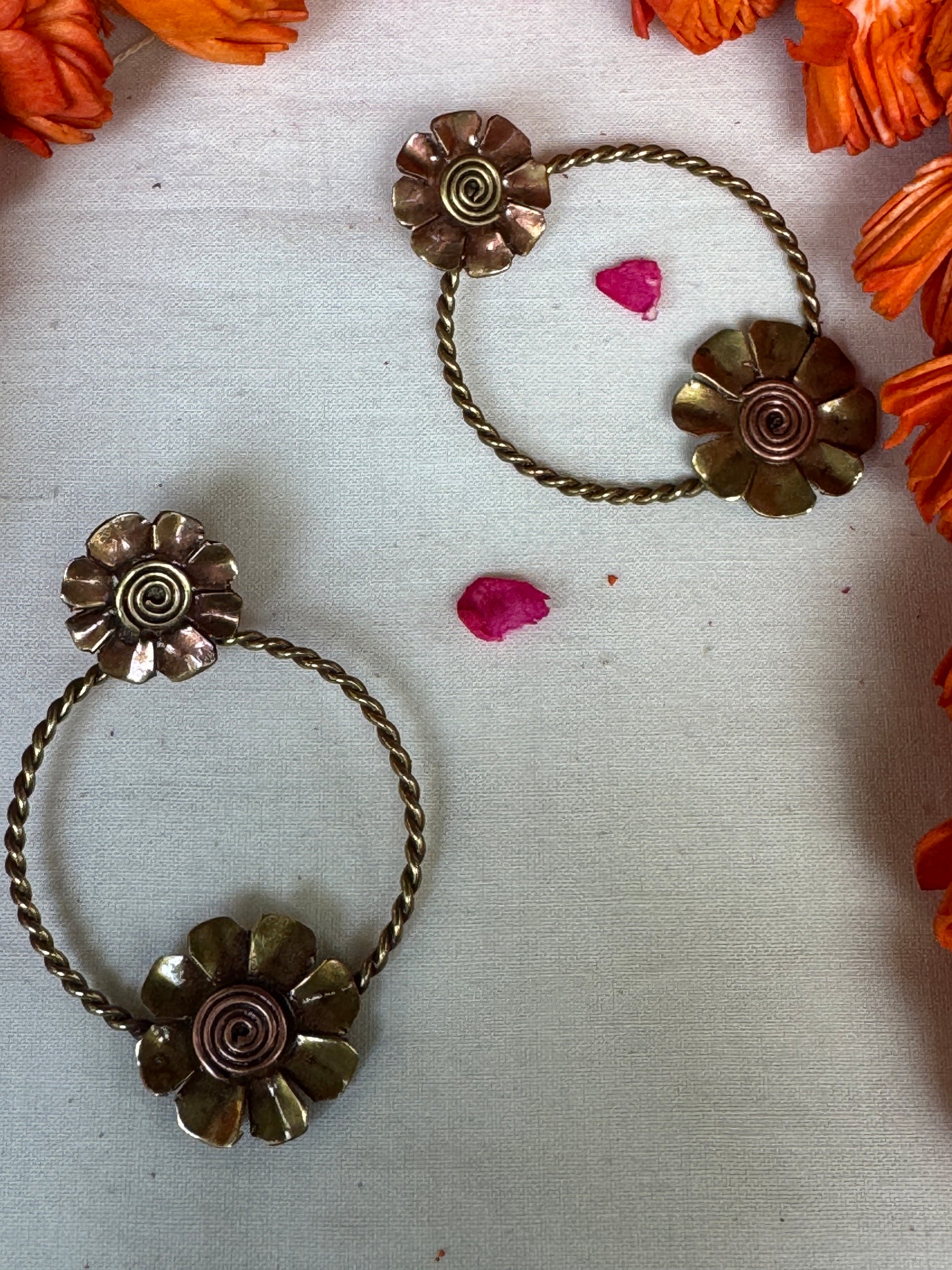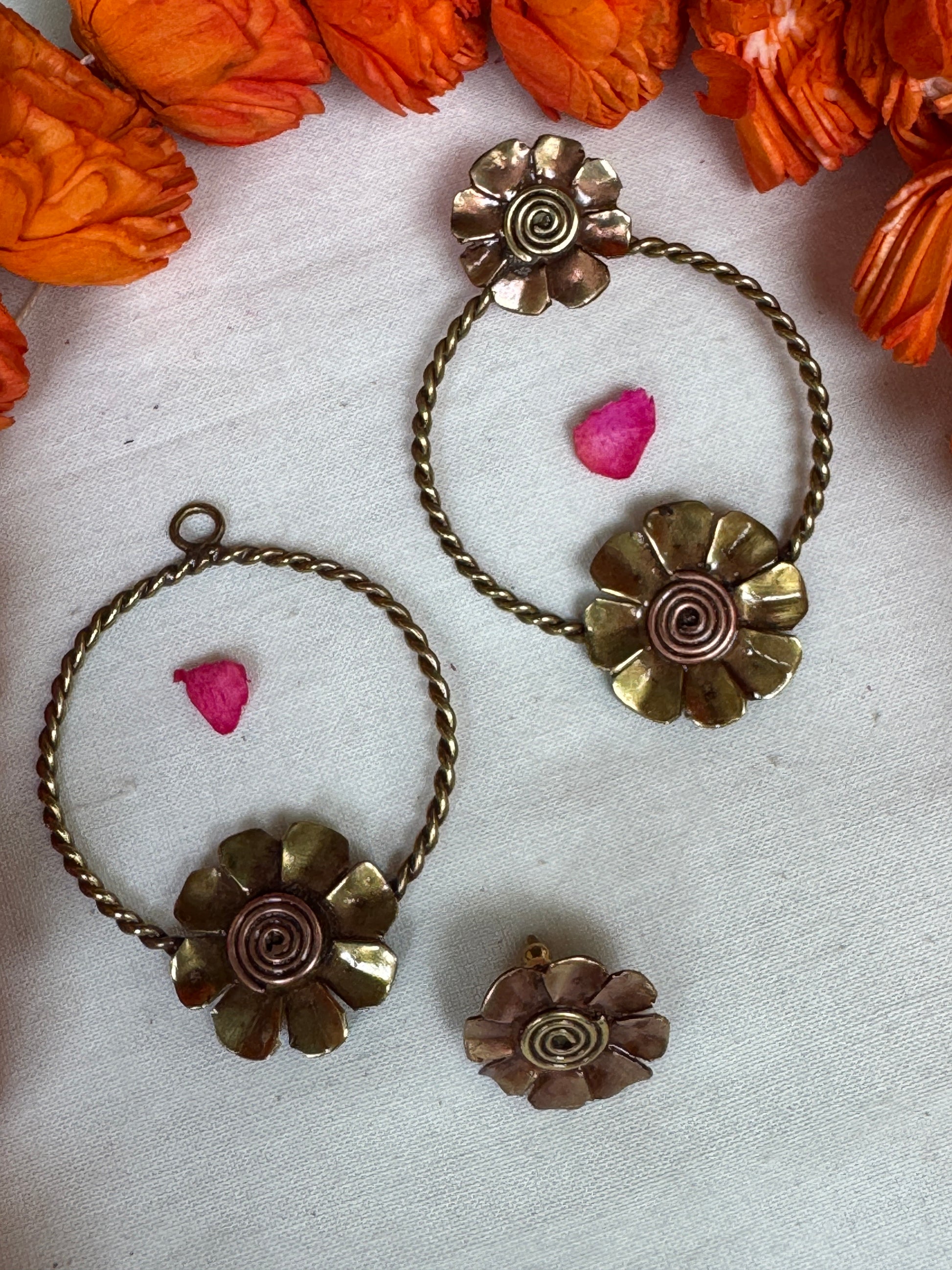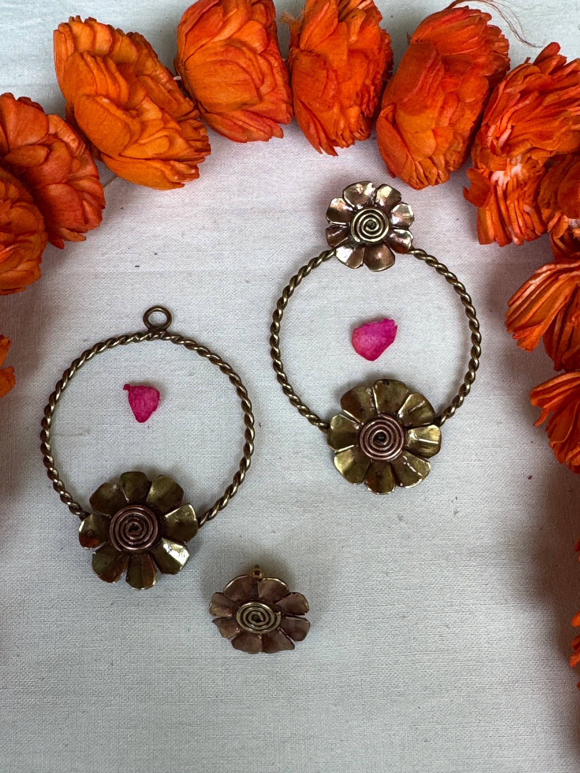 Flower stud with attachable circle flower drop - designer earrings made of copper and brass