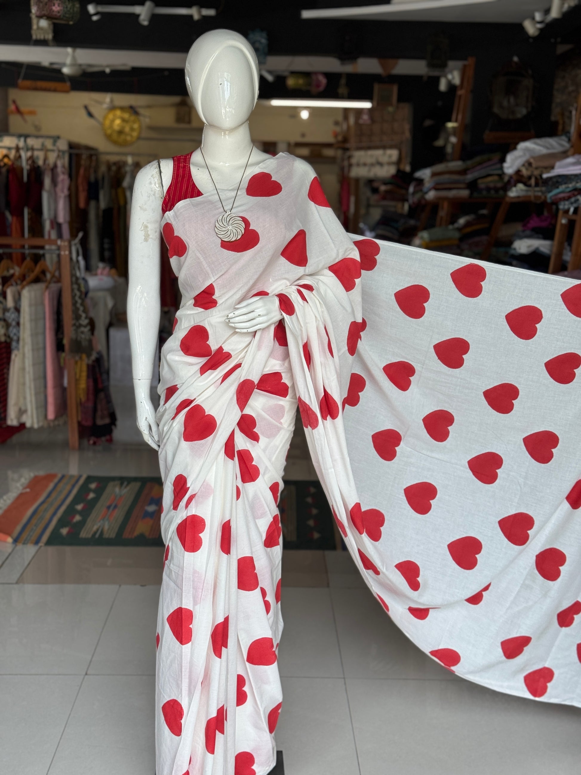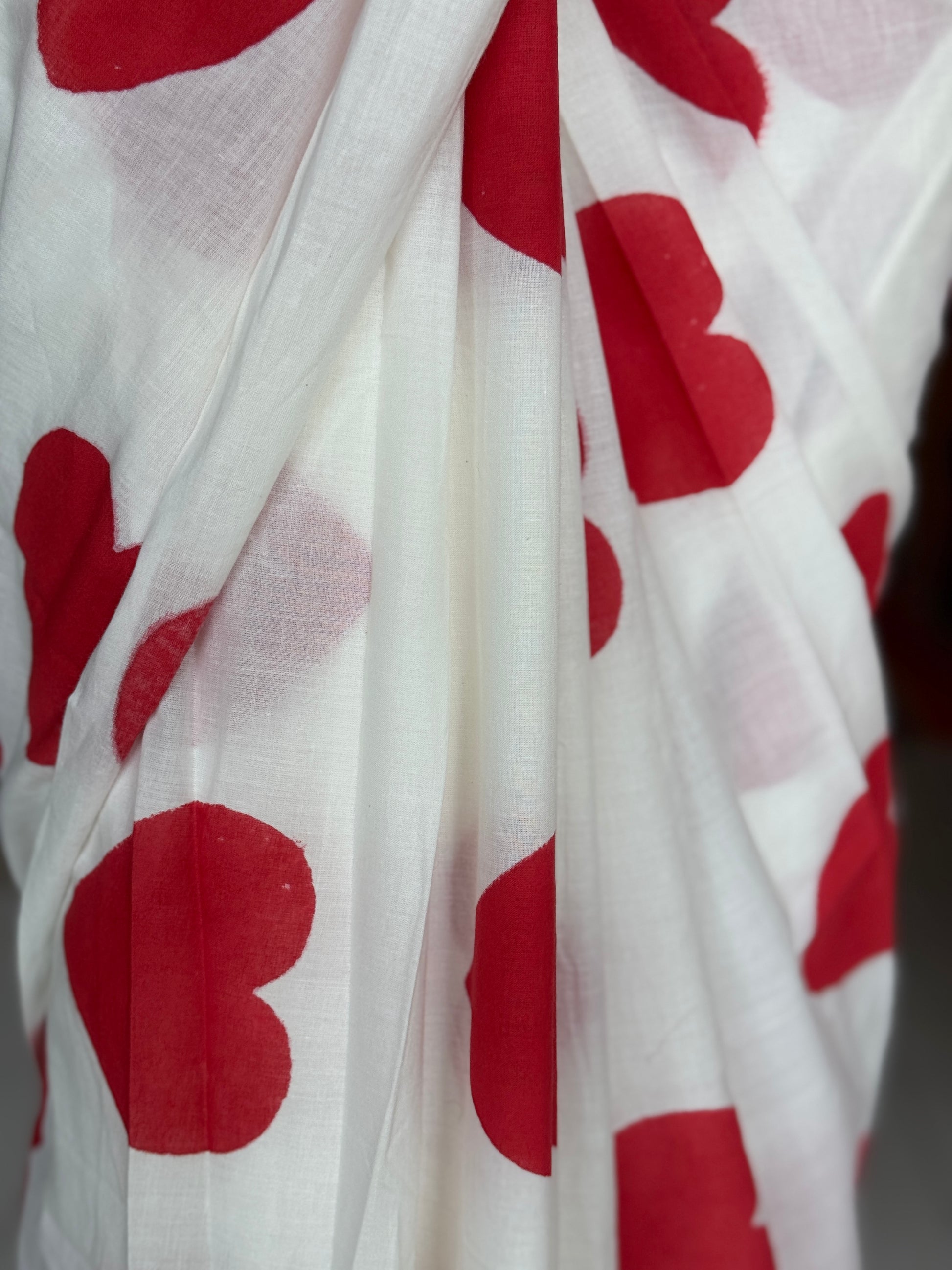 Flying hearts - red on white hand block printed soft cotton yardage saree