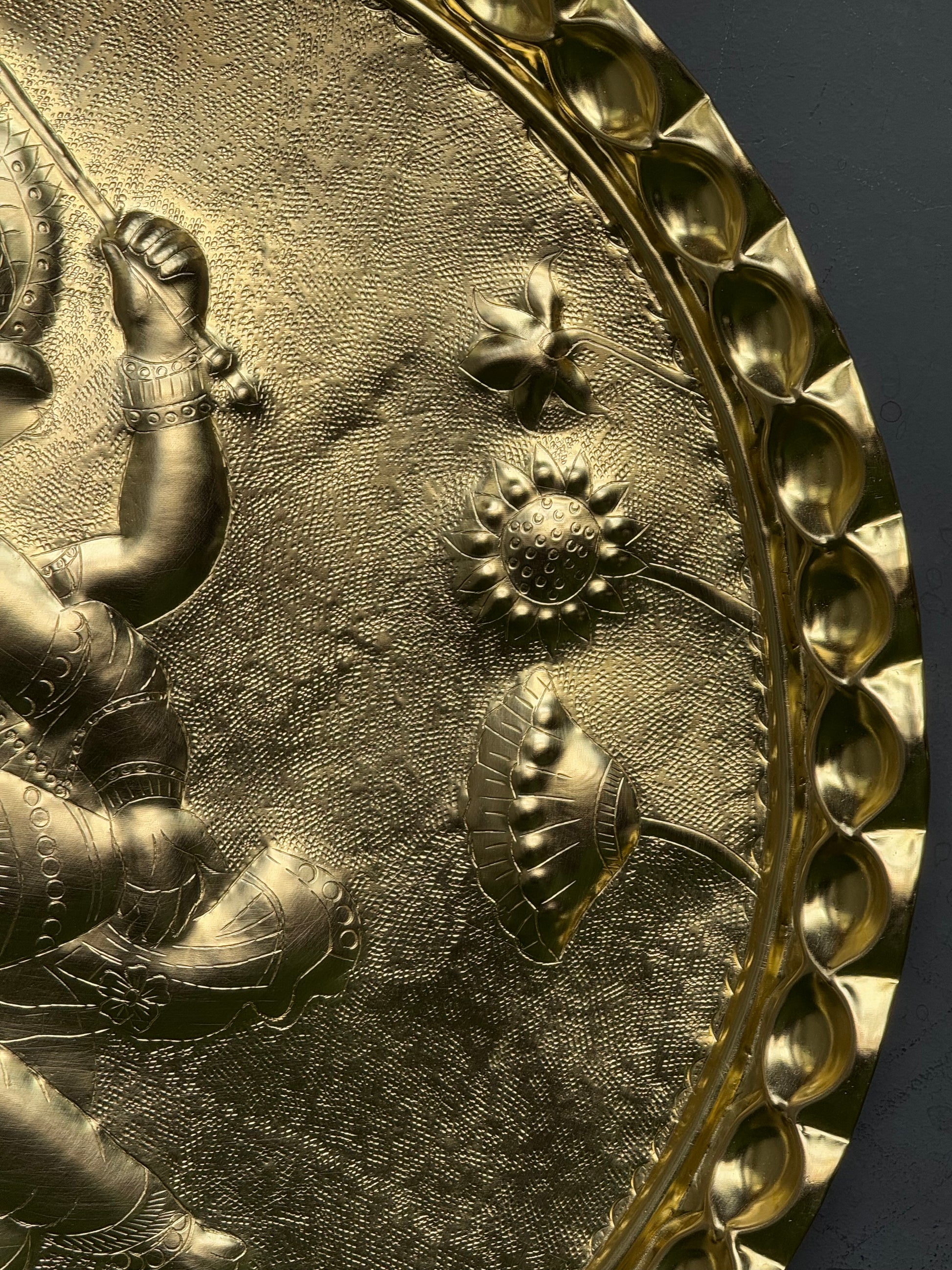 Ganesha in dancing pose - Brass handcrafted round wall plate - traditional embossed Chamba thaal