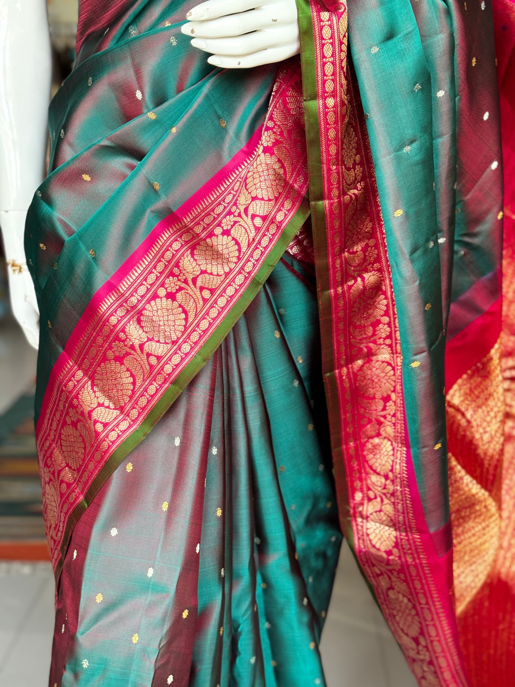 Green and pink dual tone pure silk twill weave handwoven Gadwal saree