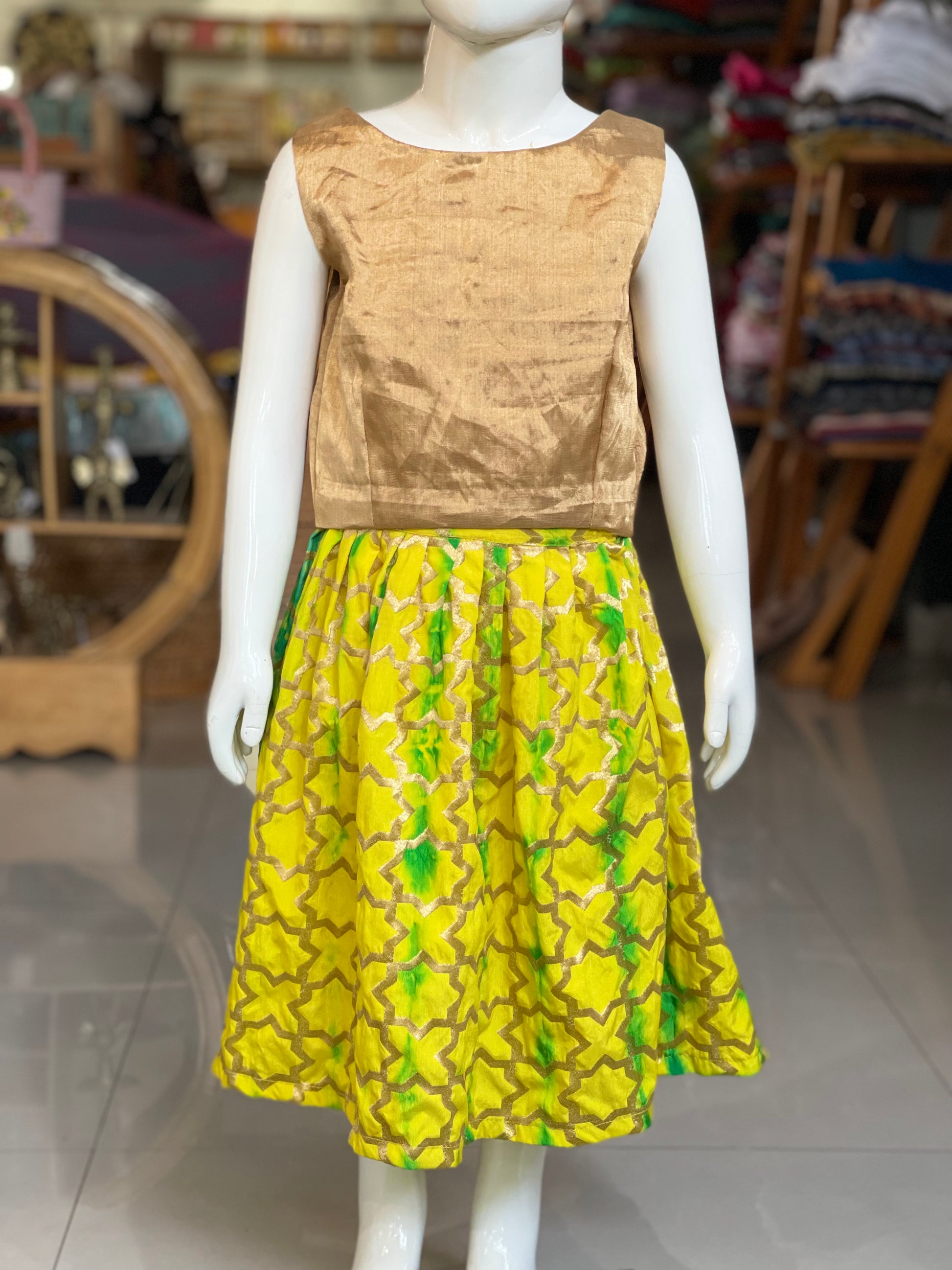 Green and yellow banaras skirt / lehenga, handloom gold silk tissue top for girls