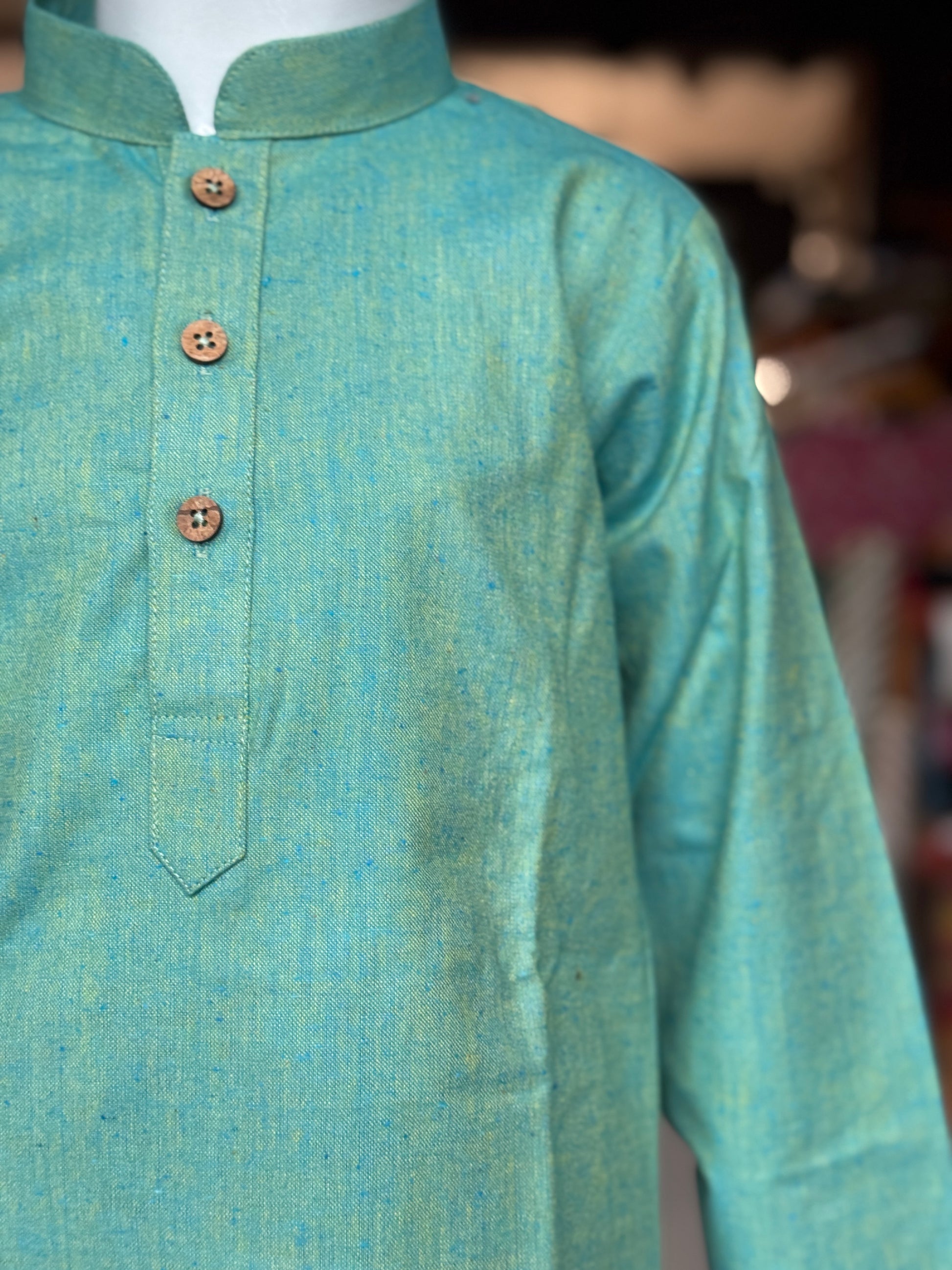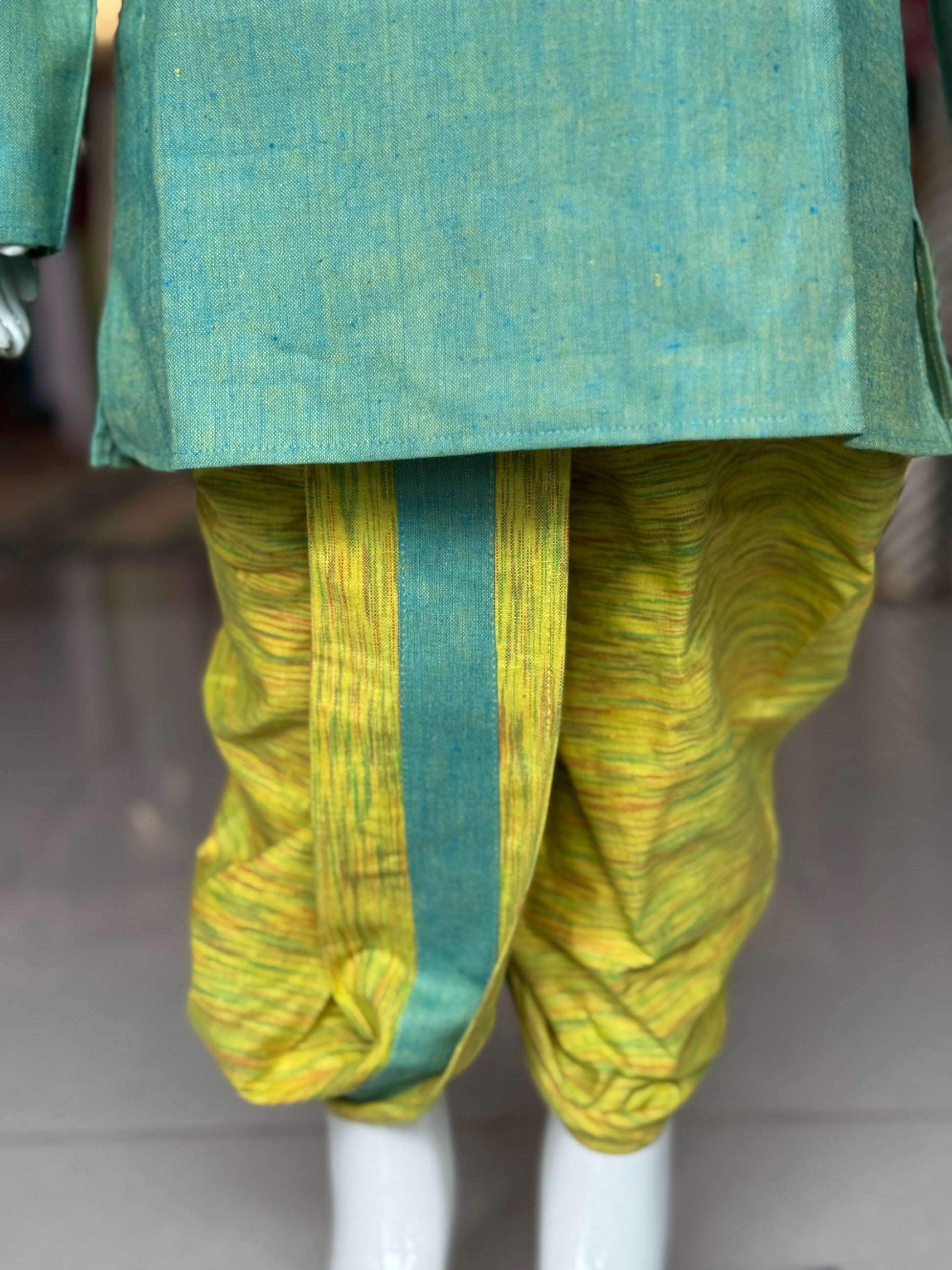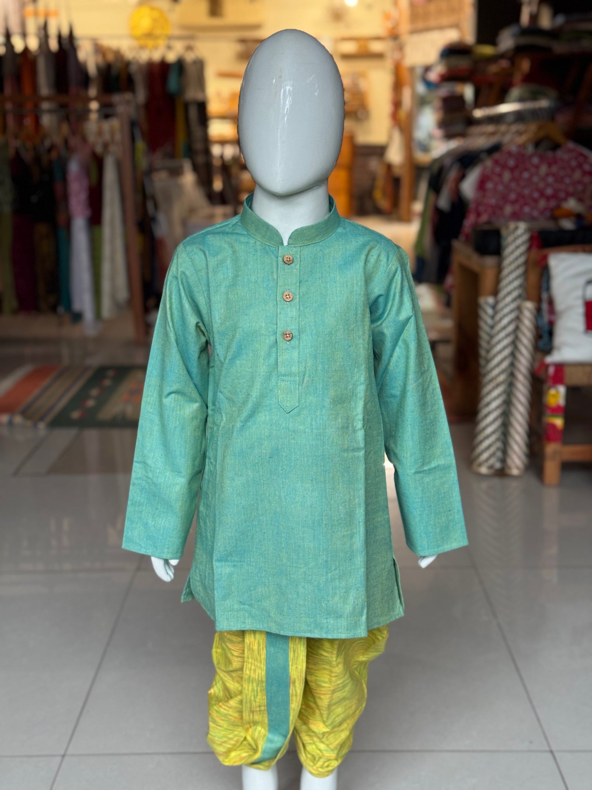 Green and yellow hand spun hand woven cotton kurta, dhoti - 2 piece cotton ethnic set for boys