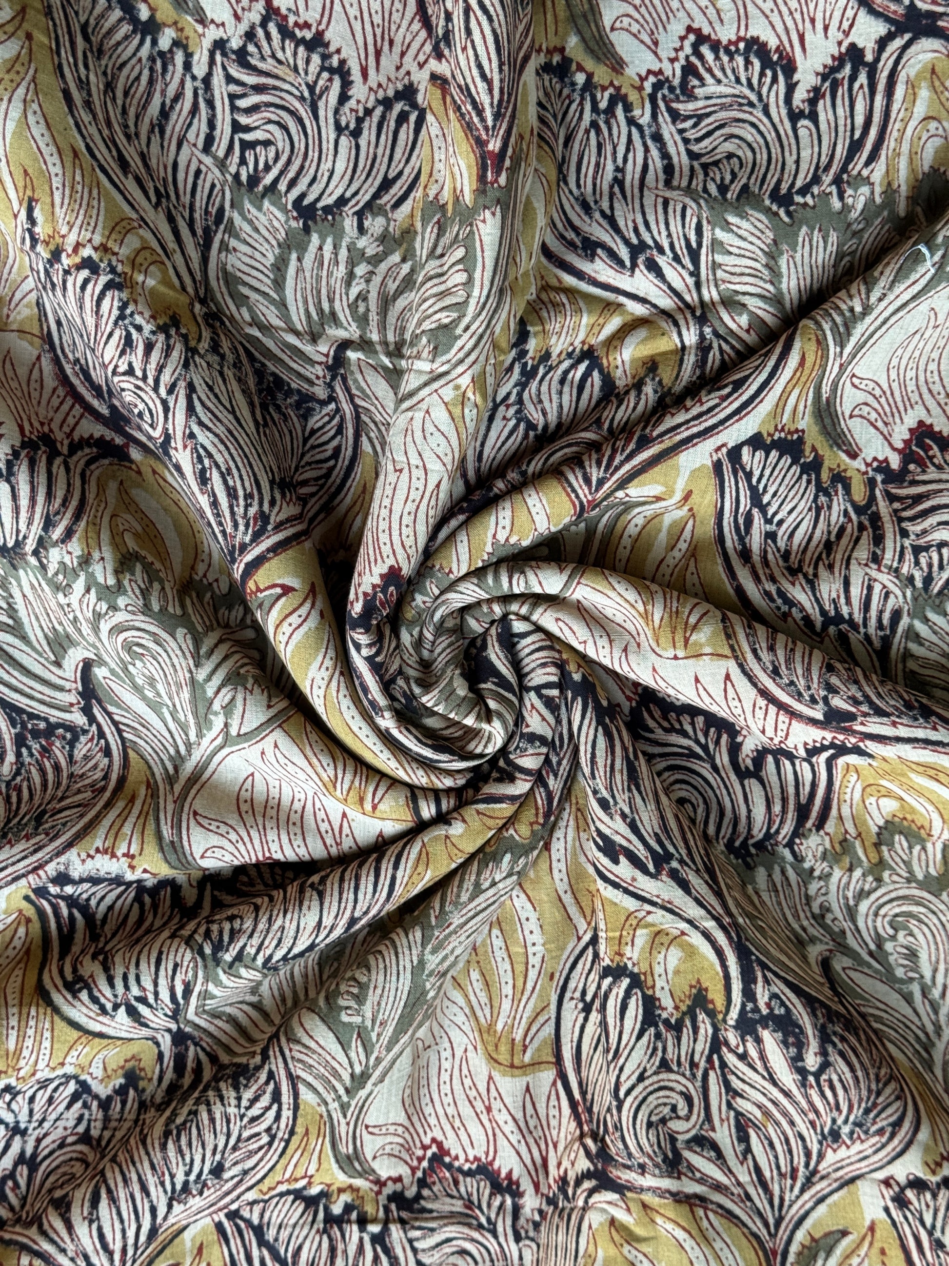 Green, black, beige wild flowers pattern hand block printed natural dyed Kalamkari cotton fabric