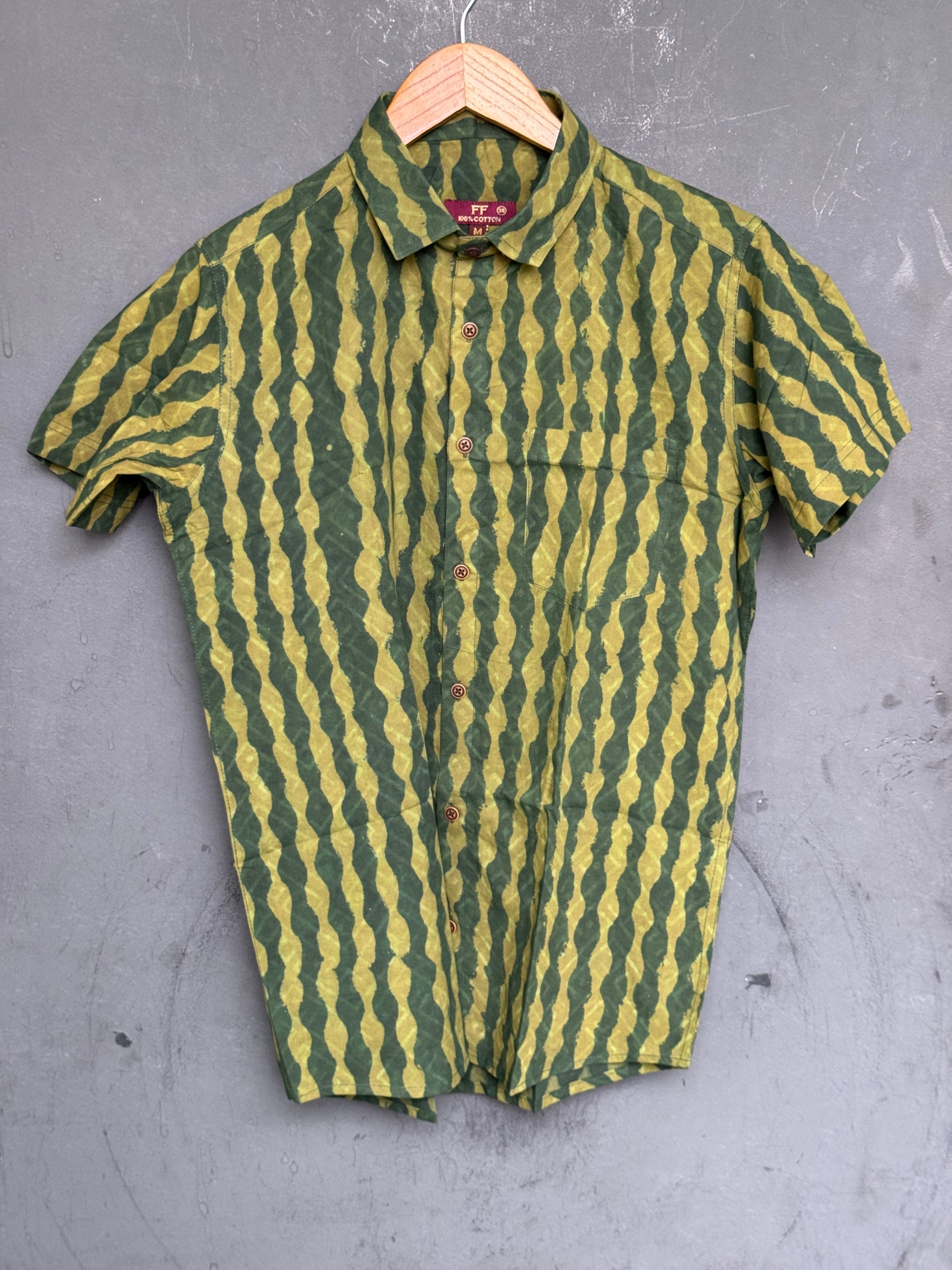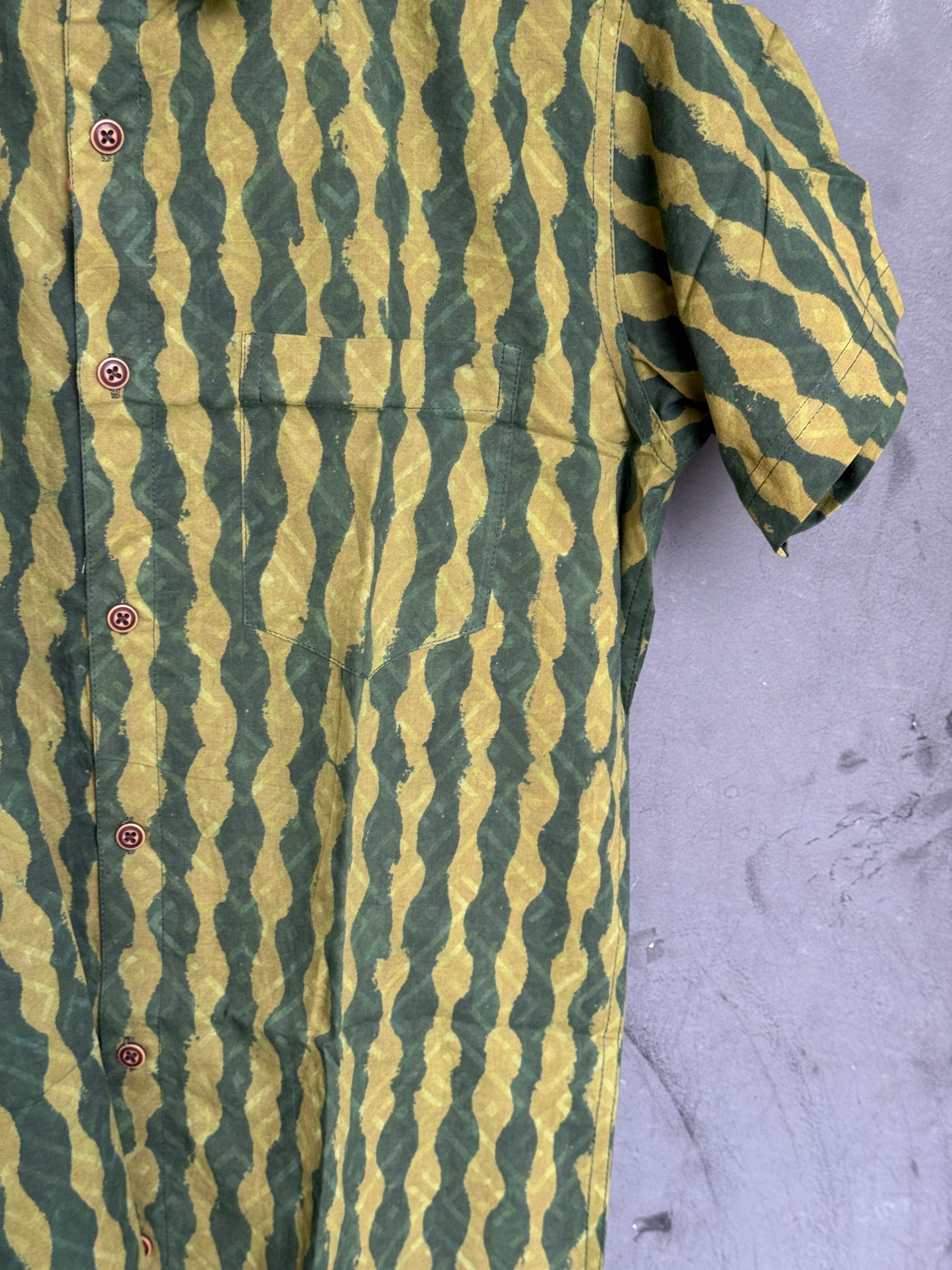 Green curvy stripes half sleeves mens hand block printed cotton shirt