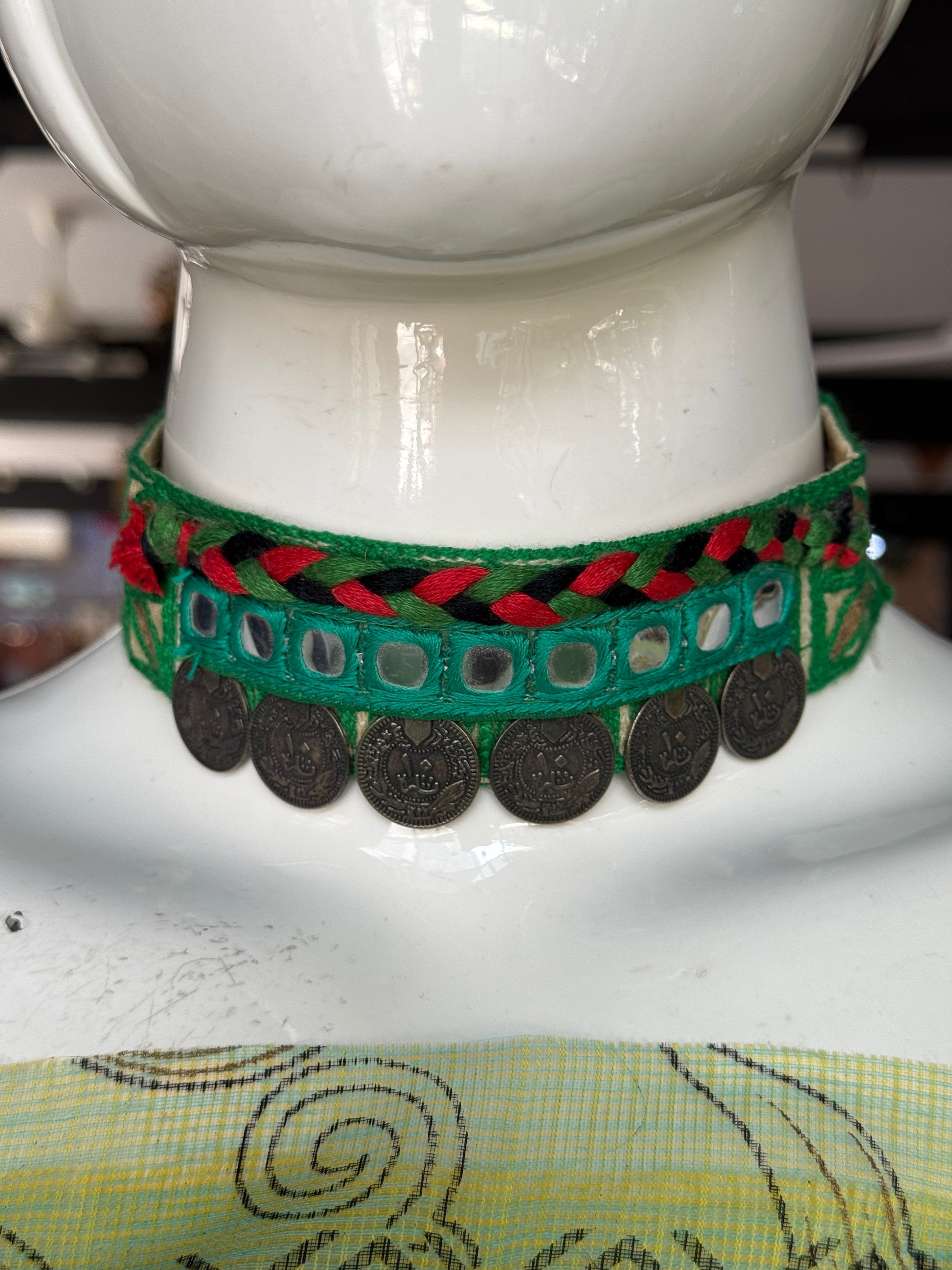 Green handcrafted choker neckpiece with mirrors embroidery and oxidized silver coins