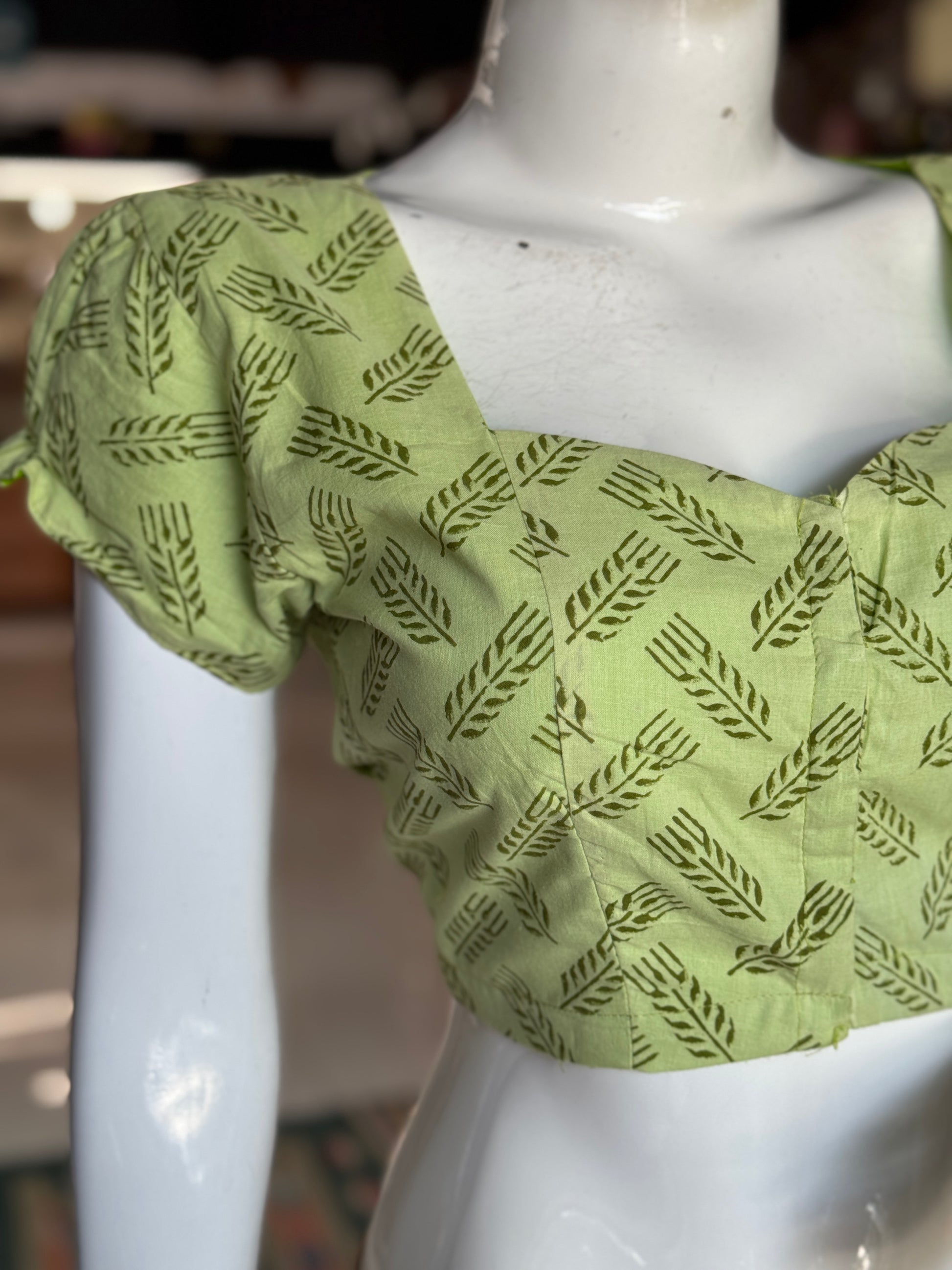 Green leaves handblock printed cotton front open blouse