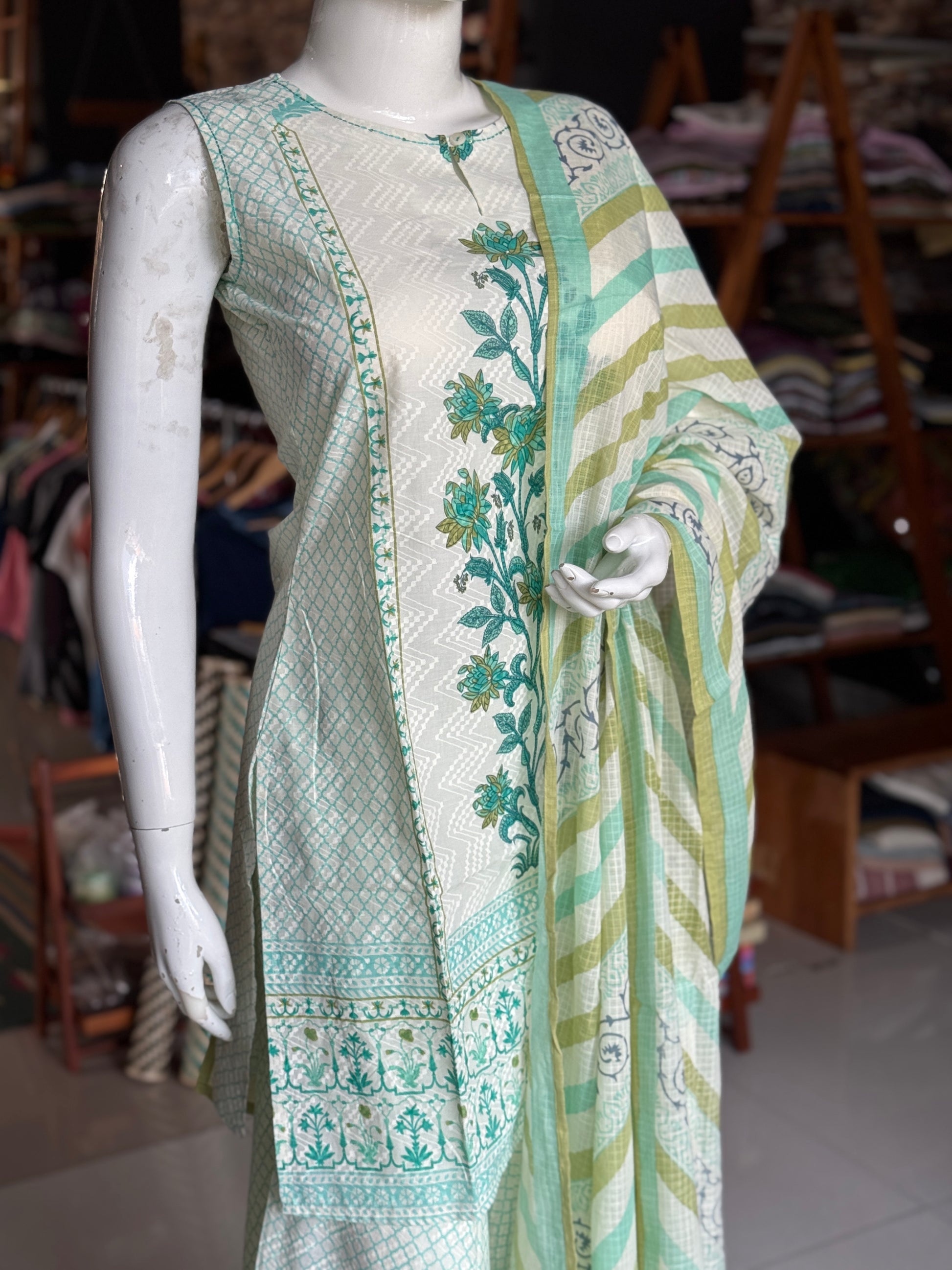 Green n white cotton short kurti, sharara pants and dupatta - 3 piece hand block printed set
