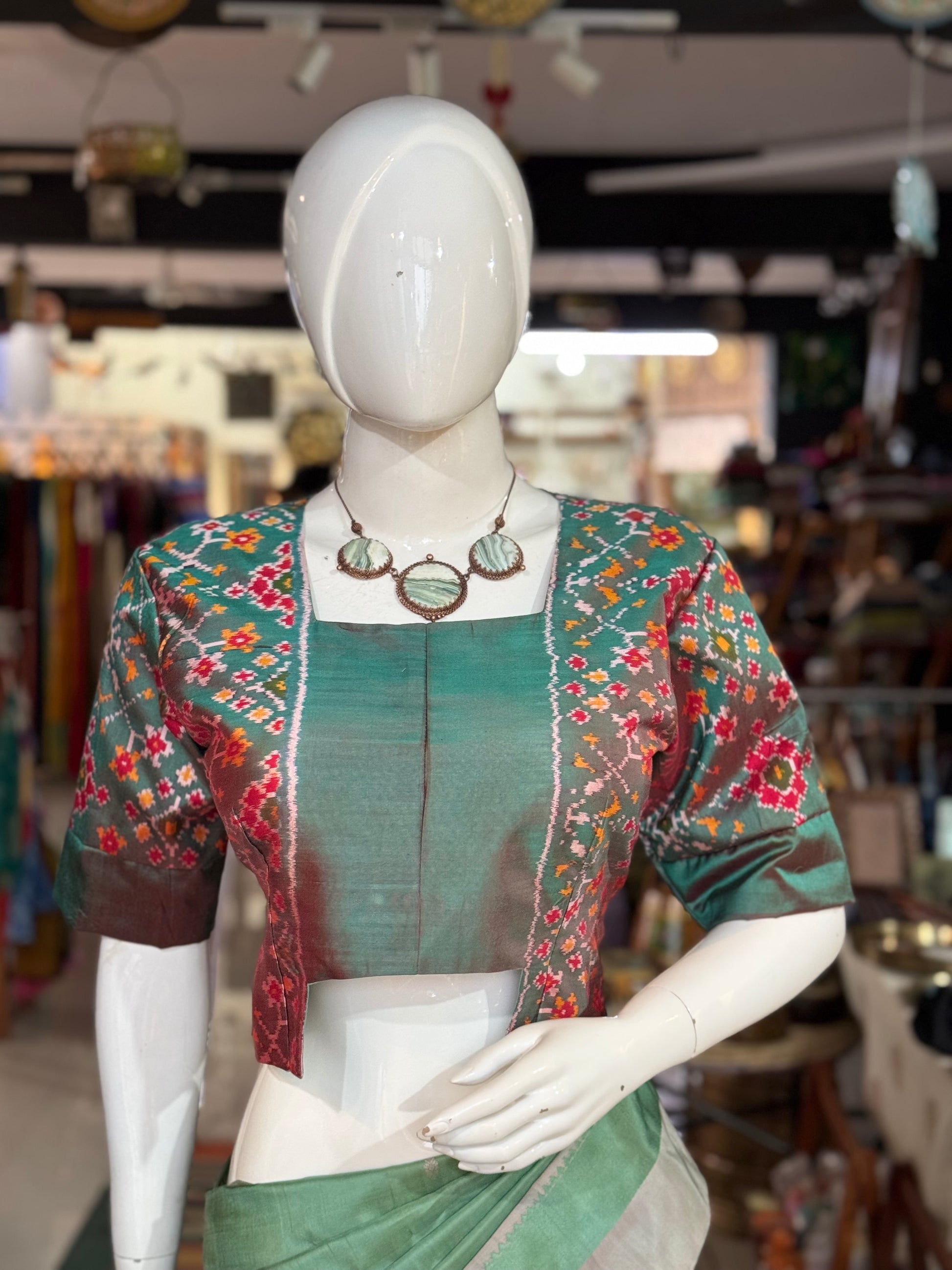 Green pure silk Ikat handloom elbow sleeves crop top / blouse