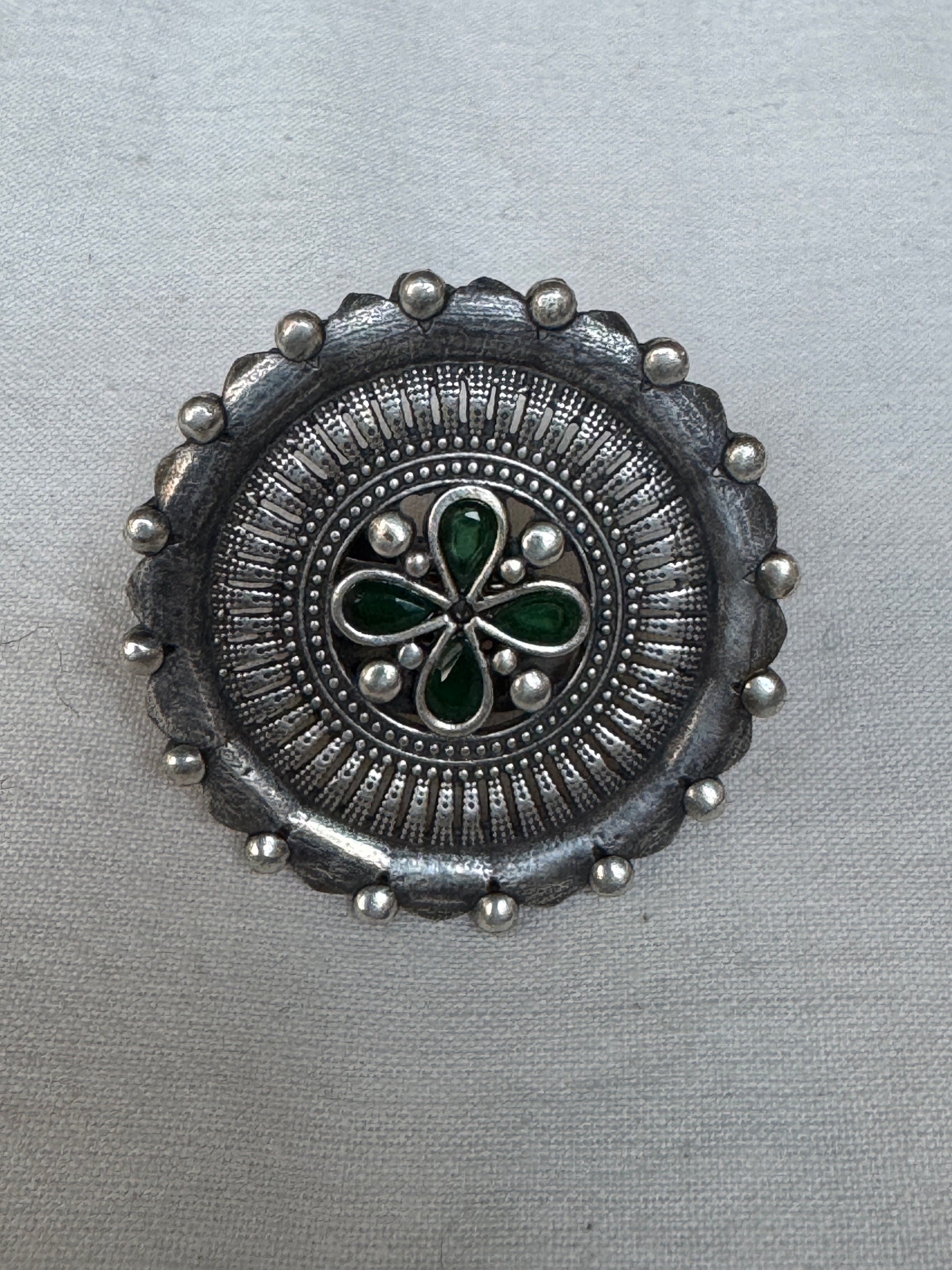 Green stones in the center - oversized brass finger ring with silver finish