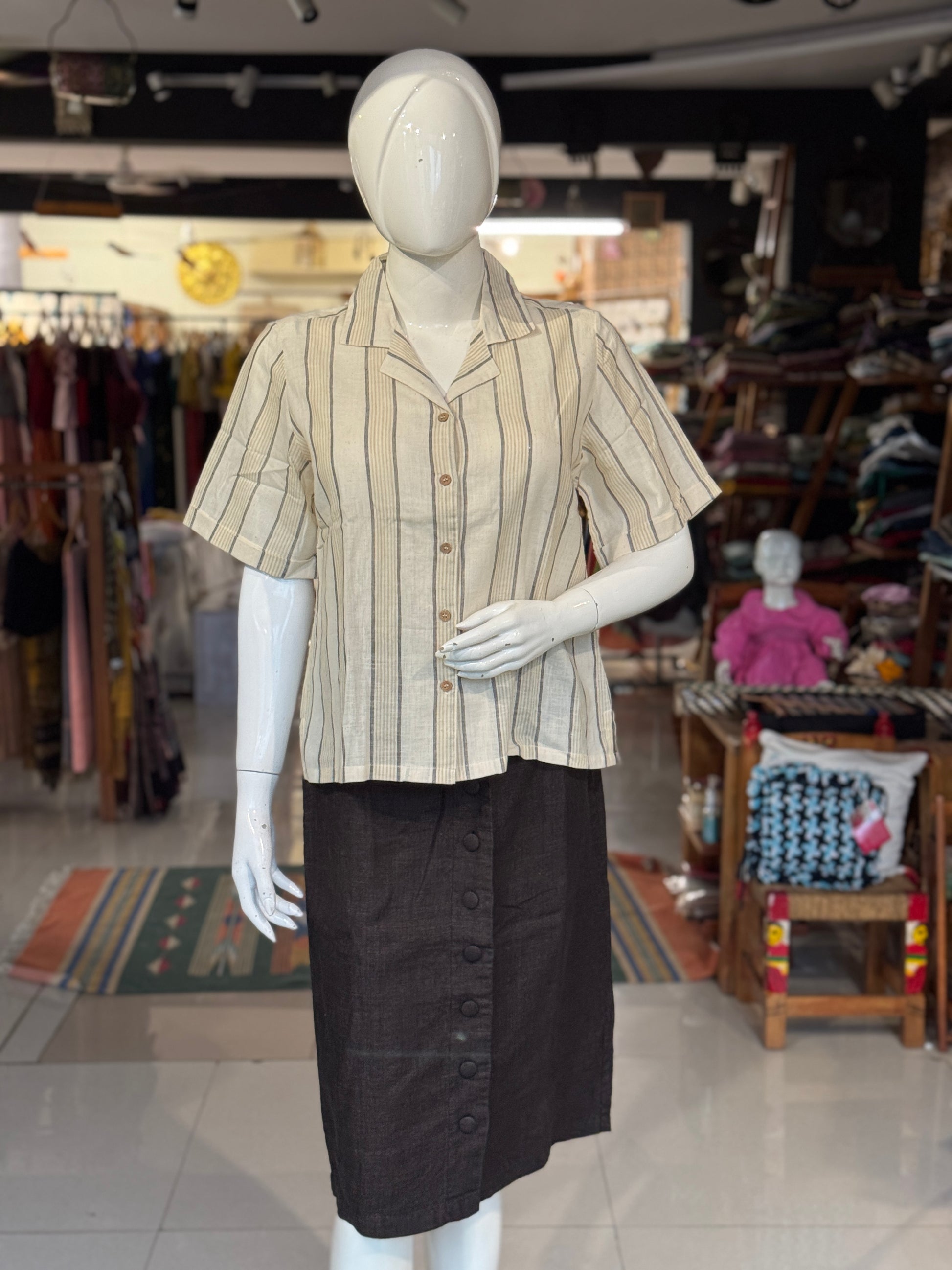 Grey Beige stripes on cream soft handwoven cotton collared shirt for women