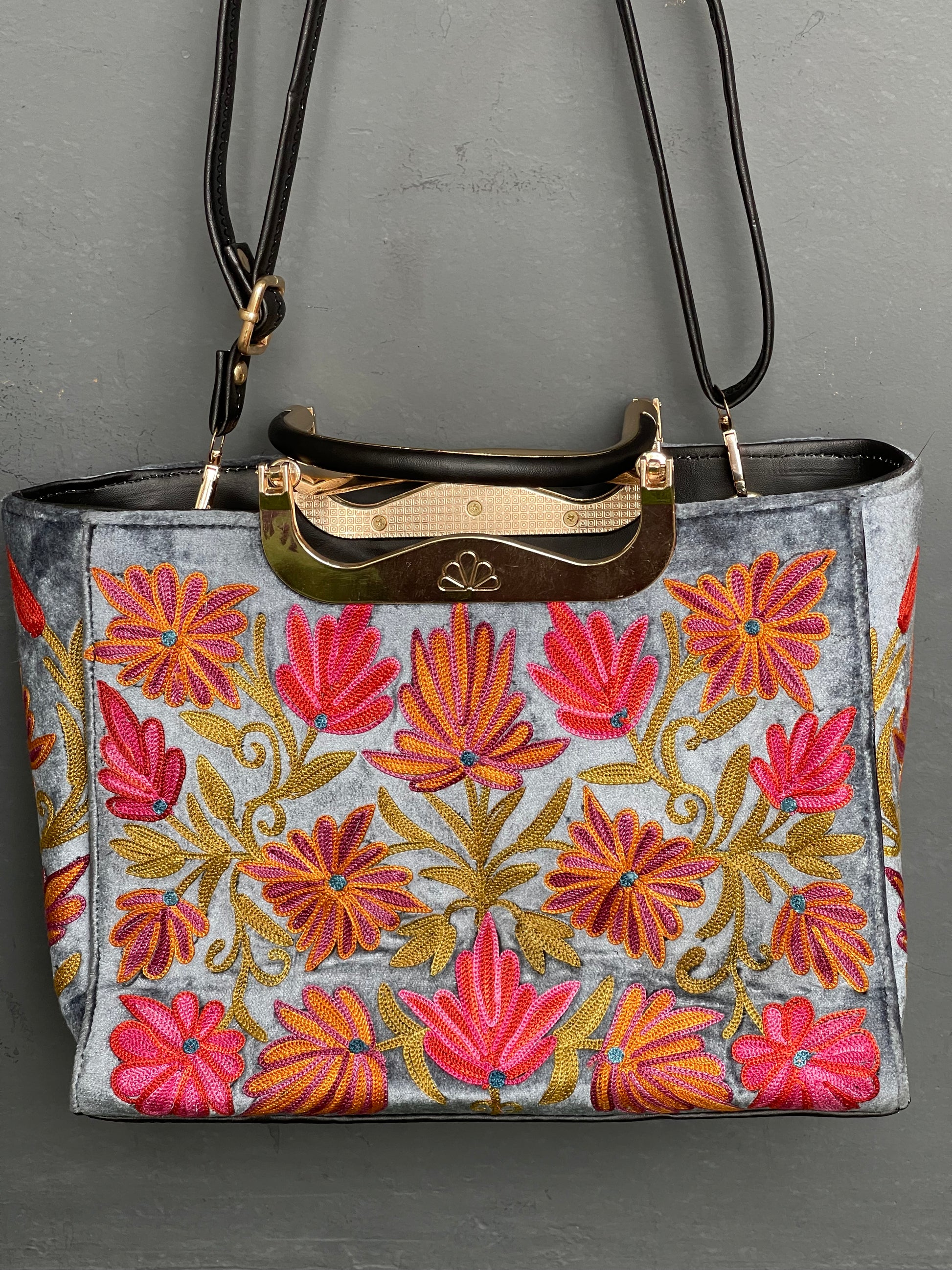 Greyish blue Kashmiri embroidered hand bag with short and adjustable long handles